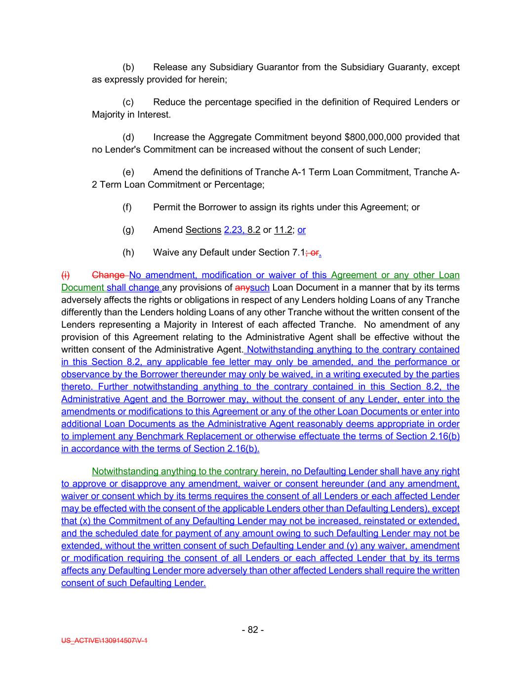 - 82 - US_ACTIVE\130914507\V-1 (b) Release any Subsidiary Guarantor from the Subsidiary Guaranty, except as expressly provided for herein; (c) Reduce the percentage specified in the definition of Required Lenders or Majority in Interest. (d) Increase the Aggregate Commitment beyond $800,000,000 provided that no Lender's Commitment can be increased without the consent of such Lender; (e) Amend the definitions of Tranche A-1 Term Loan Commitment, Tranche A- 2 Term Loan Commitment or Percentage; (f) Permit the Borrower to assign its rights under this Agreement; or (g) Amend Sections 2.23, 8.2 or 11.2; or (h) Waive any Default under Section 7.1; or. (i) Change No amendment, modification or waiver of this Agreement or any other Loan Document shall change any provisions of anysuch Loan Document in a manner that by its terms adversely affects the rights or obligations in respect of any Lenders holding Loans of any Tranche differently than the Lenders holding Loans of any other Tranche without the written consent of the Lenders representing a Majority in Interest of each affected Tranche. No amendment of any provision of this Agreement relating to the Administrative Agent shall be effective without the written consent of the Administrative Agent. Notwithstanding anything to the contrary contained in this Section 8.2, any applicable fee letter may only be amended, and the performance or observance by the Borrower thereunder may only be waived, in a writing executed by the parties thereto. Further notwithstanding anything to the contrary contained in this Section 8.2, the Administrative Agent and the Borrower may, without the consent of any Lender, enter into the amendments or modifications to this Agreement or any of the other Loan Documents or enter into additional Loan Documents as the Administrative Agent reasonably deems appropriate in order to implement any Benchmark Replacement or otherwise effectuate the terms of Section 2.16(b) in accordance with the terms of Section 2.16(b). Notwithstanding anything to the contrary herein, no Defaulting Lender shall have any right to approve or disapprove any amendment, waiver or consent hereunder (and any amendment, waiver or consent which by its terms requires the consent of all Lenders or each affected Lender may be effected with the consent of the applicable Lenders other than Defaulting Lenders), except that (x) the Commitment of any Defaulting Lender may not be increased, reinstated or extended, and the scheduled date for payment of any amount owing to such Defaulting Lender may not be extended, without the written consent of such Defaulting Lender and (y) any waiver, amendment or modification requiring the consent of all Lenders or each affected Lender that by its terms affects any Defaulting Lender more adversely than other affected Lenders shall require the written consent of such Defaulting Lender.