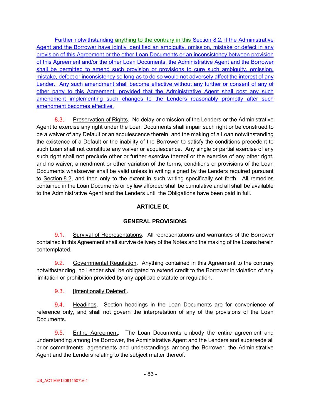 - 83 - US_ACTIVE\130914507\V-1 Further notwithstanding anything to the contrary in this Section 8.2, if the Administrative Agent and the Borrower have jointly identified an ambiguity, omission, mistake or defect in any provision of this Agreement or the other Loan Documents or an inconsistency between provision of this Agreement and/or the other Loan Documents, the Administrative Agent and the Borrower shall be permitted to amend such provision or provisions to cure such ambiguity, omission, mistake, defect or inconsistency so long as to do so would not adversely affect the interest of any Lender. Any such amendment shall become effective without any further or consent of any of other party to this Agreement; provided that the Administrative Agent shall post any such amendment implementing such changes to the Lenders reasonably promptly after such amendment becomes effective. Preservation of Rights. No delay or omission of the Lenders or the Administrative Agent to exercise any right under the Loan Documents shall impair such right or be construed to be a waiver of any Default or an acquiescence therein, and the making of a Loan notwithstanding the existence of a Default or the inability of the Borrower to satisfy the conditions precedent to such Loan shall not constitute any waiver or acquiescence. Any single or partial exercise of any such right shall not preclude other or further exercise thereof or the exercise of any other right, and no waiver, amendment or other variation of the terms, conditions or provisions of the Loan Documents whatsoever shall be valid unless in writing signed by the Lenders required pursuant to Section 8.2, and then only to the extent in such writing specifically set forth. All remedies contained in the Loan Documents or by law afforded shall be cumulative and all shall be available to the Administrative Agent and the Lenders until the Obligations have been paid in full. ARTICLE IX. GENERAL PROVISIONS Survival of Representations. All representations and warranties of the Borrower contained in this Agreement shall survive delivery of the Notes and the making of the Loans herein contemplated. Governmental Regulation. Anything contained in this Agreement to the contrary notwithstanding, no Lender shall be obligated to extend credit to the Borrower in violation of any limitation or prohibition provided by any applicable statute or regulation. [Intentionally Deleted]. Headings. Section headings in the Loan Documents are for convenience of reference only, and shall not govern the interpretation of any of the provisions of the Loan Documents. Entire Agreement. The Loan Documents embody the entire agreement and understanding among the Borrower, the Administrative Agent and the Lenders and supersede all prior commitments, agreements and understandings among the Borrower, the Administrative Agent and the Lenders relating to the subject matter thereof.