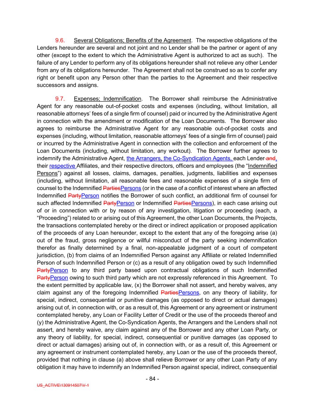 - 84 - US_ACTIVE\130914507\V-1 Several Obligations; Benefits of the Agreement. The respective obligations of the Lenders hereunder are several and not joint and no Lender shall be the partner or agent of any other (except to the extent to which the Administrative Agent is authorized to act as such). The failure of any Lender to perform any of its obligations hereunder shall not relieve any other Lender from any of its obligations hereunder. The Agreement shall not be construed so as to confer any right or benefit upon any Person other than the parties to the Agreement and their respective successors and assigns. Expenses; Indemnification. The Borrower shall reimburse the Administrative Agent for any reasonable out-of-pocket costs and expenses (including, without limitation, all reasonable attorneys’ fees of a single firm of counsel) paid or incurred by the Administrative Agent in connection with the amendment or modification of the Loan Documents. The Borrower also agrees to reimburse the Administrative Agent for any reasonable out-of-pocket costs and expenses (including, without limitation, reasonable attorneys’ fees of a single firm of counsel) paid or incurred by the Administrative Agent in connection with the collection and enforcement of the Loan Documents (including, without limitation, any workout). The Borrower further agrees to indemnify the Administrative Agent, the Arrangers, the Co-Syndication Agents, each Lender and, their respective Affiliates, and their respective directors, officers and employees (the “Indemnified Persons”) against all losses, claims, damages, penalties, judgments, liabilities and expenses (including, without limitation, all reasonable fees and reasonable expenses of a single firm of counsel to the Indemnified PartiesPersons (or in the case of a conflict of interest where an affected Indemnified PartyPerson notifies the Borrower of such conflict, an additional firm of counsel for such affected Indemnified PartyPerson or Indemnified PartiesPersons), in each case arising out of or in connection with or by reason of any investigation, litigation or proceeding (each, a “Proceeding”) related to or arising out of this Agreement, the other Loan Documents, the Projects, the transactions contemplated hereby or the direct or indirect application or proposed application of the proceeds of any Loan hereunder, except to the extent that any of the foregoing arise (a) out of the fraud, gross negligence or willful misconduct of the party seeking indemnification therefor as finally determined by a final, non-appealable judgment of a court of competent jurisdiction, (b) from claims of an Indemnified Person against any Affiliate or related Indemnified Person of such Indemnified Person or (c) as a result of any obligation owed by such Indemnified PartyPerson to any third party based upon contractual obligations of such Indemnified PartyPerson owing to such third party which are not expressly referenced in this Agreement. To the extent permitted by applicable law, (x) the Borrower shall not assert, and hereby waives, any claim against any of the foregoing Indemnified PartiesPersons, on any theory of liability, for special, indirect, consequential or punitive damages (as opposed to direct or actual damages) arising out of, in connection with, or as a result of, this Agreement or any agreement or instrument contemplated hereby, any Loan or Facility Letter of Credit or the use of the proceeds thereof and (y) the Administrative Agent, the Co-Syndication Agents, the Arrangers and the Lenders shall not assert, and hereby waive, any claim against any of the Borrower and any other Loan Party, or any theory of liability, for special, indirect, consequential or punitive damages (as opposed to direct or actual damages) arising out of, in connection with, or as a result of, this Agreement or any agreement or instrument contemplated hereby, any Loan or the use of the proceeds thereof, provided that nothing in clause (a) above shall relieve Borrower or any other Loan Party of any obligation it may have to indemnify an Indemnified Person against special, indirect, consequential