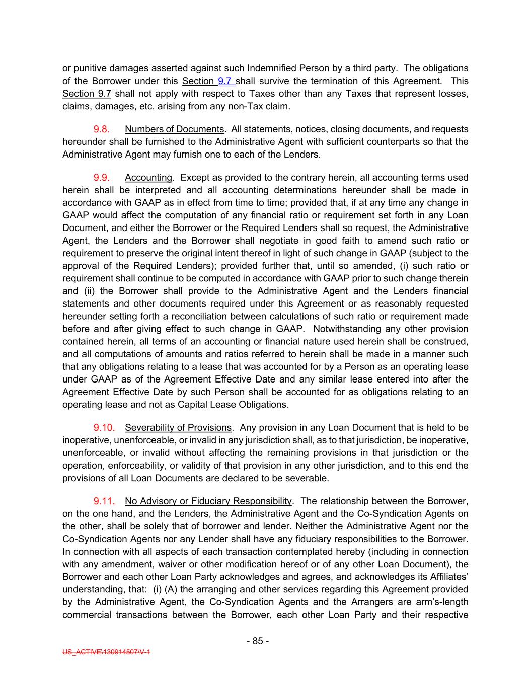 - 85 - US_ACTIVE\130914507\V-1 or punitive damages asserted against such Indemnified Person by a third party. The obligations of the Borrower under this Section 9.7 shall survive the termination of this Agreement. This Section 9.7 shall not apply with respect to Taxes other than any Taxes that represent losses, claims, damages, etc. arising from any non-Tax claim. Numbers of Documents. All statements, notices, closing documents, and requests hereunder shall be furnished to the Administrative Agent with sufficient counterparts so that the Administrative Agent may furnish one to each of the Lenders. Accounting. Except as provided to the contrary herein, all accounting terms used herein shall be interpreted and all accounting determinations hereunder shall be made in accordance with GAAP as in effect from time to time; provided that, if at any time any change in GAAP would affect the computation of any financial ratio or requirement set forth in any Loan Document, and either the Borrower or the Required Lenders shall so request, the Administrative Agent, the Lenders and the Borrower shall negotiate in good faith to amend such ratio or requirement to preserve the original intent thereof in light of such change in GAAP (subject to the approval of the Required Lenders); provided further that, until so amended, (i) such ratio or requirement shall continue to be computed in accordance with GAAP prior to such change therein and (ii) the Borrower shall provide to the Administrative Agent and the Lenders financial statements and other documents required under this Agreement or as reasonably requested hereunder setting forth a reconciliation between calculations of such ratio or requirement made before and after giving effect to such change in GAAP. Notwithstanding any other provision contained herein, all terms of an accounting or financial nature used herein shall be construed, and all computations of amounts and ratios referred to herein shall be made in a manner such that any obligations relating to a lease that was accounted for by a Person as an operating lease under GAAP as of the Agreement Effective Date and any similar lease entered into after the Agreement Effective Date by such Person shall be accounted for as obligations relating to an operating lease and not as Capital Lease Obligations. Severability of Provisions. Any provision in any Loan Document that is held to be inoperative, unenforceable, or invalid in any jurisdiction shall, as to that jurisdiction, be inoperative, unenforceable, or invalid without affecting the remaining provisions in that jurisdiction or the operation, enforceability, or validity of that provision in any other jurisdiction, and to this end the provisions of all Loan Documents are declared to be severable. No Advisory or Fiduciary Responsibility. The relationship between the Borrower, on the one hand, and the Lenders, the Administrative Agent and the Co-Syndication Agents on the other, shall be solely that of borrower and lender. Neither the Administrative Agent nor the Co-Syndication Agents nor any Lender shall have any fiduciary responsibilities to the Borrower. In connection with all aspects of each transaction contemplated hereby (including in connection with any amendment, waiver or other modification hereof or of any other Loan Document), the Borrower and each other Loan Party acknowledges and agrees, and acknowledges its Affiliates’ understanding, that: (i) (A) the arranging and other services regarding this Agreement provided by the Administrative Agent, the Co-Syndication Agents and the Arrangers are arm’s-length commercial transactions between the Borrower, each other Loan Party and their respective