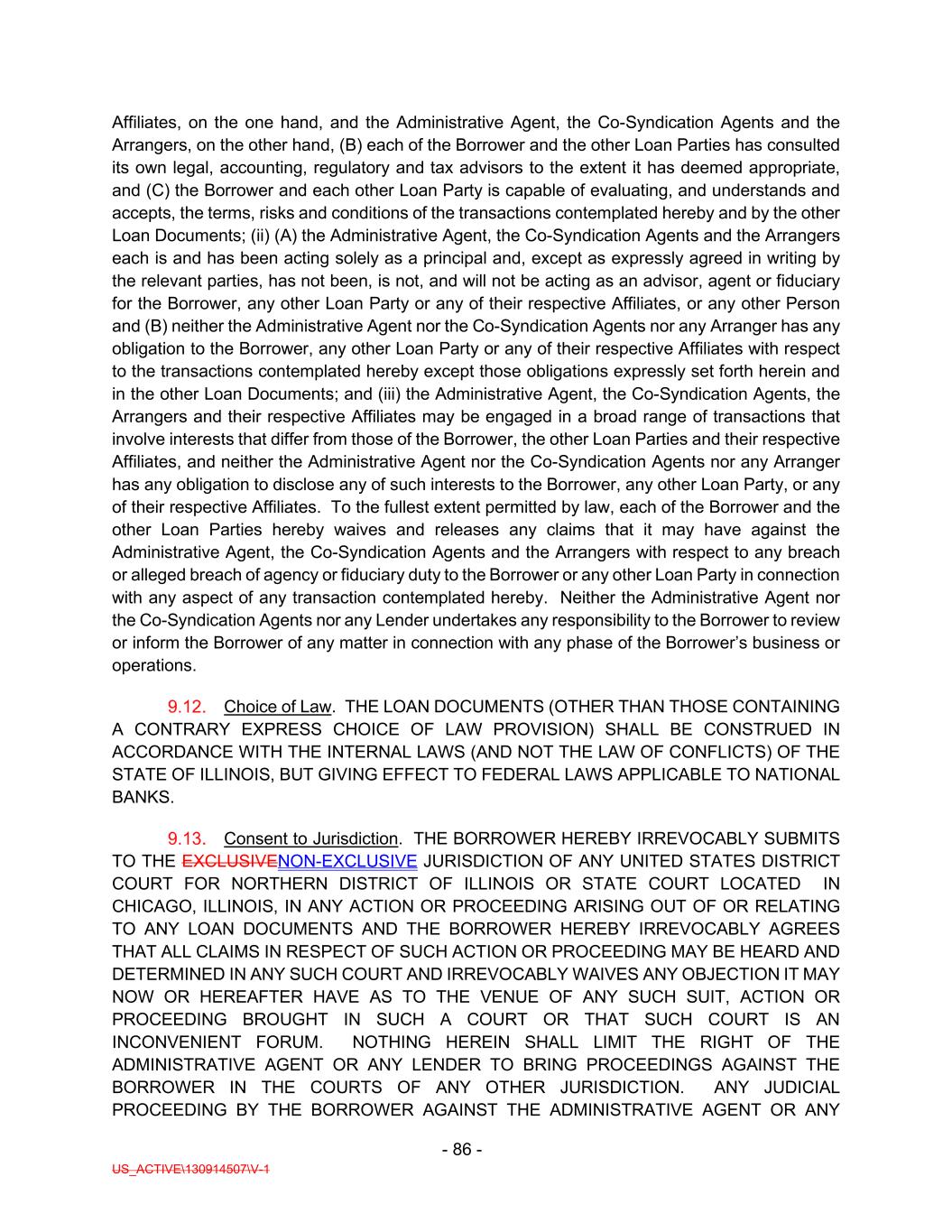 - 86 - US_ACTIVE\130914507\V-1 Affiliates, on the one hand, and the Administrative Agent, the Co-Syndication Agents and the Arrangers, on the other hand, (B) each of the Borrower and the other Loan Parties has consulted its own legal, accounting, regulatory and tax advisors to the extent it has deemed appropriate, and (C) the Borrower and each other Loan Party is capable of evaluating, and understands and accepts, the terms, risks and conditions of the transactions contemplated hereby and by the other Loan Documents; (ii) (A) the Administrative Agent, the Co-Syndication Agents and the Arrangers each is and has been acting solely as a principal and, except as expressly agreed in writing by the relevant parties, has not been, is not, and will not be acting as an advisor, agent or fiduciary for the Borrower, any other Loan Party or any of their respective Affiliates, or any other Person and (B) neither the Administrative Agent nor the Co-Syndication Agents nor any Arranger has any obligation to the Borrower, any other Loan Party or any of their respective Affiliates with respect to the transactions contemplated hereby except those obligations expressly set forth herein and in the other Loan Documents; and (iii) the Administrative Agent, the Co-Syndication Agents, the Arrangers and their respective Affiliates may be engaged in a broad range of transactions that involve interests that differ from those of the Borrower, the other Loan Parties and their respective Affiliates, and neither the Administrative Agent nor the Co-Syndication Agents nor any Arranger has any obligation to disclose any of such interests to the Borrower, any other Loan Party, or any of their respective Affiliates. To the fullest extent permitted by law, each of the Borrower and the other Loan Parties hereby waives and releases any claims that it may have against the Administrative Agent, the Co-Syndication Agents and the Arrangers with respect to any breach or alleged breach of agency or fiduciary duty to the Borrower or any other Loan Party in connection with any aspect of any transaction contemplated hereby. Neither the Administrative Agent nor the Co-Syndication Agents nor any Lender undertakes any responsibility to the Borrower to review or inform the Borrower of any matter in connection with any phase of the Borrower’s business or operations. Choice of Law. THE LOAN DOCUMENTS (OTHER THAN THOSE CONTAINING A CONTRARY EXPRESS CHOICE OF LAW PROVISION) SHALL BE CONSTRUED IN ACCORDANCE WITH THE INTERNAL LAWS (AND NOT THE LAW OF CONFLICTS) OF THE STATE OF ILLINOIS, BUT GIVING EFFECT TO FEDERAL LAWS APPLICABLE TO NATIONAL BANKS. Consent to Jurisdiction. THE BORROWER HEREBY IRREVOCABLY SUBMITS TO THE EXCLUSIVENON-EXCLUSIVE JURISDICTION OF ANY UNITED STATES DISTRICT COURT FOR NORTHERN DISTRICT OF ILLINOIS OR STATE COURT LOCATED IN CHICAGO, ILLINOIS, IN ANY ACTION OR PROCEEDING ARISING OUT OF OR RELATING TO ANY LOAN DOCUMENTS AND THE BORROWER HEREBY IRREVOCABLY AGREES THAT ALL CLAIMS IN RESPECT OF SUCH ACTION OR PROCEEDING MAY BE HEARD AND DETERMINED IN ANY SUCH COURT AND IRREVOCABLY WAIVES ANY OBJECTION IT MAY NOW OR HEREAFTER HAVE AS TO THE VENUE OF ANY SUCH SUIT, ACTION OR PROCEEDING BROUGHT IN SUCH A COURT OR THAT SUCH COURT IS AN INCONVENIENT FORUM. NOTHING HEREIN SHALL LIMIT THE RIGHT OF THE ADMINISTRATIVE AGENT OR ANY LENDER TO BRING PROCEEDINGS AGAINST THE BORROWER IN THE COURTS OF ANY OTHER JURISDICTION. ANY JUDICIAL PROCEEDING BY THE BORROWER AGAINST THE ADMINISTRATIVE AGENT OR ANY