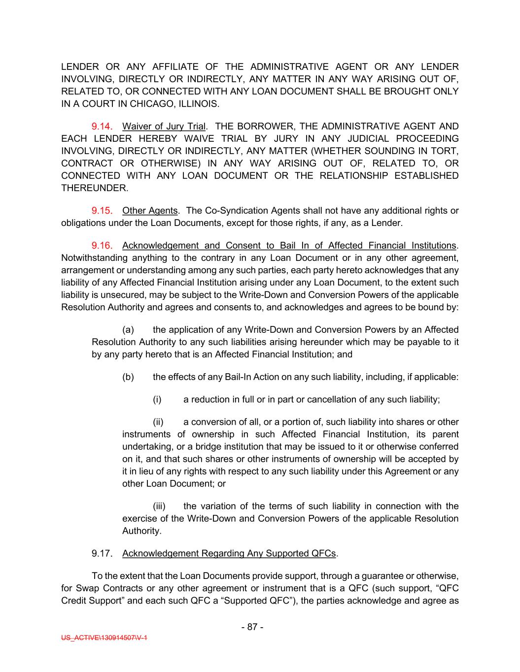 - 87 - US_ACTIVE\130914507\V-1 LENDER OR ANY AFFILIATE OF THE ADMINISTRATIVE AGENT OR ANY LENDER INVOLVING, DIRECTLY OR INDIRECTLY, ANY MATTER IN ANY WAY ARISING OUT OF, RELATED TO, OR CONNECTED WITH ANY LOAN DOCUMENT SHALL BE BROUGHT ONLY IN A COURT IN CHICAGO, ILLINOIS. Waiver of Jury Trial. THE BORROWER, THE ADMINISTRATIVE AGENT AND EACH LENDER HEREBY WAIVE TRIAL BY JURY IN ANY JUDICIAL PROCEEDING INVOLVING, DIRECTLY OR INDIRECTLY, ANY MATTER (WHETHER SOUNDING IN TORT, CONTRACT OR OTHERWISE) IN ANY WAY ARISING OUT OF, RELATED TO, OR CONNECTED WITH ANY LOAN DOCUMENT OR THE RELATIONSHIP ESTABLISHED THEREUNDER. Other Agents. The Co-Syndication Agents shall not have any additional rights or obligations under the Loan Documents, except for those rights, if any, as a Lender. Acknowledgement and Consent to Bail In of Affected Financial Institutions. Notwithstanding anything to the contrary in any Loan Document or in any other agreement, arrangement or understanding among any such parties, each party hereto acknowledges that any liability of any Affected Financial Institution arising under any Loan Document, to the extent such liability is unsecured, may be subject to the Write-Down and Conversion Powers of the applicable Resolution Authority and agrees and consents to, and acknowledges and agrees to be bound by: (a) the application of any Write-Down and Conversion Powers by an Affected Resolution Authority to any such liabilities arising hereunder which may be payable to it by any party hereto that is an Affected Financial Institution; and (b) the effects of any Bail-In Action on any such liability, including, if applicable: (i) a reduction in full or in part or cancellation of any such liability; (ii) a conversion of all, or a portion of, such liability into shares or other instruments of ownership in such Affected Financial Institution, its parent undertaking, or a bridge institution that may be issued to it or otherwise conferred on it, and that such shares or other instruments of ownership will be accepted by it in lieu of any rights with respect to any such liability under this Agreement or any other Loan Document; or (iii) the variation of the terms of such liability in connection with the exercise of the Write-Down and Conversion Powers of the applicable Resolution Authority. Acknowledgement Regarding Any Supported QFCs. To the extent that the Loan Documents provide support, through a guarantee or otherwise, for Swap Contracts or any other agreement or instrument that is a QFC (such support, “QFC Credit Support” and each such QFC a “Supported QFC”), the parties acknowledge and agree as