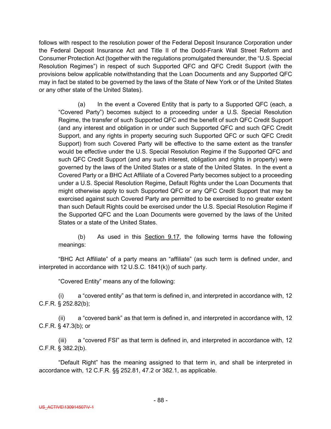 - 88 - US_ACTIVE\130914507\V-1 follows with respect to the resolution power of the Federal Deposit Insurance Corporation under the Federal Deposit Insurance Act and Title II of the Dodd-Frank Wall Street Reform and Consumer Protection Act (together with the regulations promulgated thereunder, the “U.S. Special Resolution Regimes”) in respect of such Supported QFC and QFC Credit Support (with the provisions below applicable notwithstanding that the Loan Documents and any Supported QFC may in fact be stated to be governed by the laws of the State of New York or of the United States or any other state of the United States). (a) In the event a Covered Entity that is party to a Supported QFC (each, a “Covered Party”) becomes subject to a proceeding under a U.S. Special Resolution Regime, the transfer of such Supported QFC and the benefit of such QFC Credit Support (and any interest and obligation in or under such Supported QFC and such QFC Credit Support, and any rights in property securing such Supported QFC or such QFC Credit Support) from such Covered Party will be effective to the same extent as the transfer would be effective under the U.S. Special Resolution Regime if the Supported QFC and such QFC Credit Support (and any such interest, obligation and rights in property) were governed by the laws of the United States or a state of the United States. In the event a Covered Party or a BHC Act Affiliate of a Covered Party becomes subject to a proceeding under a U.S. Special Resolution Regime, Default Rights under the Loan Documents that might otherwise apply to such Supported QFC or any QFC Credit Support that may be exercised against such Covered Party are permitted to be exercised to no greater extent than such Default Rights could be exercised under the U.S. Special Resolution Regime if the Supported QFC and the Loan Documents were governed by the laws of the United States or a state of the United States. (b) As used in this Section 9.17, the following terms have the following meanings: “BHC Act Affiliate” of a party means an “affiliate” (as such term is defined under, and interpreted in accordance with 12 U.S.C. 1841(k)) of such party. “Covered Entity” means any of the following: (i) a “covered entity” as that term is defined in, and interpreted in accordance with, 12 C.F.R. § 252.82(b); (ii) a “covered bank” as that term is defined in, and interpreted in accordance with, 12 C.F.R. § 47.3(b); or (iii) a “covered FSI” as that term is defined in, and interpreted in accordance with, 12 C.F.R. § 382.2(b). “Default Right” has the meaning assigned to that term in, and shall be interpreted in accordance with, 12 C.F.R. §§ 252.81, 47.2 or 382.1, as applicable.