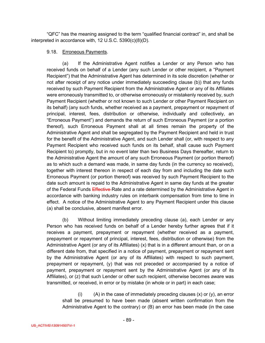 - 89 - US_ACTIVE\130914507\V-1 “QFC” has the meaning assigned to the term “qualified financial contract” in, and shall be interpreted in accordance with, 12 U.S.C. 5390(c)(8)(D). Erroneous Payments. (a) If the Administrative Agent notifies a Lender or any Person who has received funds on behalf of a Lender (any such Lender or other recipient, a “Payment Recipient”) that the Administrative Agent has determined in its sole discretion (whether or not after receipt of any notice under immediately succeeding clause (b)) that any funds received by such Payment Recipient from the Administrative Agent or any of its Affiliates were erroneously transmitted to, or otherwise erroneously or mistakenly received by, such Payment Recipient (whether or not known to such Lender or other Payment Recipient on its behalf) (any such funds, whether received as a payment, prepayment or repayment of principal, interest, fees, distribution or otherwise, individually and collectively, an “Erroneous Payment”) and demands the return of such Erroneous Payment (or a portion thereof), such Erroneous Payment shall at all times remain the property of the Administrative Agent and shall be segregated by the Payment Recipient and held in trust for the benefit of the Administrative Agent, and such Lender shall (or, with respect to any Payment Recipient who received such funds on its behalf, shall cause such Payment Recipient to) promptly, but in no event later than two Business Days thereafter, return to the Administrative Agent the amount of any such Erroneous Payment (or portion thereof) as to which such a demand was made, in same day funds (in the currency so received), together with interest thereon in respect of each day from and including the date such Erroneous Payment (or portion thereof) was received by such Payment Recipient to the date such amount is repaid to the Administrative Agent in same day funds at the greater of the Federal Funds Effective Rate and a rate determined by the Administrative Agent in accordance with banking industry rules on interbank compensation from time to time in effect. A notice of the Administrative Agent to any Payment Recipient under this clause (a) shall be conclusive, absent manifest error. (b) Without limiting immediately preceding clause (a), each Lender or any Person who has received funds on behalf of a Lender hereby further agrees that if it receives a payment, prepayment or repayment (whether received as a payment, prepayment or repayment of principal, interest, fees, distribution or otherwise) from the Administrative Agent (or any of its Affiliates) (x) that is in a different amount than, or on a different date from, that specified in a notice of payment, prepayment or repayment sent by the Administrative Agent (or any of its Affiliates) with respect to such payment, prepayment or repayment, (y) that was not preceded or accompanied by a notice of payment, prepayment or repayment sent by the Administrative Agent (or any of its Affiliates), or (z) that such Lender or other such recipient, otherwise becomes aware was transmitted, or received, in error or by mistake (in whole or in part) in each case; (i) (A) in the case of immediately preceding clauses (x) or (y), an error shall be presumed to have been made (absent written confirmation from the Administrative Agent to the contrary) or (B) an error has been made (in the case