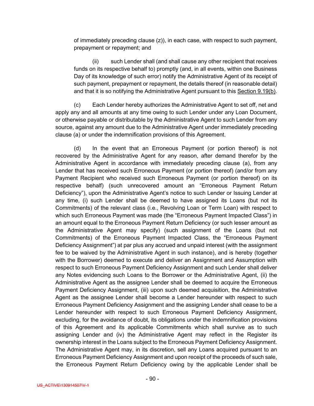 - 90 - US_ACTIVE\130914507\V-1 of immediately preceding clause (z)), in each case, with respect to such payment, prepayment or repayment; and (ii) such Lender shall (and shall cause any other recipient that receives funds on its respective behalf to) promptly (and, in all events, within one Business Day of its knowledge of such error) notify the Administrative Agent of its receipt of such payment, prepayment or repayment, the details thereof (in reasonable detail) and that it is so notifying the Administrative Agent pursuant to this Section 9.19(b). (c) Each Lender hereby authorizes the Administrative Agent to set off, net and apply any and all amounts at any time owing to such Lender under any Loan Document, or otherwise payable or distributable by the Administrative Agent to such Lender from any source, against any amount due to the Administrative Agent under immediately preceding clause (a) or under the indemnification provisions of this Agreement. (d) In the event that an Erroneous Payment (or portion thereof) is not recovered by the Administrative Agent for any reason, after demand therefor by the Administrative Agent in accordance with immediately preceding clause (a), from any Lender that has received such Erroneous Payment (or portion thereof) (and/or from any Payment Recipient who received such Erroneous Payment (or portion thereof) on its respective behalf) (such unrecovered amount an “Erroneous Payment Return Deficiency”), upon the Administrative Agent’s notice to such Lender or Issuing Lender at any time, (i) such Lender shall be deemed to have assigned its Loans (but not its Commitments) of the relevant class (i.e., Revolving Loan or Term Loan) with respect to which such Erroneous Payment was made (the “Erroneous Payment Impacted Class”) in an amount equal to the Erroneous Payment Return Deficiency (or such lesser amount as the Administrative Agent may specify) (such assignment of the Loans (but not Commitments) of the Erroneous Payment Impacted Class, the “Erroneous Payment Deficiency Assignment”) at par plus any accrued and unpaid interest (with the assignment fee to be waived by the Administrative Agent in such instance), and is hereby (together with the Borrower) deemed to execute and deliver an Assignment and Assumption with respect to such Erroneous Payment Deficiency Assignment and such Lender shall deliver any Notes evidencing such Loans to the Borrower or the Administrative Agent, (ii) the Administrative Agent as the assignee Lender shall be deemed to acquire the Erroneous Payment Deficiency Assignment, (iii) upon such deemed acquisition, the Administrative Agent as the assignee Lender shall become a Lender hereunder with respect to such Erroneous Payment Deficiency Assignment and the assigning Lender shall cease to be a Lender hereunder with respect to such Erroneous Payment Deficiency Assignment, excluding, for the avoidance of doubt, its obligations under the indemnification provisions of this Agreement and its applicable Commitments which shall survive as to such assigning Lender and (iv) the Administrative Agent may reflect in the Register its ownership interest in the Loans subject to the Erroneous Payment Deficiency Assignment. The Administrative Agent may, in its discretion, sell any Loans acquired pursuant to an Erroneous Payment Deficiency Assignment and upon receipt of the proceeds of such sale, the Erroneous Payment Return Deficiency owing by the applicable Lender shall be