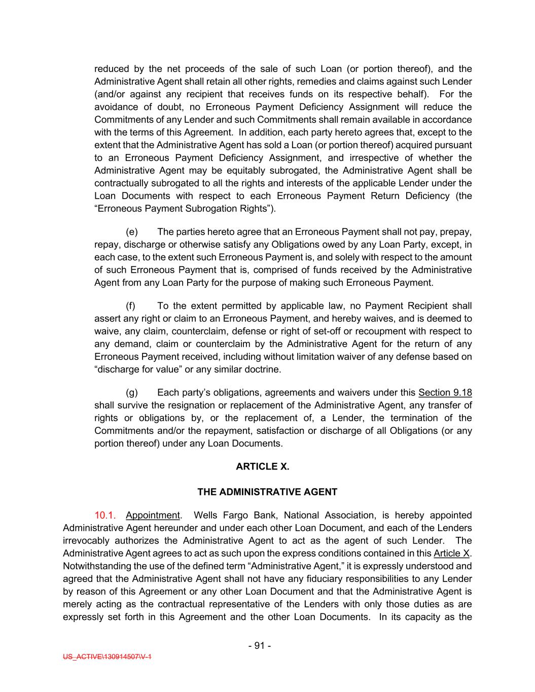 - 91 - US_ACTIVE\130914507\V-1 reduced by the net proceeds of the sale of such Loan (or portion thereof), and the Administrative Agent shall retain all other rights, remedies and claims against such Lender (and/or against any recipient that receives funds on its respective behalf). For the avoidance of doubt, no Erroneous Payment Deficiency Assignment will reduce the Commitments of any Lender and such Commitments shall remain available in accordance with the terms of this Agreement. In addition, each party hereto agrees that, except to the extent that the Administrative Agent has sold a Loan (or portion thereof) acquired pursuant to an Erroneous Payment Deficiency Assignment, and irrespective of whether the Administrative Agent may be equitably subrogated, the Administrative Agent shall be contractually subrogated to all the rights and interests of the applicable Lender under the Loan Documents with respect to each Erroneous Payment Return Deficiency (the “Erroneous Payment Subrogation Rights”). (e) The parties hereto agree that an Erroneous Payment shall not pay, prepay, repay, discharge or otherwise satisfy any Obligations owed by any Loan Party, except, in each case, to the extent such Erroneous Payment is, and solely with respect to the amount of such Erroneous Payment that is, comprised of funds received by the Administrative Agent from any Loan Party for the purpose of making such Erroneous Payment. (f) To the extent permitted by applicable law, no Payment Recipient shall assert any right or claim to an Erroneous Payment, and hereby waives, and is deemed to waive, any claim, counterclaim, defense or right of set-off or recoupment with respect to any demand, claim or counterclaim by the Administrative Agent for the return of any Erroneous Payment received, including without limitation waiver of any defense based on “discharge for value” or any similar doctrine. (g) Each party’s obligations, agreements and waivers under this Section 9.18 shall survive the resignation or replacement of the Administrative Agent, any transfer of rights or obligations by, or the replacement of, a Lender, the termination of the Commitments and/or the repayment, satisfaction or discharge of all Obligations (or any portion thereof) under any Loan Documents. ARTICLE X. THE ADMINISTRATIVE AGENT Appointment. Wells Fargo Bank, National Association, is hereby appointed Administrative Agent hereunder and under each other Loan Document, and each of the Lenders irrevocably authorizes the Administrative Agent to act as the agent of such Lender. The Administrative Agent agrees to act as such upon the express conditions contained in this Article X. Notwithstanding the use of the defined term “Administrative Agent,” it is expressly understood and agreed that the Administrative Agent shall not have any fiduciary responsibilities to any Lender by reason of this Agreement or any other Loan Document and that the Administrative Agent is merely acting as the contractual representative of the Lenders with only those duties as are expressly set forth in this Agreement and the other Loan Documents. In its capacity as the