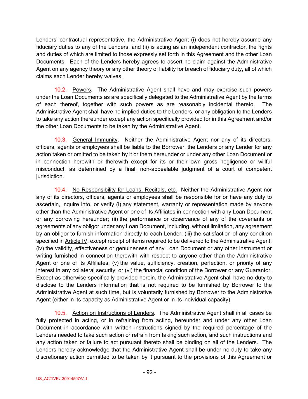 - 92 - US_ACTIVE\130914507\V-1 Lenders’ contractual representative, the Administrative Agent (i) does not hereby assume any fiduciary duties to any of the Lenders, and (ii) is acting as an independent contractor, the rights and duties of which are limited to those expressly set forth in this Agreement and the other Loan Documents. Each of the Lenders hereby agrees to assert no claim against the Administrative Agent on any agency theory or any other theory of liability for breach of fiduciary duty, all of which claims each Lender hereby waives. Powers. The Administrative Agent shall have and may exercise such powers under the Loan Documents as are specifically delegated to the Administrative Agent by the terms of each thereof, together with such powers as are reasonably incidental thereto. The Administrative Agent shall have no implied duties to the Lenders, or any obligation to the Lenders to take any action thereunder except any action specifically provided for in this Agreement and/or the other Loan Documents to be taken by the Administrative Agent. General Immunity. Neither the Administrative Agent nor any of its directors, officers, agents or employees shall be liable to the Borrower, the Lenders or any Lender for any action taken or omitted to be taken by it or them hereunder or under any other Loan Document or in connection herewith or therewith except for its or their own gross negligence or willful misconduct, as determined by a final, non-appealable judgment of a court of competent jurisdiction. No Responsibility for Loans, Recitals, etc. Neither the Administrative Agent nor any of its directors, officers, agents or employees shall be responsible for or have any duty to ascertain, inquire into, or verify (i) any statement, warranty or representation made by anyone other than the Administrative Agent or one of its Affiliates in connection with any Loan Document or any borrowing hereunder; (ii) the performance or observance of any of the covenants or agreements of any obligor under any Loan Document, including, without limitation, any agreement by an obligor to furnish information directly to each Lender; (iii) the satisfaction of any condition specified in Article IV, except receipt of items required to be delivered to the Administrative Agent; (iv) the validity, effectiveness or genuineness of any Loan Document or any other instrument or writing furnished in connection therewith with respect to anyone other than the Administrative Agent or one of its Affiliates; (v) the value, sufficiency, creation, perfection, or priority of any interest in any collateral security; or (vi) the financial condition of the Borrower or any Guarantor. Except as otherwise specifically provided herein, the Administrative Agent shall have no duty to disclose to the Lenders information that is not required to be furnished by Borrower to the Administrative Agent at such time, but is voluntarily furnished by Borrower to the Administrative Agent (either in its capacity as Administrative Agent or in its individual capacity). Action on Instructions of Lenders. The Administrative Agent shall in all cases be fully protected in acting, or in refraining from acting, hereunder and under any other Loan Document in accordance with written instructions signed by the required percentage of the Lenders needed to take such action or refrain from taking such action, and such instructions and any action taken or failure to act pursuant thereto shall be binding on all of the Lenders. The Lenders hereby acknowledge that the Administrative Agent shall be under no duty to take any discretionary action permitted to be taken by it pursuant to the provisions of this Agreement or