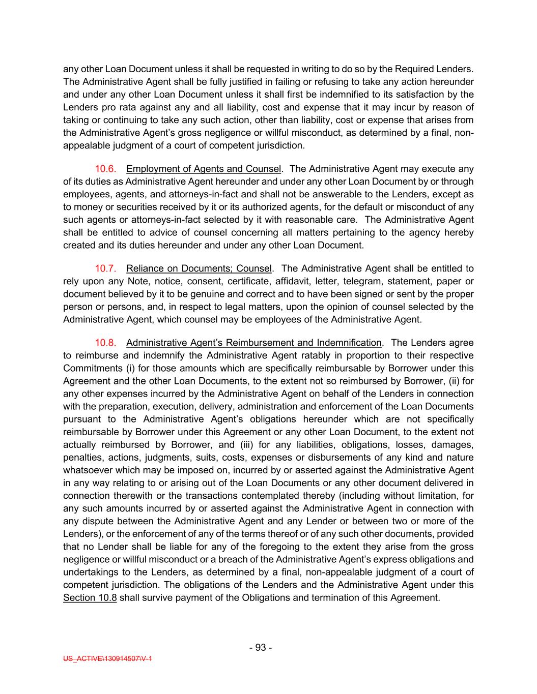 - 93 - US_ACTIVE\130914507\V-1 any other Loan Document unless it shall be requested in writing to do so by the Required Lenders. The Administrative Agent shall be fully justified in failing or refusing to take any action hereunder and under any other Loan Document unless it shall first be indemnified to its satisfaction by the Lenders pro rata against any and all liability, cost and expense that it may incur by reason of taking or continuing to take any such action, other than liability, cost or expense that arises from the Administrative Agent’s gross negligence or willful misconduct, as determined by a final, non- appealable judgment of a court of competent jurisdiction. Employment of Agents and Counsel. The Administrative Agent may execute any of its duties as Administrative Agent hereunder and under any other Loan Document by or through employees, agents, and attorneys-in-fact and shall not be answerable to the Lenders, except as to money or securities received by it or its authorized agents, for the default or misconduct of any such agents or attorneys-in-fact selected by it with reasonable care. The Administrative Agent shall be entitled to advice of counsel concerning all matters pertaining to the agency hereby created and its duties hereunder and under any other Loan Document. Reliance on Documents; Counsel. The Administrative Agent shall be entitled to rely upon any Note, notice, consent, certificate, affidavit, letter, telegram, statement, paper or document believed by it to be genuine and correct and to have been signed or sent by the proper person or persons, and, in respect to legal matters, upon the opinion of counsel selected by the Administrative Agent, which counsel may be employees of the Administrative Agent. Administrative Agent’s Reimbursement and Indemnification. The Lenders agree to reimburse and indemnify the Administrative Agent ratably in proportion to their respective Commitments (i) for those amounts which are specifically reimbursable by Borrower under this Agreement and the other Loan Documents, to the extent not so reimbursed by Borrower, (ii) for any other expenses incurred by the Administrative Agent on behalf of the Lenders in connection with the preparation, execution, delivery, administration and enforcement of the Loan Documents pursuant to the Administrative Agent’s obligations hereunder which are not specifically reimbursable by Borrower under this Agreement or any other Loan Document, to the extent not actually reimbursed by Borrower, and (iii) for any liabilities, obligations, losses, damages, penalties, actions, judgments, suits, costs, expenses or disbursements of any kind and nature whatsoever which may be imposed on, incurred by or asserted against the Administrative Agent in any way relating to or arising out of the Loan Documents or any other document delivered in connection therewith or the transactions contemplated thereby (including without limitation, for any such amounts incurred by or asserted against the Administrative Agent in connection with any dispute between the Administrative Agent and any Lender or between two or more of the Lenders), or the enforcement of any of the terms thereof or of any such other documents, provided that no Lender shall be liable for any of the foregoing to the extent they arise from the gross negligence or willful misconduct or a breach of the Administrative Agent’s express obligations and undertakings to the Lenders, as determined by a final, non-appealable judgment of a court of competent jurisdiction. The obligations of the Lenders and the Administrative Agent under this Section 10.8 shall survive payment of the Obligations and termination of this Agreement.