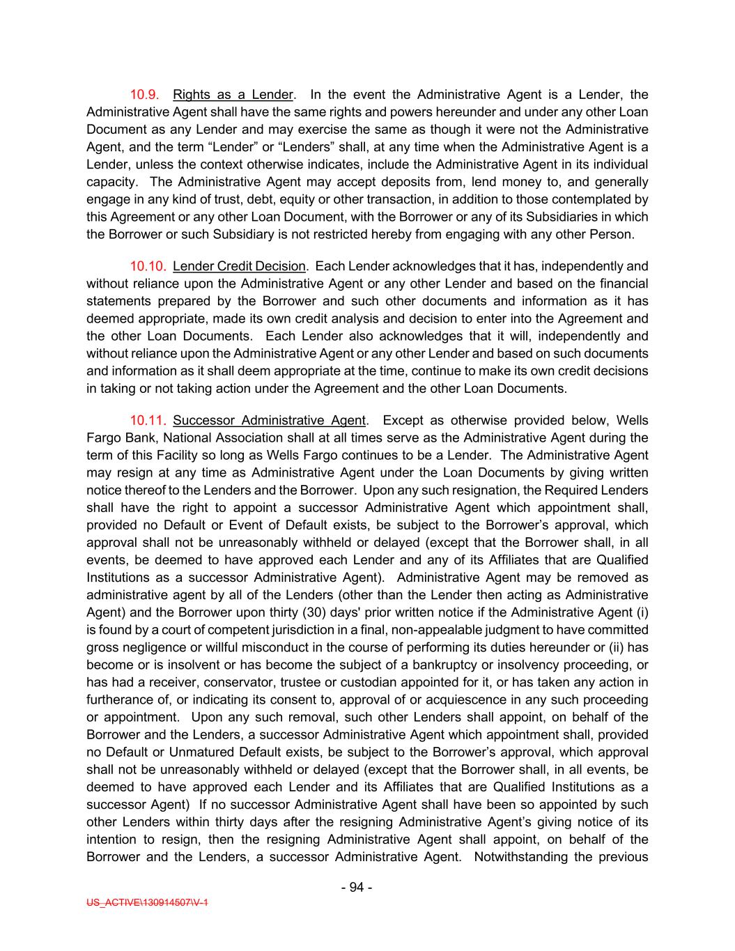 - 94 - US_ACTIVE\130914507\V-1 Rights as a Lender. In the event the Administrative Agent is a Lender, the Administrative Agent shall have the same rights and powers hereunder and under any other Loan Document as any Lender and may exercise the same as though it were not the Administrative Agent, and the term “Lender” or “Lenders” shall, at any time when the Administrative Agent is a Lender, unless the context otherwise indicates, include the Administrative Agent in its individual capacity. The Administrative Agent may accept deposits from, lend money to, and generally engage in any kind of trust, debt, equity or other transaction, in addition to those contemplated by this Agreement or any other Loan Document, with the Borrower or any of its Subsidiaries in which the Borrower or such Subsidiary is not restricted hereby from engaging with any other Person. Lender Credit Decision. Each Lender acknowledges that it has, independently and without reliance upon the Administrative Agent or any other Lender and based on the financial statements prepared by the Borrower and such other documents and information as it has deemed appropriate, made its own credit analysis and decision to enter into the Agreement and the other Loan Documents. Each Lender also acknowledges that it will, independently and without reliance upon the Administrative Agent or any other Lender and based on such documents and information as it shall deem appropriate at the time, continue to make its own credit decisions in taking or not taking action under the Agreement and the other Loan Documents. Successor Administrative Agent. Except as otherwise provided below, Wells Fargo Bank, National Association shall at all times serve as the Administrative Agent during the term of this Facility so long as Wells Fargo continues to be a Lender. The Administrative Agent may resign at any time as Administrative Agent under the Loan Documents by giving written notice thereof to the Lenders and the Borrower. Upon any such resignation, the Required Lenders shall have the right to appoint a successor Administrative Agent which appointment shall, provided no Default or Event of Default exists, be subject to the Borrower’s approval, which approval shall not be unreasonably withheld or delayed (except that the Borrower shall, in all events, be deemed to have approved each Lender and any of its Affiliates that are Qualified Institutions as a successor Administrative Agent). Administrative Agent may be removed as administrative agent by all of the Lenders (other than the Lender then acting as Administrative Agent) and the Borrower upon thirty (30) days' prior written notice if the Administrative Agent (i) is found by a court of competent jurisdiction in a final, non-appealable judgment to have committed gross negligence or willful misconduct in the course of performing its duties hereunder or (ii) has become or is insolvent or has become the subject of a bankruptcy or insolvency proceeding, or has had a receiver, conservator, trustee or custodian appointed for it, or has taken any action in furtherance of, or indicating its consent to, approval of or acquiescence in any such proceeding or appointment. Upon any such removal, such other Lenders shall appoint, on behalf of the Borrower and the Lenders, a successor Administrative Agent which appointment shall, provided no Default or Unmatured Default exists, be subject to the Borrower’s approval, which approval shall not be unreasonably withheld or delayed (except that the Borrower shall, in all events, be deemed to have approved each Lender and its Affiliates that are Qualified Institutions as a successor Agent) If no successor Administrative Agent shall have been so appointed by such other Lenders within thirty days after the resigning Administrative Agent’s giving notice of its intention to resign, then the resigning Administrative Agent shall appoint, on behalf of the Borrower and the Lenders, a successor Administrative Agent. Notwithstanding the previous