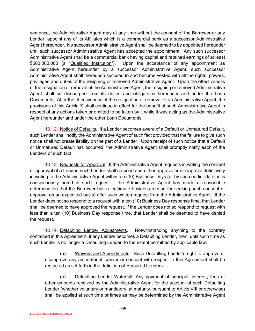 - 95 - US_ACTIVE\130914507\V-1 sentence, the Administrative Agent may at any time without the consent of the Borrower or any Lender, appoint any of its Affiliates which is a commercial bank as a successor Administrative Agent hereunder. No successor Administrative Agent shall be deemed to be appointed hereunder until such successor Administrative Agent has accepted the appointment. Any such successor Administrative Agent shall be a commercial bank having capital and retained earnings of at least $500,000,000 (a “Qualified Institution”). Upon the acceptance of any appointment as Administrative Agent hereunder by a successor Administrative Agent, such successor Administrative Agent shall thereupon succeed to and become vested with all the rights, powers, privileges and duties of the resigning or removed Administrative Agent. Upon the effectiveness of the resignation or removal of the Administrative Agent, the resigning or removed Administrative Agent shall be discharged from its duties and obligations hereunder and under the Loan Documents. After the effectiveness of the resignation or removal of an Administrative Agent, the provisions of this Article X shall continue in effect for the benefit of such Administrative Agent in respect of any actions taken or omitted to be taken by it while it was acting as the Administrative Agent hereunder and under the other Loan Documents. Notice of Defaults. If a Lender becomes aware of a Default or Unmatured Default, such Lender shall notify the Administrative Agent of such fact provided that the failure to give such notice shall not create liability on the part of a Lender. Upon receipt of such notice that a Default or Unmatured Default has occurred, the Administrative Agent shall promptly notify each of the Lenders of such fact. Requests for Approval. If the Administrative Agent requests in writing the consent or approval of a Lender, such Lender shall respond and either approve or disapprove definitively in writing to the Administrative Agent within ten (10) Business Days (or by such earlier date as is conspicuously noted in such request if the Administrative Agent has made a reasonable determination that the Borrower has a legitimate business reason for seeking such consent or approval on an expedited basis) after such written request from the Administrative Agent. If the Lender does not so respond to a request with a ten (10) Business Day response time, that Lender shall be deemed to have approved the request. If the Lender does not so respond to request with less than a ten (10) Business Day response time, that Lender shall be deemed to have denied the request. Defaulting Lender Adjustments. Notwithstanding anything to the contrary contained in this Agreement, if any Lender becomes a Defaulting Lender, then, until such time as such Lender is no longer a Defaulting Lender, to the extent permitted by applicable law: (a) Waivers and Amendments. Such Defaulting Lender’s right to approve or disapprove any amendment, waiver or consent with respect to this Agreement shall be restricted as set forth in the definition of Required Lenders. (b) Defaulting Lender Waterfall. Any payment of principal, interest, fees or other amounts received by the Administrative Agent for the account of such Defaulting Lender (whether voluntary or mandatory, at maturity, pursuant to Article VIII or otherwise) shall be applied at such time or times as may be determined by the Administrative Agent