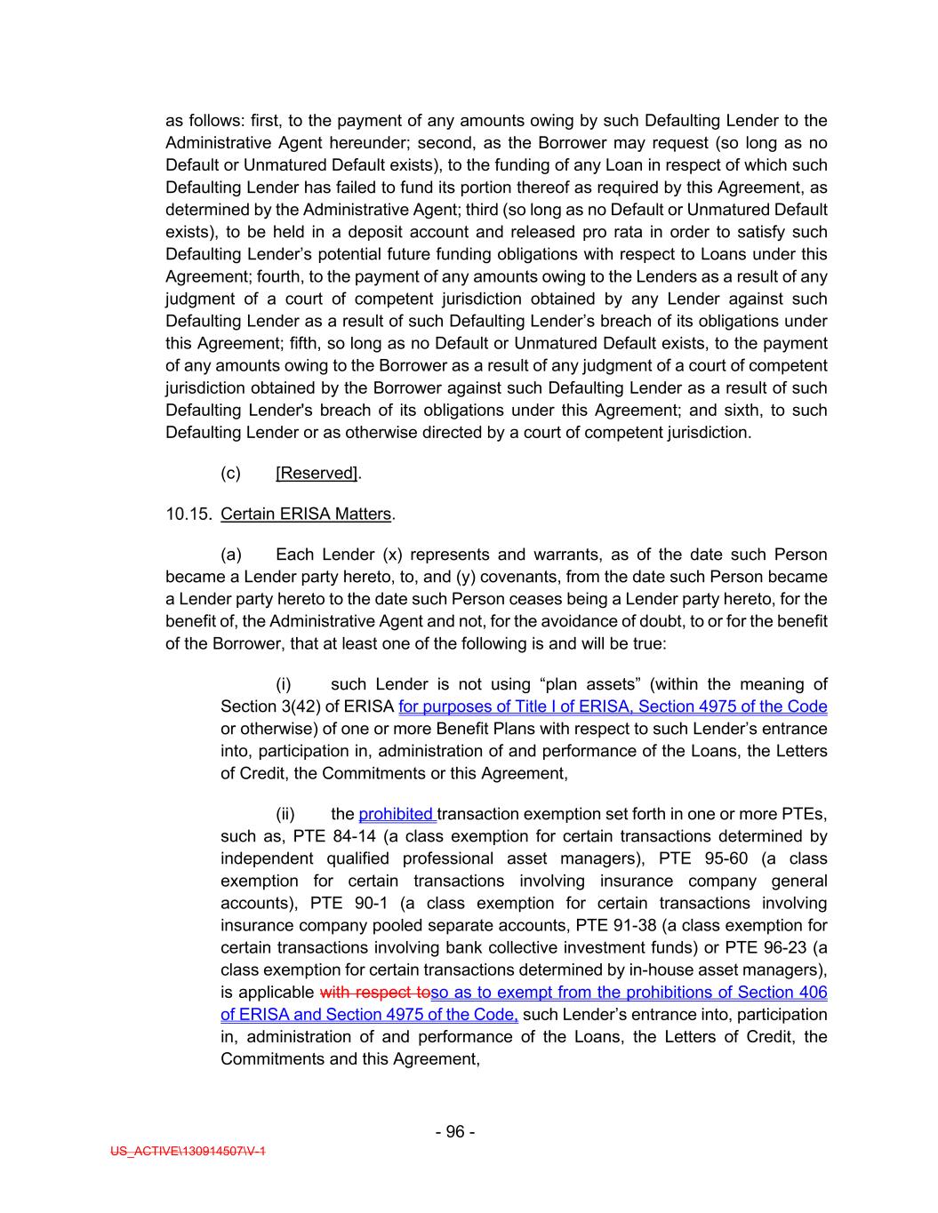 - 96 - US_ACTIVE\130914507\V-1 as follows: first, to the payment of any amounts owing by such Defaulting Lender to the Administrative Agent hereunder; second, as the Borrower may request (so long as no Default or Unmatured Default exists), to the funding of any Loan in respect of which such Defaulting Lender has failed to fund its portion thereof as required by this Agreement, as determined by the Administrative Agent; third (so long as no Default or Unmatured Default exists), to be held in a deposit account and released pro rata in order to satisfy such Defaulting Lender’s potential future funding obligations with respect to Loans under this Agreement; fourth, to the payment of any amounts owing to the Lenders as a result of any judgment of a court of competent jurisdiction obtained by any Lender against such Defaulting Lender as a result of such Defaulting Lender’s breach of its obligations under this Agreement; fifth, so long as no Default or Unmatured Default exists, to the payment of any amounts owing to the Borrower as a result of any judgment of a court of competent jurisdiction obtained by the Borrower against such Defaulting Lender as a result of such Defaulting Lender's breach of its obligations under this Agreement; and sixth, to such Defaulting Lender or as otherwise directed by a court of competent jurisdiction. (c) [Reserved]. Certain ERISA Matters. (a) Each Lender (x) represents and warrants, as of the date such Person became a Lender party hereto, to, and (y) covenants, from the date such Person became a Lender party hereto to the date such Person ceases being a Lender party hereto, for the benefit of, the Administrative Agent and not, for the avoidance of doubt, to or for the benefit of the Borrower, that at least one of the following is and will be true: (i) such Lender is not using “plan assets” (within the meaning of Section 3(42) of ERISA for purposes of Title I of ERISA, Section 4975 of the Code or otherwise) of one or more Benefit Plans with respect to such Lender’s entrance into, participation in, administration of and performance of the Loans, the Letters of Credit, the Commitments or this Agreement, (ii) the prohibited transaction exemption set forth in one or more PTEs, such as, PTE 84-14 (a class exemption for certain transactions determined by independent qualified professional asset managers), PTE 95-60 (a class exemption for certain transactions involving insurance company general accounts), PTE 90-1 (a class exemption for certain transactions involving insurance company pooled separate accounts, PTE 91-38 (a class exemption for certain transactions involving bank collective investment funds) or PTE 96-23 (a class exemption for certain transactions determined by in-house asset managers), is applicable with respect toso as to exempt from the prohibitions of Section 406 of ERISA and Section 4975 of the Code, such Lender’s entrance into, participation in, administration of and performance of the Loans, the Letters of Credit, the Commitments and this Agreement,