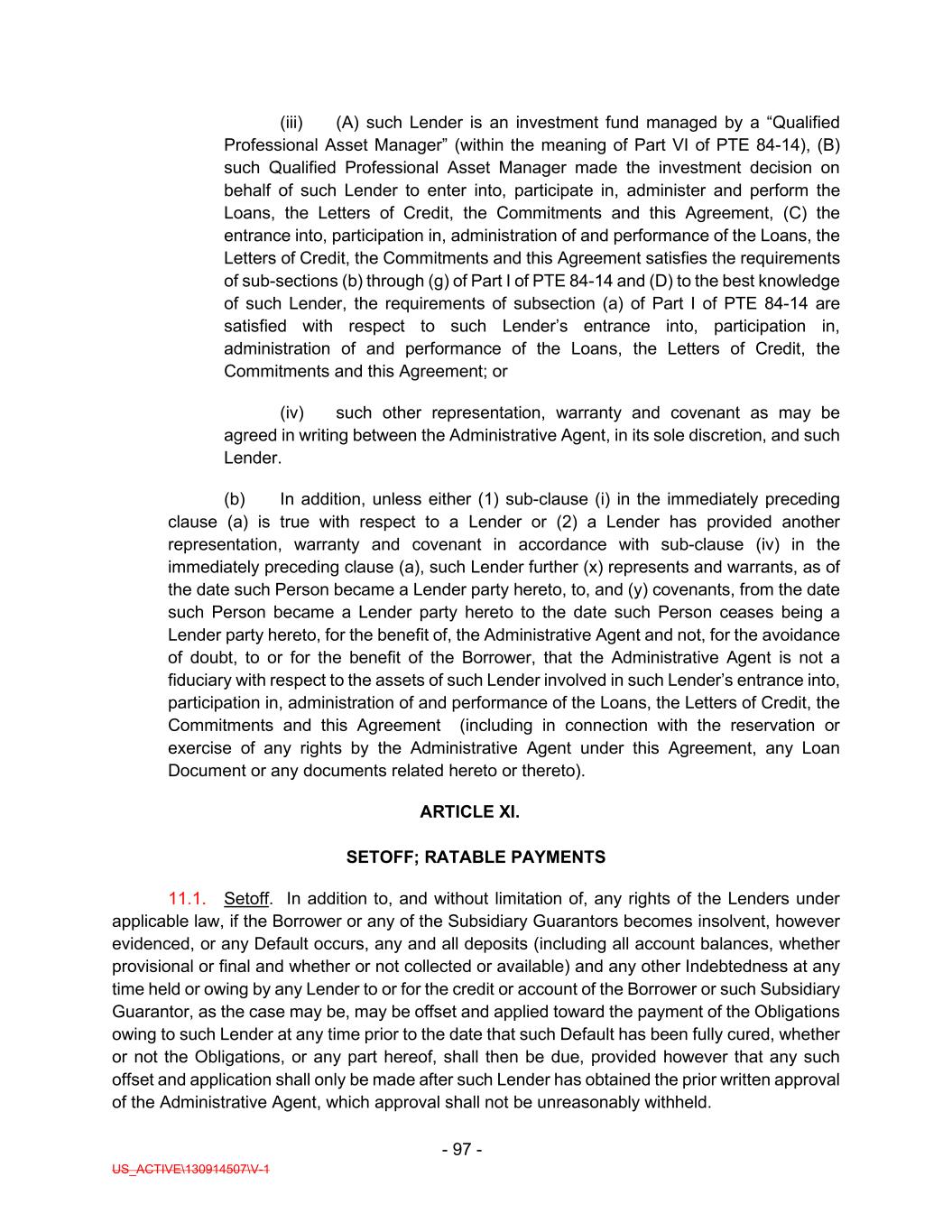 - 97 - US_ACTIVE\130914507\V-1 (iii) (A) such Lender is an investment fund managed by a “Qualified Professional Asset Manager” (within the meaning of Part VI of PTE 84-14), (B) such Qualified Professional Asset Manager made the investment decision on behalf of such Lender to enter into, participate in, administer and perform the Loans, the Letters of Credit, the Commitments and this Agreement, (C) the entrance into, participation in, administration of and performance of the Loans, the Letters of Credit, the Commitments and this Agreement satisfies the requirements of sub-sections (b) through (g) of Part I of PTE 84-14 and (D) to the best knowledge of such Lender, the requirements of subsection (a) of Part I of PTE 84-14 are satisfied with respect to such Lender’s entrance into, participation in, administration of and performance of the Loans, the Letters of Credit, the Commitments and this Agreement; or (iv) such other representation, warranty and covenant as may be agreed in writing between the Administrative Agent, in its sole discretion, and such Lender. (b) In addition, unless either (1) sub-clause (i) in the immediately preceding clause (a) is true with respect to a Lender or (2) a Lender has provided another representation, warranty and covenant in accordance with sub-clause (iv) in the immediately preceding clause (a), such Lender further (x) represents and warrants, as of the date such Person became a Lender party hereto, to, and (y) covenants, from the date such Person became a Lender party hereto to the date such Person ceases being a Lender party hereto, for the benefit of, the Administrative Agent and not, for the avoidance of doubt, to or for the benefit of the Borrower, that the Administrative Agent is not a fiduciary with respect to the assets of such Lender involved in such Lender’s entrance into, participation in, administration of and performance of the Loans, the Letters of Credit, the Commitments and this Agreement (including in connection with the reservation or exercise of any rights by the Administrative Agent under this Agreement, any Loan Document or any documents related hereto or thereto). ARTICLE XI. SETOFF; RATABLE PAYMENTS Setoff. In addition to, and without limitation of, any rights of the Lenders under applicable law, if the Borrower or any of the Subsidiary Guarantors becomes insolvent, however evidenced, or any Default occurs, any and all deposits (including all account balances, whether provisional or final and whether or not collected or available) and any other Indebtedness at any time held or owing by any Lender to or for the credit or account of the Borrower or such Subsidiary Guarantor, as the case may be, may be offset and applied toward the payment of the Obligations owing to such Lender at any time prior to the date that such Default has been fully cured, whether or not the Obligations, or any part hereof, shall then be due, provided however that any such offset and application shall only be made after such Lender has obtained the prior written approval of the Administrative Agent, which approval shall not be unreasonably withheld.