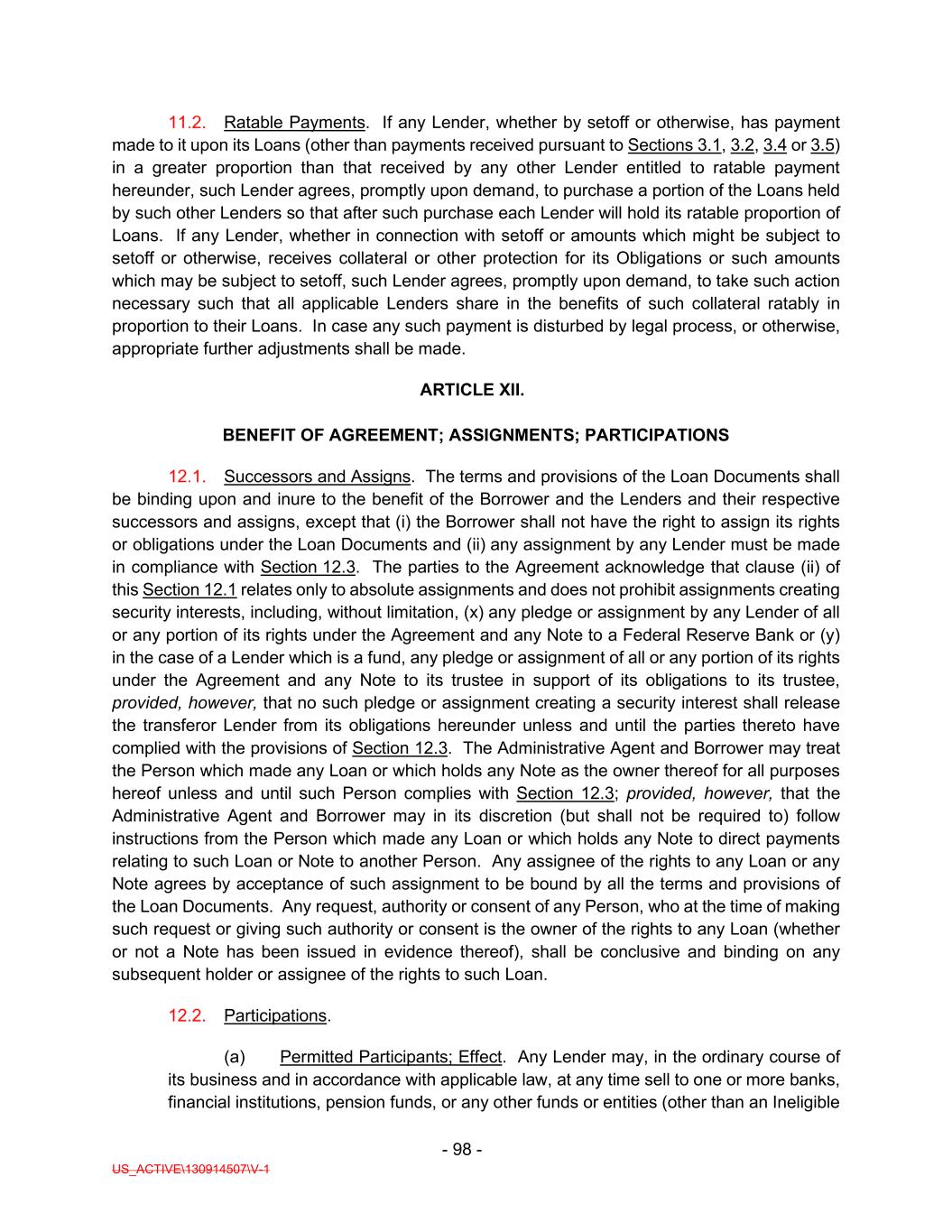 - 98 - US_ACTIVE\130914507\V-1 Ratable Payments. If any Lender, whether by setoff or otherwise, has payment made to it upon its Loans (other than payments received pursuant to Sections 3.1, 3.2, 3.4 or 3.5) in a greater proportion than that received by any other Lender entitled to ratable payment hereunder, such Lender agrees, promptly upon demand, to purchase a portion of the Loans held by such other Lenders so that after such purchase each Lender will hold its ratable proportion of Loans. If any Lender, whether in connection with setoff or amounts which might be subject to setoff or otherwise, receives collateral or other protection for its Obligations or such amounts which may be subject to setoff, such Lender agrees, promptly upon demand, to take such action necessary such that all applicable Lenders share in the benefits of such collateral ratably in proportion to their Loans. In case any such payment is disturbed by legal process, or otherwise, appropriate further adjustments shall be made. ARTICLE XII. BENEFIT OF AGREEMENT; ASSIGNMENTS; PARTICIPATIONS Successors and Assigns. The terms and provisions of the Loan Documents shall be binding upon and inure to the benefit of the Borrower and the Lenders and their respective successors and assigns, except that (i) the Borrower shall not have the right to assign its rights or obligations under the Loan Documents and (ii) any assignment by any Lender must be made in compliance with Section 12.3. The parties to the Agreement acknowledge that clause (ii) of this Section 12.1 relates only to absolute assignments and does not prohibit assignments creating security interests, including, without limitation, (x) any pledge or assignment by any Lender of all or any portion of its rights under the Agreement and any Note to a Federal Reserve Bank or (y) in the case of a Lender which is a fund, any pledge or assignment of all or any portion of its rights under the Agreement and any Note to its trustee in support of its obligations to its trustee, provided, however, that no such pledge or assignment creating a security interest shall release the transferor Lender from its obligations hereunder unless and until the parties thereto have complied with the provisions of Section 12.3. The Administrative Agent and Borrower may treat the Person which made any Loan or which holds any Note as the owner thereof for all purposes hereof unless and until such Person complies with Section 12.3; provided, however, that the Administrative Agent and Borrower may in its discretion (but shall not be required to) follow instructions from the Person which made any Loan or which holds any Note to direct payments relating to such Loan or Note to another Person. Any assignee of the rights to any Loan or any Note agrees by acceptance of such assignment to be bound by all the terms and provisions of the Loan Documents. Any request, authority or consent of any Person, who at the time of making such request or giving such authority or consent is the owner of the rights to any Loan (whether or not a Note has been issued in evidence thereof), shall be conclusive and binding on any subsequent holder or assignee of the rights to such Loan. Participations. (a) Permitted Participants; Effect. Any Lender may, in the ordinary course of its business and in accordance with applicable law, at any time sell to one or more banks, financial institutions, pension funds, or any other funds or entities (other than an Ineligible
