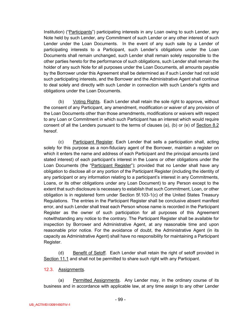 - 99 - US_ACTIVE\130914507\V-1 Institution) (“Participants”) participating interests in any Loan owing to such Lender, any Note held by such Lender, any Commitment of such Lender or any other interest of such Lender under the Loan Documents. In the event of any such sale by a Lender of participating interests to a Participant, such Lender’s obligations under the Loan Documents shall remain unchanged, such Lender shall remain solely responsible to the other parties hereto for the performance of such obligations, such Lender shall remain the holder of any such Note for all purposes under the Loan Documents, all amounts payable by the Borrower under this Agreement shall be determined as if such Lender had not sold such participating interests, and the Borrower and the Administrative Agent shall continue to deal solely and directly with such Lender in connection with such Lender’s rights and obligations under the Loan Documents. (b) Voting Rights. Each Lender shall retain the sole right to approve, without the consent of any Participant, any amendment, modification or waiver of any provision of the Loan Documents other than those amendments, modifications or waivers with respect to any Loan or Commitment in which such Participant has an interest which would require consent of all the Lenders pursuant to the terms of clauses (a), (b) or (e) of Section 8.2 hereof. (c) Participant Register. Each Lender that sells a participation shall, acting solely for this purpose as a non-fiduciary agent of the Borrower, maintain a register on which it enters the name and address of each Participant and the principal amounts (and stated interest) of each participant’s interest in the Loans or other obligations under the Loan Documents (the “Participant Register”); provided that no Lender shall have any obligation to disclose all or any portion of the Participant Register (including the identity of any participant or any information relating to a participant’s interest in any Commitments, Loans, or its other obligations under any Loan Document) to any Person except to the extent that such disclosure is necessary to establish that such Commitment, Loan, or other obligation is in registered form under Section 5f.103-1(c) of the United States Treasury Regulations. The entries in the Participant Register shall be conclusive absent manifest error, and such Lender shall treat each Person whose name is recorded in the Participant Register as the owner of such participation for all purposes of this Agreement notwithstanding any notice to the contrary. The Participant Register shall be available for inspection by Borrower and Administrative Agent, at any reasonable time and upon reasonable prior notice. For the avoidance of doubt, the Administrative Agent (in its capacity as Administrative Agent) shall have no responsibility for maintaining a Participant Register. (d) Benefit of Setoff. Each Lender shall retain the right of setoff provided in Section 11.1 and shall not be permitted to share such right with any Participant. Assignments. (a) Permitted Assignments. Any Lender may, in the ordinary course of its business and in accordance with applicable law, at any time assign to any other Lender
