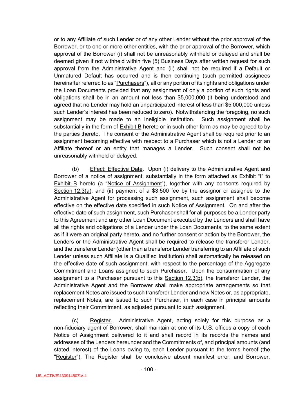 - 100 - US_ACTIVE\130914507\V-1 or to any Affiliate of such Lender or of any other Lender without the prior approval of the Borrower, or to one or more other entities, with the prior approval of the Borrower, which approval of the Borrower (i) shall not be unreasonably withheld or delayed and shall be deemed given if not withheld within five (5) Business Days after written request for such approval from the Administrative Agent and (ii) shall not be required if a Default or Unmatured Default has occurred and is then continuing (such permitted assignees hereinafter referred to as “Purchasers”), all or any portion of its rights and obligations under the Loan Documents provided that any assignment of only a portion of such rights and obligations shall be in an amount not less than $5,000,000 (it being understood and agreed that no Lender may hold an unparticipated interest of less than $5,000,000 unless such Lender’s interest has been reduced to zero). Notwithstanding the foregoing, no such assignment may be made to an Ineligible Institution. Such assignment shall be substantially in the form of Exhibit B hereto or in such other form as may be agreed to by the parties thereto. The consent of the Administrative Agent shall be required prior to an assignment becoming effective with respect to a Purchaser which is not a Lender or an Affiliate thereof or an entity that manages a Lender. Such consent shall not be unreasonably withheld or delayed. (b) Effect; Effective Date. Upon (i) delivery to the Administrative Agent and Borrower of a notice of assignment, substantially in the form attached as Exhibit “I” to Exhibit B hereto (a “Notice of Assignment”), together with any consents required by Section 12.3(a), and (ii) payment of a $3,500 fee by the assignor or assignee to the Administrative Agent for processing such assignment, such assignment shall become effective on the effective date specified in such Notice of Assignment. On and after the effective date of such assignment, such Purchaser shall for all purposes be a Lender party to this Agreement and any other Loan Document executed by the Lenders and shall have all the rights and obligations of a Lender under the Loan Documents, to the same extent as if it were an original party hereto, and no further consent or action by the Borrower, the Lenders or the Administrative Agent shall be required to release the transferor Lender, and the transferor Lender (other than a transferor Lender transferring to an Affiliate of such Lender unless such Affiliate is a Qualified Institution) shall automatically be released on the effective date of such assignment, with respect to the percentage of the Aggregate Commitment and Loans assigned to such Purchaser. Upon the consummation of any assignment to a Purchaser pursuant to this Section 12.3(b), the transferor Lender, the Administrative Agent and the Borrower shall make appropriate arrangements so that replacement Notes are issued to such transferor Lender and new Notes or, as appropriate, replacement Notes, are issued to such Purchaser, in each case in principal amounts reflecting their Commitment, as adjusted pursuant to such assignment. (c) Register. Administrative Agent, acting solely for this purpose as a non-fiduciary agent of Borrower, shall maintain at one of its U.S. offices a copy of each Notice of Assignment delivered to it and shall record in its records the names and addresses of the Lenders hereunder and the Commitments of, and principal amounts (and stated interest) of the Loans owing to, each Lender pursuant to the terms hereof (the "Register"). The Register shall be conclusive absent manifest error, and Borrower,