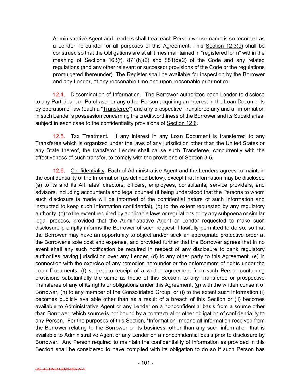 - 101 - US_ACTIVE\130914507\V-1 Administrative Agent and Lenders shall treat each Person whose name is so recorded as a Lender hereunder for all purposes of this Agreement. This Section 12.3(c) shall be construed so that the Obligations are at all times maintained in "registered form" within the meaning of Sections 163(f), 871(h)(2) and 881(c)(2) of the Code and any related regulations (and any other relevant or successor provisions of the Code or the regulations promulgated thereunder). The Register shall be available for inspection by the Borrower and any Lender, at any reasonable time and upon reasonable prior notice. Dissemination of Information. The Borrower authorizes each Lender to disclose to any Participant or Purchaser or any other Person acquiring an interest in the Loan Documents by operation of law (each a “Transferee”) and any prospective Transferee any and all information in such Lender’s possession concerning the creditworthiness of the Borrower and its Subsidiaries, subject in each case to the confidentiality provisions of Section 12.6. Tax Treatment. If any interest in any Loan Document is transferred to any Transferee which is organized under the laws of any jurisdiction other than the United States or any State thereof, the transferor Lender shall cause such Transferee, concurrently with the effectiveness of such transfer, to comply with the provisions of Section 3.5. Confidentiality. Each of Administrative Agent and the Lenders agrees to maintain the confidentiality of the Information (as defined below), except that Information may be disclosed (a) to its and its Affiliates’ directors, officers, employees, consultants, service providers, and advisors, including accountants and legal counsel (it being understood that the Persons to whom such disclosure is made will be informed of the confidential nature of such Information and instructed to keep such Information confidential), (b) to the extent requested by any regulatory authority, (c) to the extent required by applicable laws or regulations or by any subpoena or similar legal process, provided that the Administrative Agent or Lender requested to make such disclosure promptly informs the Borrower of such request if lawfully permitted to do so, so that the Borrower may have an opportunity to object and/or seek an appropriate protective order at the Borrower’s sole cost and expense, and provided further that the Borrower agrees that in no event shall any such notification be required in respect of any disclosure to bank regulatory authorities having jurisdiction over any Lender, (d) to any other party to this Agreement, (e) in connection with the exercise of any remedies hereunder or the enforcement of rights under the Loan Documents, (f) subject to receipt of a written agreement from such Person containing provisions substantially the same as those of this Section, to any Transferee or prospective Transferee of any of its rights or obligations under this Agreement, (g) with the written consent of Borrower, (h) to any member of the Consolidated Group, or (i) to the extent such Information (i) becomes publicly available other than as a result of a breach of this Section or (ii) becomes available to Administrative Agent or any Lender on a nonconfidential basis from a source other than Borrower, which source is not bound by a contractual or other obligation of confidentiality to any Person. For the purposes of this Section, “Information” means all information received from the Borrower relating to the Borrower or its business, other than any such information that is available to Administrative Agent or any Lender on a nonconfidential basis prior to disclosure by Borrower. Any Person required to maintain the confidentiality of Information as provided in this Section shall be considered to have complied with its obligation to do so if such Person has