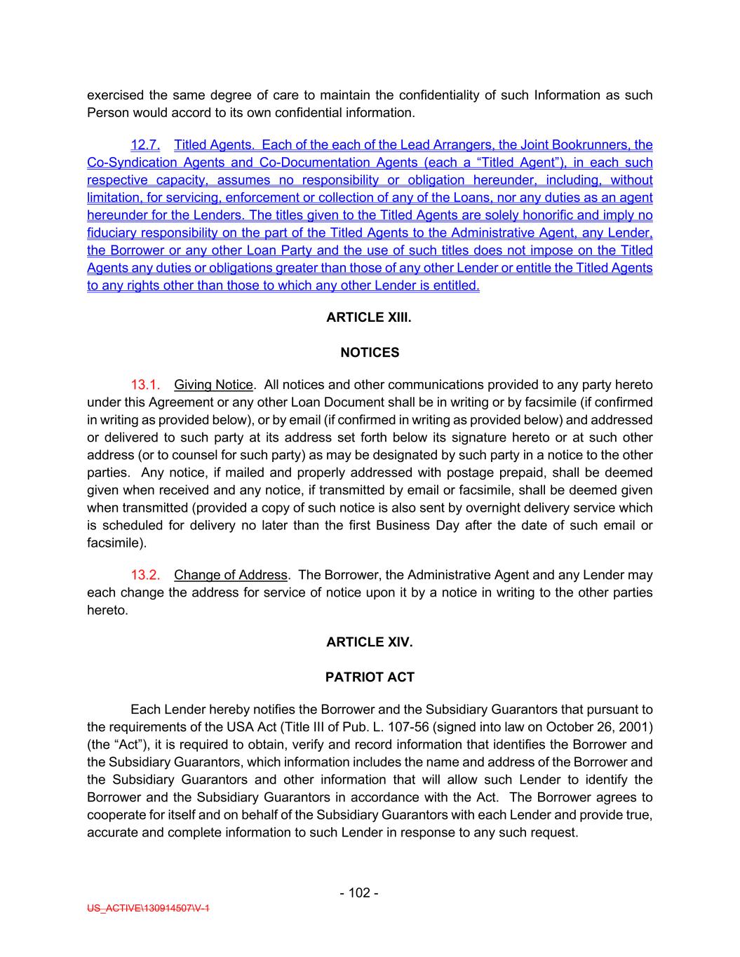 - 102 - US_ACTIVE\130914507\V-1 exercised the same degree of care to maintain the confidentiality of such Information as such Person would accord to its own confidential information. Titled Agents. Each of the each of the Lead Arrangers, the Joint Bookrunners, the Co-Syndication Agents and Co-Documentation Agents (each a “Titled Agent”), in each such respective capacity, assumes no responsibility or obligation hereunder, including, without limitation, for servicing, enforcement or collection of any of the Loans, nor any duties as an agent hereunder for the Lenders. The titles given to the Titled Agents are solely honorific and imply no fiduciary responsibility on the part of the Titled Agents to the Administrative Agent, any Lender, the Borrower or any other Loan Party and the use of such titles does not impose on the Titled Agents any duties or obligations greater than those of any other Lender or entitle the Titled Agents to any rights other than those to which any other Lender is entitled. ARTICLE XIII. NOTICES Giving Notice. All notices and other communications provided to any party hereto under this Agreement or any other Loan Document shall be in writing or by facsimile (if confirmed in writing as provided below), or by email (if confirmed in writing as provided below) and addressed or delivered to such party at its address set forth below its signature hereto or at such other address (or to counsel for such party) as may be designated by such party in a notice to the other parties. Any notice, if mailed and properly addressed with postage prepaid, shall be deemed given when received and any notice, if transmitted by email or facsimile, shall be deemed given when transmitted (provided a copy of such notice is also sent by overnight delivery service which is scheduled for delivery no later than the first Business Day after the date of such email or facsimile). Change of Address. The Borrower, the Administrative Agent and any Lender may each change the address for service of notice upon it by a notice in writing to the other parties hereto. ARTICLE XIV. PATRIOT ACT Each Lender hereby notifies the Borrower and the Subsidiary Guarantors that pursuant to the requirements of the USA Act (Title III of Pub. L. 107-56 (signed into law on October 26, 2001) (the “Act”), it is required to obtain, verify and record information that identifies the Borrower and the Subsidiary Guarantors, which information includes the name and address of the Borrower and the Subsidiary Guarantors and other information that will allow such Lender to identify the Borrower and the Subsidiary Guarantors in accordance with the Act. The Borrower agrees to cooperate for itself and on behalf of the Subsidiary Guarantors with each Lender and provide true, accurate and complete information to such Lender in response to any such request.