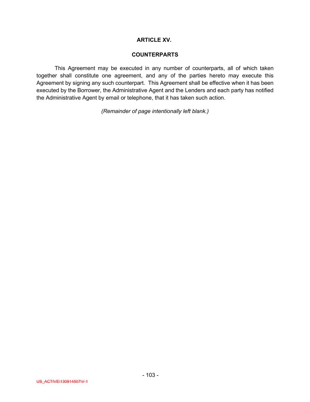 - 103 - US_ACTIVE\130914507\V-1 ARTICLE XV. COUNTERPARTS This Agreement may be executed in any number of counterparts, all of which taken together shall constitute one agreement, and any of the parties hereto may execute this Agreement by signing any such counterpart. This Agreement shall be effective when it has been executed by the Borrower, the Administrative Agent and the Lenders and each party has notified the Administrative Agent by email or telephone, that it has taken such action. (Remainder of page intentionally left blank.)