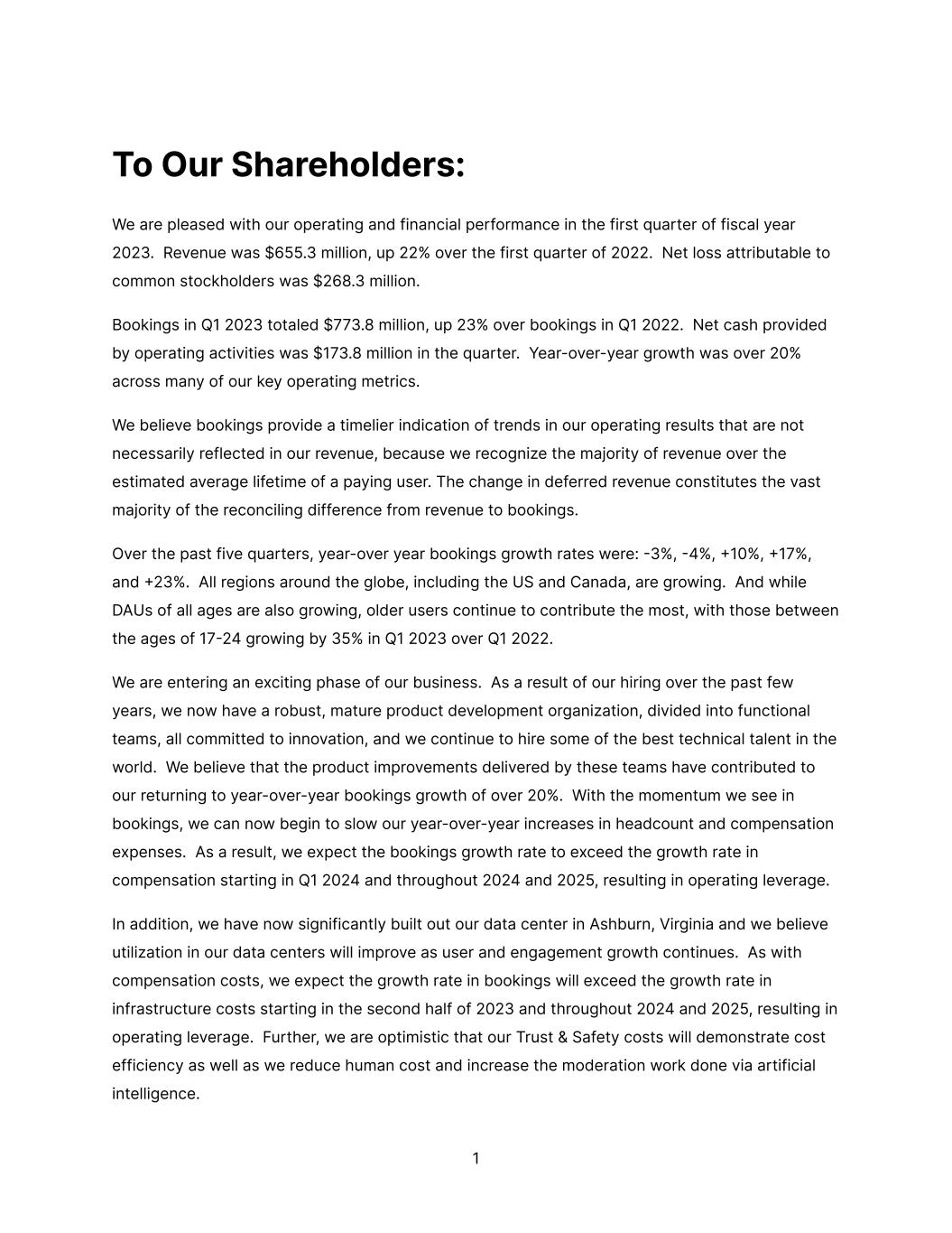To Our Shareholders: We are pleased with our operating and financial performance in the first quarter of fiscal year 2023. Revenue was $655.3 million, up 22% over the first quarter of 2022. Net loss attributable to common stockholders was $268.3 million. Bookings in Q1 2023 totaled $773.8 million, up 23% over bookings in Q1 2022. Net cash provided by operating activities was $173.8 million in the quarter. Year-over-year growth was over 20% across many of our key operating metrics. We believe bookings provide a timelier indication of trends in our operating results that are not necessarily reflected in our revenue, because we recognize the majority of revenue over the estimated average lifetime of a paying user. The change in deferred revenue constitutes the vast majority of the reconciling difference from revenue to bookings. Over the past five quarters, year-over year bookings growth rates were: �3%, �4%, �10%, �17%, and �23%. All regions around the globe, including the US and Canada, are growing. And while DAUs of all ages are also growing, older users continue to contribute the most, with those between the ages of 17�24 growing by 35% in Q1 2023 over Q1 2022. We are entering an exciting phase of our business. As a result of our hiring over the past few years, we now have a robust, mature product development organization, divided into functional teams, all committed to innovation, and we continue to hire some of the best technical talent in the world. We believe that the product improvements delivered by these teams have contributed to our returning to year-over-year bookings growth of over 20%. With the momentum we see in bookings, we can now begin to slow our year-over-year increases in headcount and compensation expenses. As a result, we expect the bookings growth rate to exceed the growth rate in compensation starting in Q1 2024 and throughout 2024 and 2025, resulting in operating leverage. In addition, we have now significantly built out our data center in Ashburn, Virginia and we believe utilization in our data centers will improve as user and engagement growth continues. As with compensation costs, we expect the growth rate in bookings will exceed the growth rate in infrastructure costs starting in the second half of 2023 and throughout 2024 and 2025, resulting in operating leverage. Further, we are optimistic that our Trust & Safety costs will demonstrate cost efficiency as well as we reduce human cost and increase the moderation work done via artificial intelligence. 1