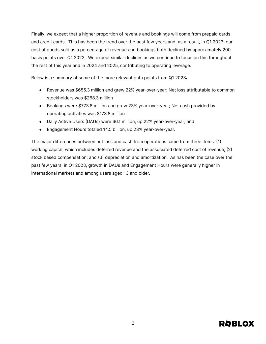 Finally, we expect that a higher proportion of revenue and bookings will come from prepaid cards and credit cards. This has been the trend over the past few years and, as a result, in Q1 2023, our cost of goods sold as a percentage of revenue and bookings both declined by approximately 200 basis points over Q1 2022. We expect similar declines as we continue to focus on this throughout the rest of this year and in 2024 and 2025, contributing to operating leverage. Below is a summary of some of the more relevant data points from Q1 2023� ● Revenue was $655.3 million and grew 22% year-over-year; Net loss attributable to common stockholders was $268.3 million ● Bookings were $773.8 million and grew 23% year-over-year; Net cash provided by operating activities was $173.8 million ● Daily Active Users �DAUs) were 66.1 million, up 22% year-over-year; and ● Engagement Hours totaled 14.5 billion, up 23% year-over-year. The major differences between net loss and cash from operations came from three items: �1� working capital, which includes deferred revenue and the associated deferred cost of revenue; �2� stock based compensation; and �3� depreciation and amortization. As has been the case over the past few years, in Q1 2023, growth in DAUs and Engagement Hours were generally higher in international markets and among users aged 13 and older. 2
