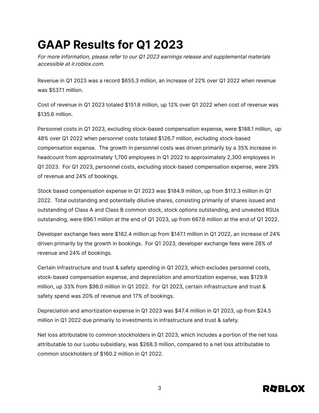 GAAP Results for Q1 2023 For more information, please refer to our Q1 2023 earnings release and supplemental materials accessible at ir.roblox.com. Revenue in Q1 2023 was a record $655.3 million, an increase of 22% over Q1 2022 when revenue was $537.1 million. Cost of revenue in Q1 2023 totaled $151.8 million, up 12% over Q1 2022 when cost of revenue was $135.6 million. Personnel costs in Q1 2023, excluding stock-based compensation expense, were $188.1 million, up 48% over Q1 2022 when personnel costs totaled $126.7 million, excluding stock-based compensation expense. The growth in personnel costs was driven primarily by a 35% increase in headcount from approximately 1,700 employees in Q1 2022 to approximately 2,300 employees in Q1 2023. For Q1 2023, personnel costs, excluding stock-based compensation expense, were 29% of revenue and 24% of bookings. Stock based compensation expense in Q1 2023 was $184.9 million, up from $112.3 million in Q1 2022. Total outstanding and potentially dilutive shares, consisting primarily of shares issued and outstanding of Class A and Class B common stock, stock options outstanding, and unvested RSUs outstanding, were 696.1 million at the end of Q1 2023, up from 667.6 million at the end of Q1 2022. Developer exchange fees were $182.4 million up from $147.1 million in Q1 2022, an increase of 24% driven primarily by the growth in bookings. For Q1 2023, developer exchange fees were 28% of revenue and 24% of bookings. Certain infrastructure and trust & safety spending in Q1 2023, which excludes personnel costs, stock-based compensation expense, and depreciation and amortization expense, was $129.9 million, up 33% from $98.0 million in Q1 2022. For Q1 2023, certain infrastructure and trust & safety spend was 20% of revenue and 17% of bookings. Depreciation and amortization expense in Q1 2023 was $47.4 million in Q1 2023, up from $24.5 million in Q1 2022 due primarily to investments in infrastructure and trust & safety. Net loss attributable to common stockholders in Q1 2023, which includes a portion of the net loss attributable to our Luobu subsidiary, was $268.3 million, compared to a net loss attributable to common stockholders of $160.2 million in Q1 2022. 3