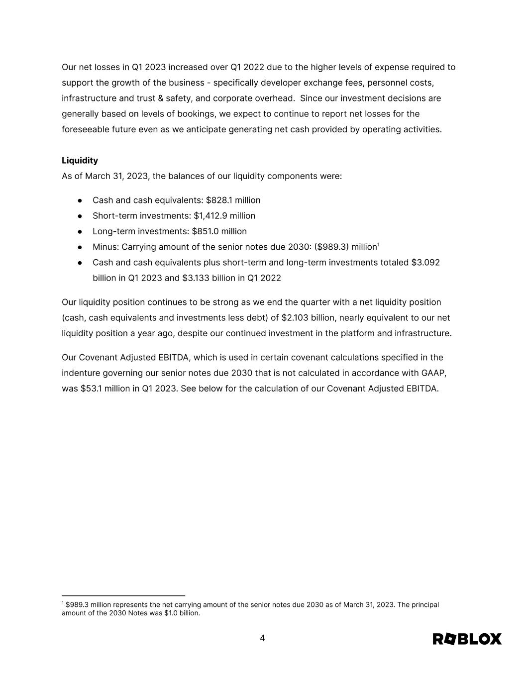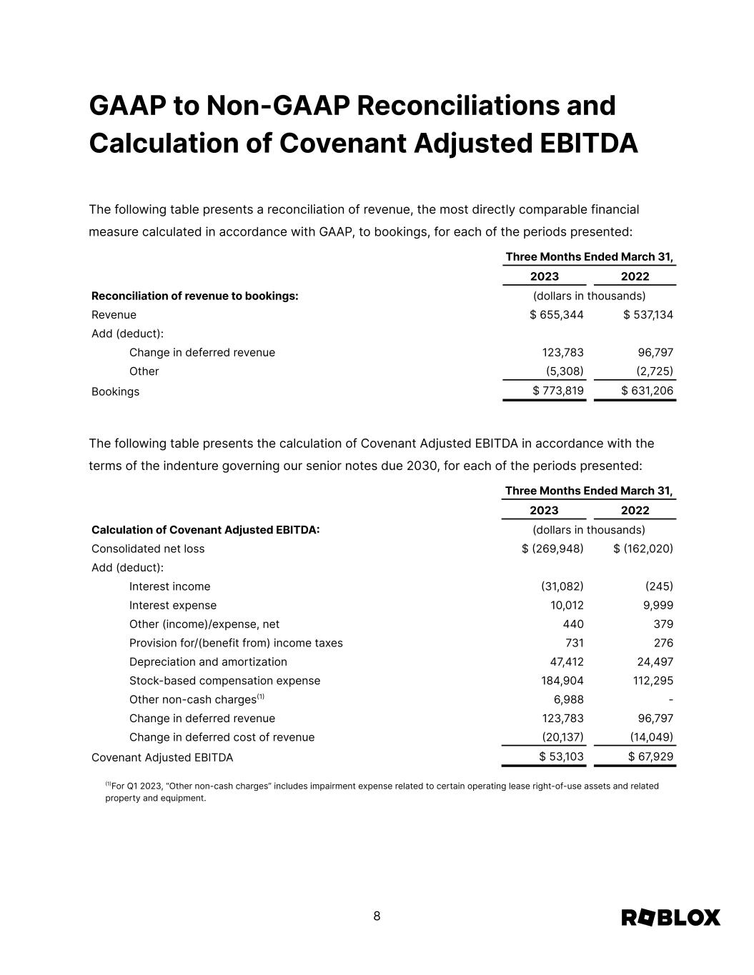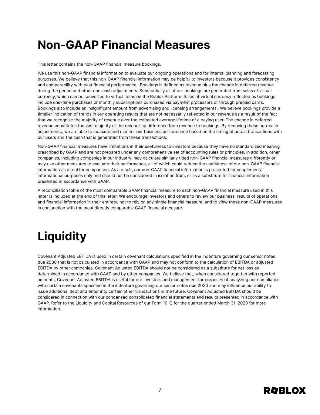 Non-GAAP Financial Measures This letter contains the non-GAAP financial measure bookings. We use this non-GAAP financial information to evaluate our ongoing operations and for internal planning and forecasting purposes. We believe that this non-GAAP financial information may be helpful to investors because it provides consistency and comparability with past financial performance. Bookings is defined as revenue plus the change in deferred revenue during the period and other non-cash adjustments. Substantially all of our bookings are generated from sales of virtual currency, which can be converted to virtual items on the Roblox Platform. Sales of virtual currency reflected as bookings include one-time purchases or monthly subscriptions purchased via payment processors or through prepaid cards. Bookings also include an insignificant amount from advertising and licensing arrangements.. We believe bookings provide a timelier indication of trends in our operating results that are not necessarily reflected in our revenue as a result of the fact that we recognize the majority of revenue over the estimated average lifetime of a paying user. The change in deferred revenue constitutes the vast majority of the reconciling difference from revenue to bookings. By removing these non-cash adjustments, we are able to measure and monitor our business performance based on the timing of actual transactions with our users and the cash that is generated from these transactions. Non-GAAP financial measures have limitations in their usefulness to investors because they have no standardized meaning prescribed by GAAP and are not prepared under any comprehensive set of accounting rules or principles. In addition, other companies, including companies in our industry, may calculate similarly titled non-GAAP financial measures differently or may use other measures to evaluate their performance, all of which could reduce the usefulness of our non-GAAP financial information as a tool for comparison. As a result, our non-GAAP financial information is presented for supplemental informational purposes only and should not be considered in isolation from, or as a substitute for financial information presented in accordance with GAAP. A reconciliation table of the most comparable GAAP financial measure to each non-GAAP financial measure used in this letter is included at the end of this letter. We encourage investors and others to review our business, results of operations, and financial information in their entirety, not to rely on any single financial measure, and to view these non-GAAP measures in conjunction with the most directly comparable GAAP financial measure. Liquidity Covenant Adjusted EBITDA is used in certain covenant calculations specified in the indenture governing our senior notes due 2030 that is not calculated in accordance with GAAP and may not conform to the calculation of EBITDA or adjusted EBITDA by other companies. Covenant Adjusted EBITDA should not be considered as a substitute for net loss as determined in accordance with GAAP and by other companies. We believe that, when considered together with reported amounts, Covenant Adjusted EBITDA is useful for our investors and management for purposes of analyzing our compliance with certain covenants specified in the indenture governing our senior notes due 2030 and may influence our ability to issue additional debt and enter into certain other transactions in the future. Covenant Adjusted EBITDA should be considered in connection with our condensed consolidated financial statements and results presented in accordance with GAAP. Refer to the Liquidity and Capital Resources of our Form 10�Q for the quarter ended March 31, 2023 for more information. 7