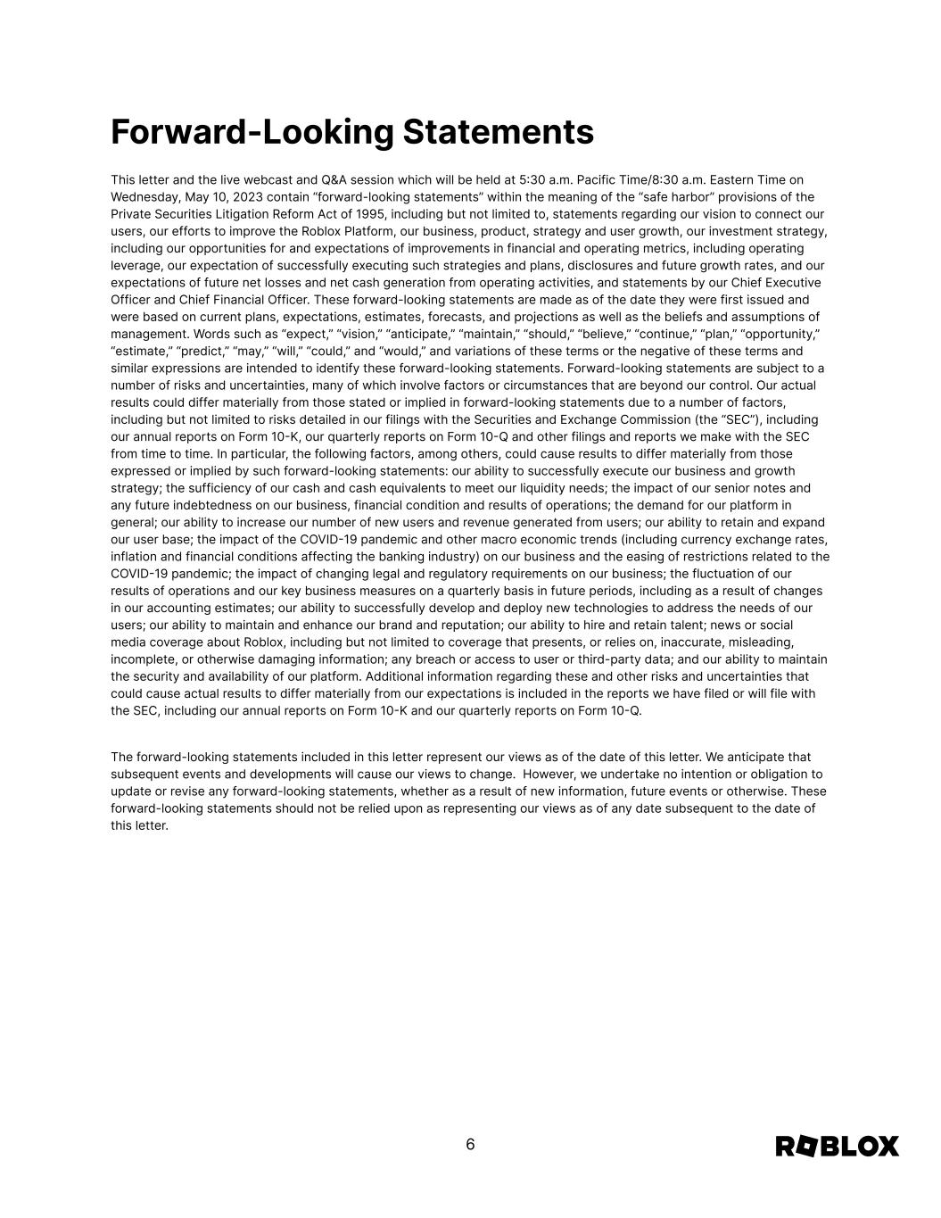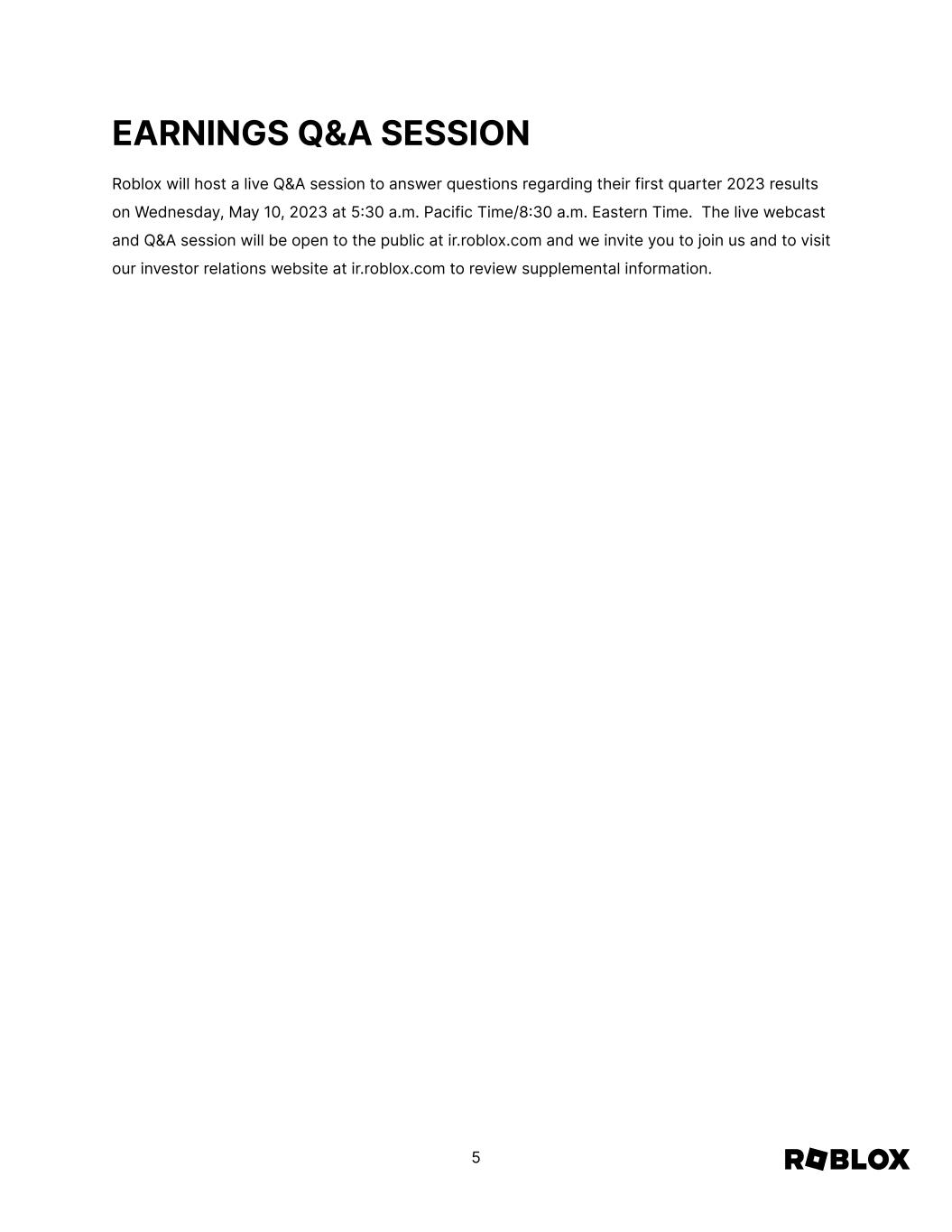 EARNINGS Q&A SESSION Roblox will host a live Q&A session to answer questions regarding their first quarter 2023 results on Wednesday, May 10, 2023 at 5�30 a.m. Pacific Time/8�30 a.m. Eastern Time. The live webcast and Q&A session will be open to the public at ir.roblox.com and we invite you to join us and to visit our investor relations website at ir.roblox.com to review supplemental information. 5