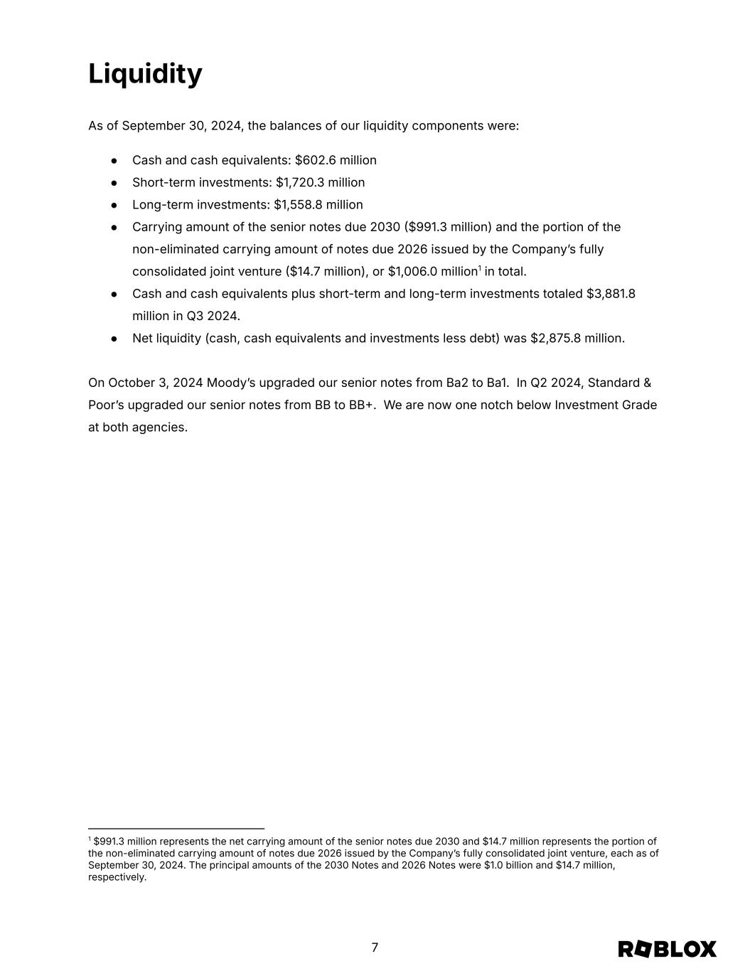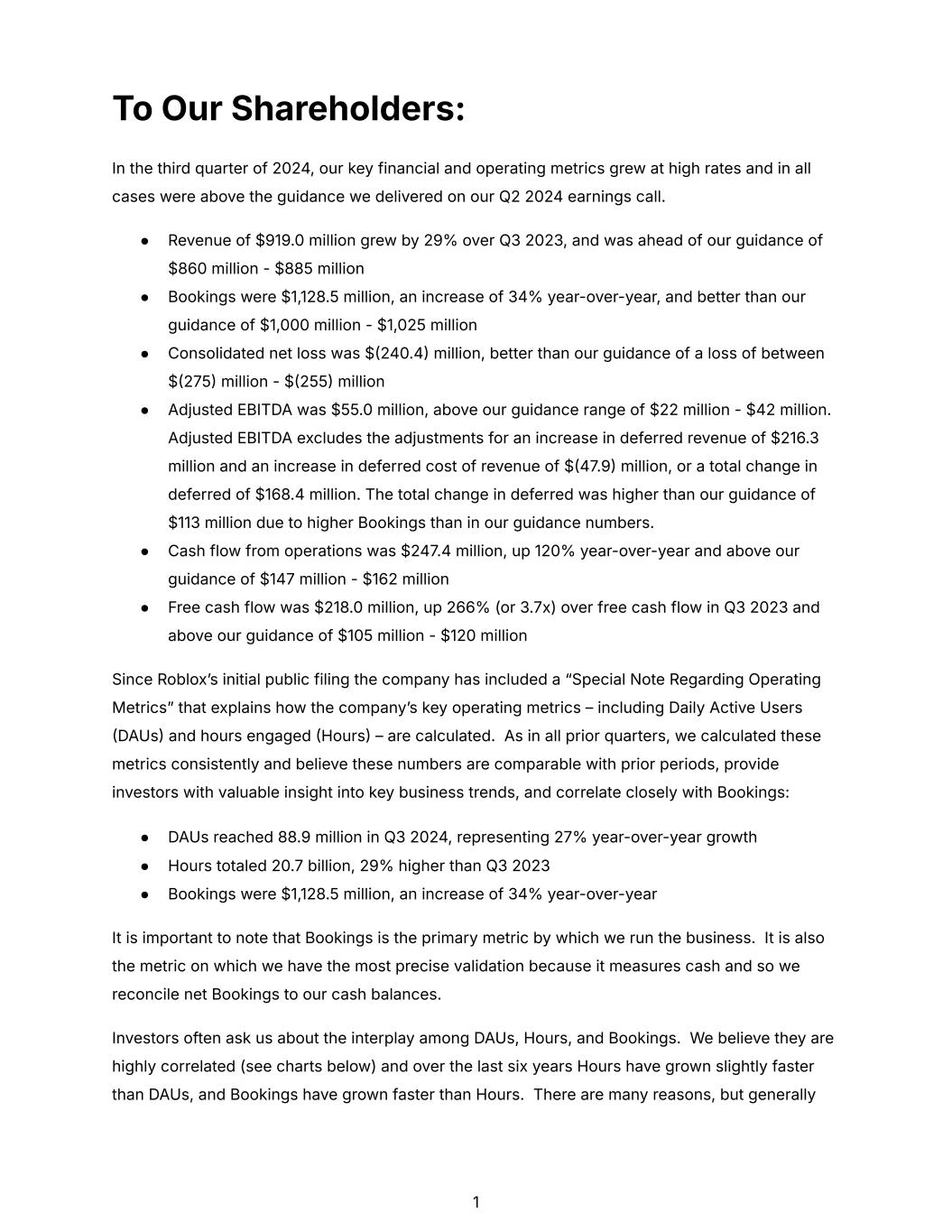 To Our Shareholders: In the third quarter of 2024, our key financial and operating metrics grew at high rates and in all cases were above the guidance we delivered on our Q2 2024 earnings call. ● Revenue of $919.0 million grew by 29% over Q3 2023, and was ahead of our guidance of $860 million - $885 million ● Bookings were $1,128.5 million, an increase of 34% year-over-year, and better than our guidance of $1,000 million - $1,025 million ● Consolidated net loss was $240.4 million, better than our guidance of a loss of between $275 million - $255 million ● Adjusted EBITDA was $55.0 million, above our guidance range of $22 million - $42 million. Adjusted EBITDA excludes the adjustments for an increase in deferred revenue of $216.3 million and an increase in deferred cost of revenue of $47.9 million, or a total change in deferred of $168.4 million. The total change in deferred was higher than our guidance of $113 million due to higher Bookings than in our guidance numbers. ● Cash flow from operations was $247.4 million, up 120% year-over-year and above our guidance of $147 million - $162 million ● Free cash flow was $218.0 million, up 266% (or 3.7x) over free cash flow in Q3 2023 and above our guidance of $105 million - $120 million Since Robloxʼs initial public filing the company has included a “Special Note Regarding Operating Metricsˮ that explains how the companyʼs key operating metrics – including Daily Active Users DAUs and hours engaged Hours – are calculated. As in all prior quarters, we calculated these metrics consistently and believe these numbers are comparable with prior periods, provide investors with valuable insight into key business trends, and correlate closely with Bookings: ● DAUs reached 88.9 million in Q3 2024, representing 27% year-over-year growth ● Hours totaled 20.7 billion, 29% higher than Q3 2023 ● Bookings were $1,128.5 million, an increase of 34% year-over-year It is important to note that Bookings is the primary metric by which we run the business. It is also the metric on which we have the most precise validation because it measures cash and so we reconcile net Bookings to our cash balances. Investors often ask us about the interplay among DAUs, Hours, and Bookings. We believe they are highly correlated (see charts below) and over the last six years Hours have grown slightly faster than DAUs, and Bookings have grown faster than Hours. There are many reasons, but generally 1