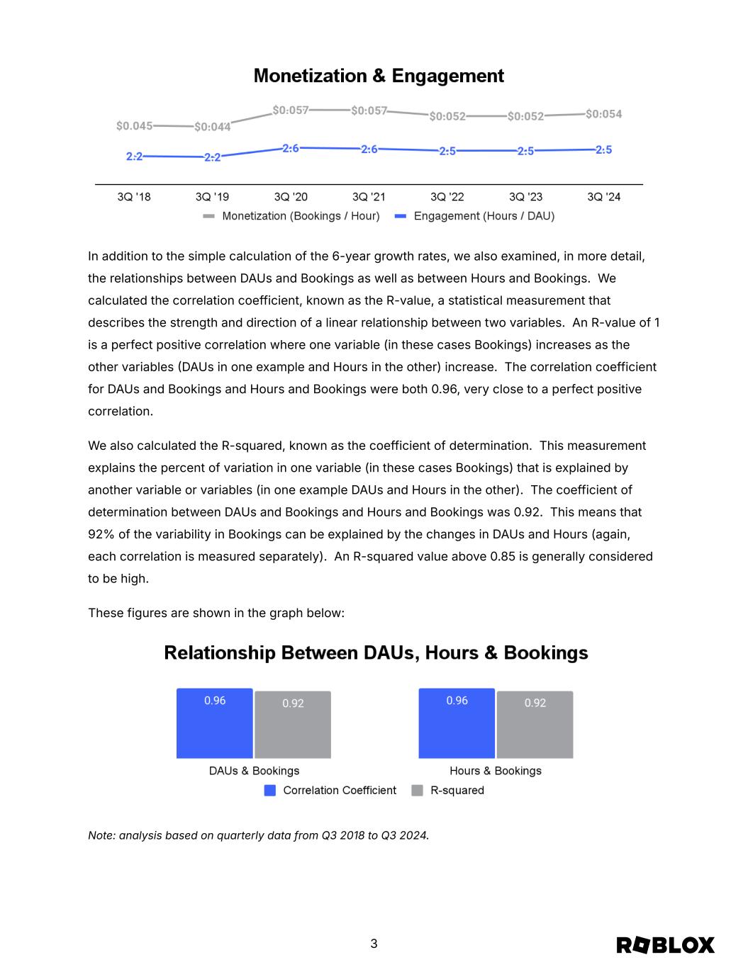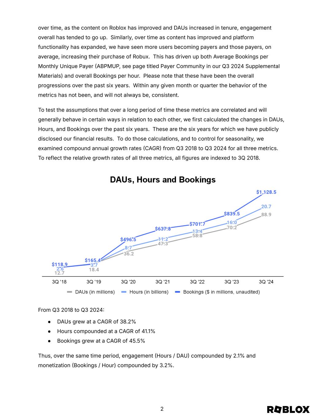 over time, as the content on Roblox has improved and DAUs increased in tenure, engagement overall has tended to go up. Similarly, over time as content has improved and platform functionality has expanded, we have seen more users becoming payers and those payers, on average, increasing their purchase of Robux. This has driven up both Average Bookings per Monthly Unique Payer ABPMUP, see page titled Payer Community in our Q3 2024 Supplemental Materials) and overall Bookings per hour. Please note that these have been the overall progressions over the past six years. Within any given month or quarter the behavior of the metrics has not been, and will not always be, consistent. To test the assumptions that over a long period of time these metrics are correlated and will generally behave in certain ways in relation to each other, we first calculated the changes in DAUs, Hours, and Bookings over the past six years. These are the six years for which we have publicly disclosed our financial results. To do those calculations, and to control for seasonality, we examined compound annual growth rates CAGR from Q3 2018 to Q3 2024 for all three metrics. To reflect the relative growth rates of all three metrics, all figures are indexed to 3Q 2018. From Q3 2018 to Q3 2024 ● DAUs grew at a CAGR of 38.2% ● Hours compounded at a CAGR of 41.1% ● Bookings grew at a CAGR of 45.5% Thus, over the same time period, engagement Hours / DAU compounded by 2.1% and monetization Bookings / Hour) compounded by 3.2%. 2