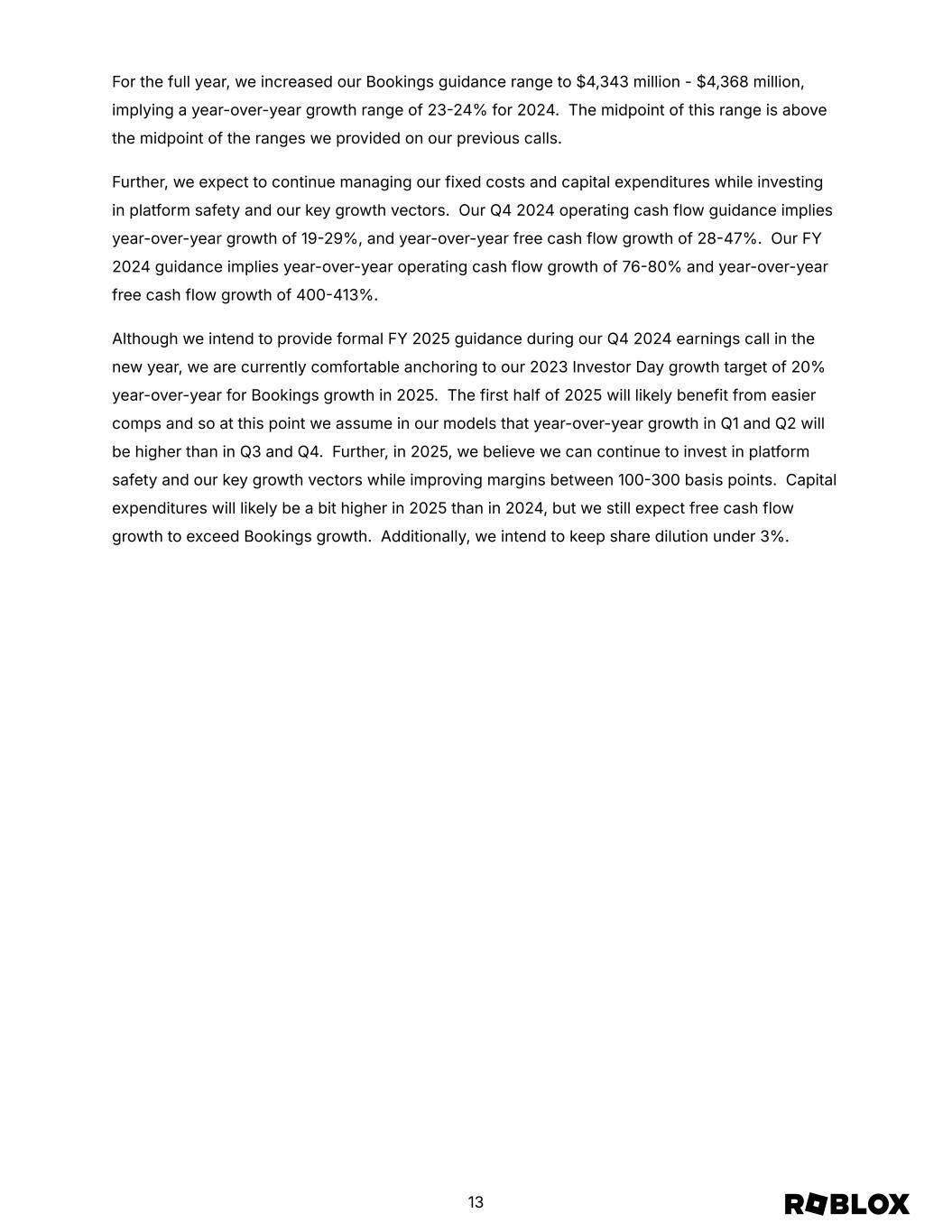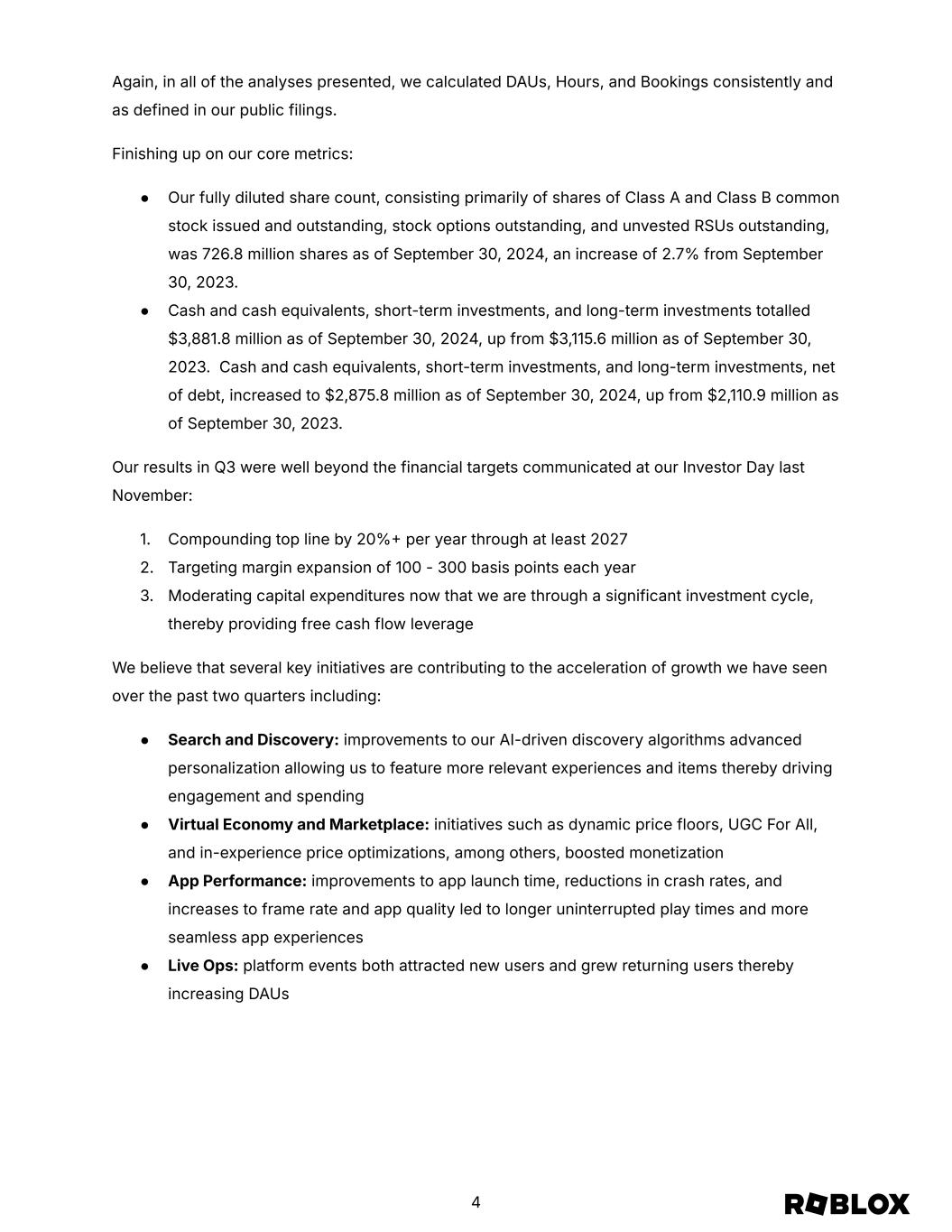 Again, in all of the analyses presented, we calculated DAUs, Hours, and Bookings consistently and as defined in our public filings. Finishing up on our core metrics: ● Our fully diluted share count, consisting primarily of shares of Class A and Class B common stock issued and outstanding, stock options outstanding, and unvested RSUs outstanding, was 726.8 million shares as of September 30, 2024, an increase of 2.7% from September 30, 2023. ● Cash and cash equivalents, short-term investments, and long-term investments totalled $3,881.8 million as of September 30, 2024, up from $3,115.6 million as of September 30, 2023. Cash and cash equivalents, short-term investments, and long-term investments, net of debt, increased to $2,875.8 million as of September 30, 2024, up from $2,110.9 million as of September 30, 2023. Our results in Q3 were well beyond the financial targets communicated at our Investor Day last November: 1. Compounding top line by 20% per year through at least 2027 2. Targeting margin expansion of 100 - 300 basis points each year 3. Moderating capital expenditures now that we are through a significant investment cycle, thereby providing free cash flow leverage We believe that several key initiatives are contributing to the acceleration of growth we have seen over the past two quarters including: ● Search and Discovery: improvements to our AI-driven discovery algorithms advanced personalization allowing us to feature more relevant experiences and items thereby driving engagement and spending ● Virtual Economy and Marketplace: initiatives such as dynamic price floors, UGC For All, and in-experience price optimizations, among others, boosted monetization ● App Performance: improvements to app launch time, reductions in crash rates, and increases to frame rate and app quality led to longer uninterrupted play times and more seamless app experiences ● Live Ops: platform events both attracted new users and grew returning users thereby increasing DAUs 4