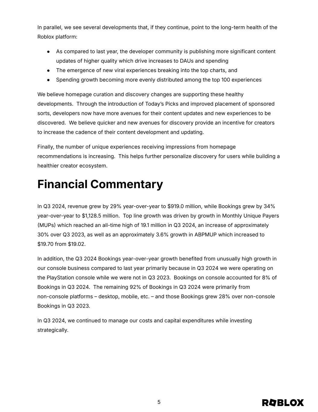In parallel, we see several developments that, if they continue, point to the long-term health of the Roblox platform: ● As compared to last year, the developer community is publishing more significant content updates of higher quality which drive increases to DAUs and spending ● The emergence of new viral experiences breaking into the top charts, and ● Spending growth becoming more evenly distributed among the top 100 experiences We believe homepage curation and discovery changes are supporting these healthy developments. Through the introduction of Todayʼs Picks and improved placement of sponsored sorts, developers now have more avenues for their content updates and new experiences to be discovered. We believe quicker and new avenues for discovery provide an incentive for creators to increase the cadence of their content development and updating. Finally, the number of unique experiences receiving impressions from homepage recommendations is increasing. This helps further personalize discovery for users while building a healthier creator ecosystem. Financial Commentary In Q3 2024, revenue grew by 29% year-over-year to $919.0 million, while Bookings grew by 34% year-over-year to $1,128.5 million. Top line growth was driven by growth in Monthly Unique Payers MUPs which reached an all-time high of 19.1 million in Q3 2024, an increase of approximately 30% over Q3 2023, as well as an approximately 3.6% growth in ABPMUP which increased to $19.70 from $19.02. In addition, the Q3 2024 Bookings year-over-year growth benefited from unusually high growth in our console business compared to last year primarily because in Q3 2024 we were operating on the PlayStation console while we were not in Q3 2023. Bookings on console accounted for 8% of Bookings in Q3 2024. The remaining 92% of Bookings in Q3 2024 were primarily from non-console platforms – desktop, mobile, etc. – and those Bookings grew 28% over non-console Bookings in Q3 2023. In Q3 2024, we continued to manage our costs and capital expenditures while investing strategically. 5