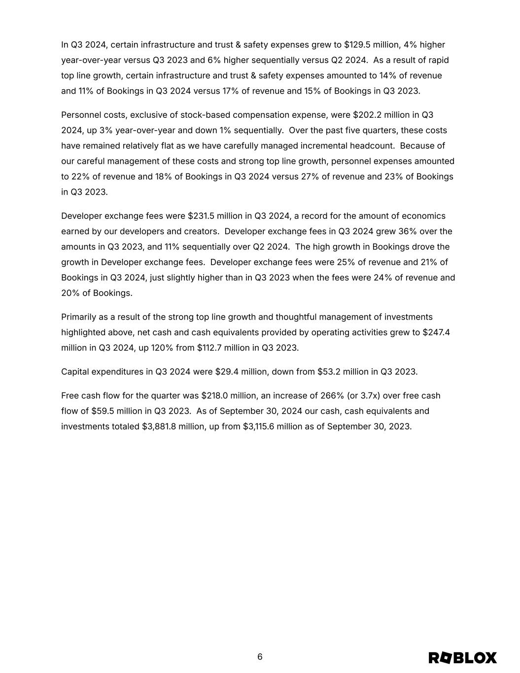 In Q3 2024, certain infrastructure and trust & safety expenses grew to $129.5 million, 4% higher year-over-year versus Q3 2023 and 6% higher sequentially versus Q2 2024. As a result of rapid top line growth, certain infrastructure and trust & safety expenses amounted to 14% of revenue and 11% of Bookings in Q3 2024 versus 17% of revenue and 15% of Bookings in Q3 2023. Personnel costs, exclusive of stock-based compensation expense, were $202.2 million in Q3 2024, up 3% year-over-year and down 1% sequentially. Over the past five quarters, these costs have remained relatively flat as we have carefully managed incremental headcount. Because of our careful management of these costs and strong top line growth, personnel expenses amounted to 22% of revenue and 18% of Bookings in Q3 2024 versus 27% of revenue and 23% of Bookings in Q3 2023. Developer exchange fees were $231.5 million in Q3 2024, a record for the amount of economics earned by our developers and creators. Developer exchange fees in Q3 2024 grew 36% over the amounts in Q3 2023, and 11% sequentially over Q2 2024. The high growth in Bookings drove the growth in Developer exchange fees. Developer exchange fees were 25% of revenue and 21% of Bookings in Q3 2024, just slightly higher than in Q3 2023 when the fees were 24% of revenue and 20% of Bookings. Primarily as a result of the strong top line growth and thoughtful management of investments highlighted above, net cash and cash equivalents provided by operating activities grew to $247.4 million in Q3 2024, up 120% from $112.7 million in Q3 2023. Capital expenditures in Q3 2024 were $29.4 million, down from $53.2 million in Q3 2023. Free cash flow for the quarter was $218.0 million, an increase of 266% (or 3.7x) over free cash flow of $59.5 million in Q3 2023. As of September 30, 2024 our cash, cash equivalents and investments totaled $3,881.8 million, up from $3,115.6 million as of September 30, 2023. 6