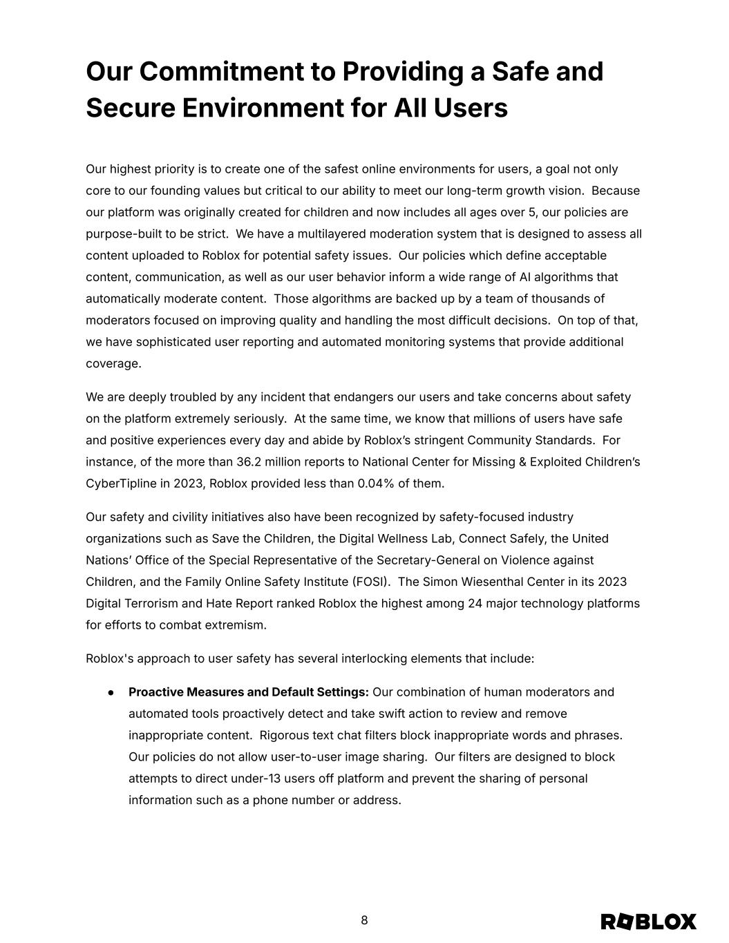 Our Commitment to Providing a Safe and Secure Environment for All Users Our highest priority is to create one of the safest online environments for users, a goal not only core to our founding values but critical to our ability to meet our long-term growth vision. Because our platform was originally created for children and now includes all ages over 5, our policies are purpose-built to be strict. We have a multilayered moderation system that is designed to assess all content uploaded to Roblox for potential safety issues. Our policies which define acceptable content, communication, as well as our user behavior inform a wide range of AI algorithms that automatically moderate content. Those algorithms are backed up by a team of thousands of moderators focused on improving quality and handling the most difficult decisions. On top of that, we have sophisticated user reporting and automated monitoring systems that provide additional coverage. We are deeply troubled by any incident that endangers our users and take concerns about safety on the platform extremely seriously. At the same time, we know that millions of users have safe and positive experiences every day and abide by Robloxʼs stringent Community Standards. For instance, of the more than 36.2 million reports to National Center for Missing & Exploited Childrenʼs CyberTipline in 2023, Roblox provided less than 0.04% of them. Our safety and civility initiatives also have been recognized by safety-focused industry organizations such as Save the Children, the Digital Wellness Lab, Connect Safely, the United Nationsʼ Office of the Special Representative of the Secretary-General on Violence against Children, and the Family Online Safety Institute FOSI. The Simon Wiesenthal Center in its 2023 Digital Terrorism and Hate Report ranked Roblox the highest among 24 major technology platforms for efforts to combat extremism. Roblox's approach to user safety has several interlocking elements that include: ● Proactive Measures and Default Settings: Our combination of human moderators and automated tools proactively detect and take swift action to review and remove inappropriate content. Rigorous text chat filters block inappropriate words and phrases. Our policies do not allow user-to-user image sharing. Our filters are designed to block attempts to direct under-13 users off platform and prevent the sharing of personal information such as a phone number or address. 8