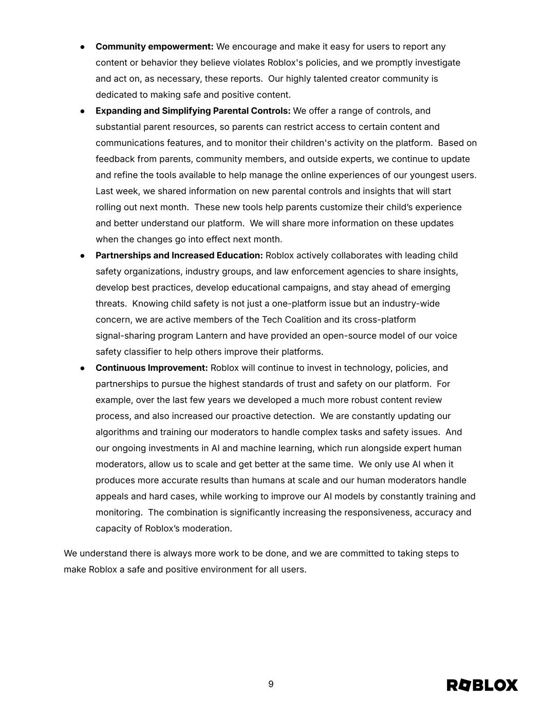 ● Community empowerment: We encourage and make it easy for users to report any content or behavior they believe violates Roblox's policies, and we promptly investigate and act on, as necessary, these reports. Our highly talented creator community is dedicated to making safe and positive content. ● Expanding and Simplifying Parental Controls:We offer a range of controls, and substantial parent resources, so parents can restrict access to certain content and communications features, and to monitor their children's activity on the platform. Based on feedback from parents, community members, and outside experts, we continue to update and refine the tools available to help manage the online experiences of our youngest users. Last week, we shared information on new parental controls and insights that will start rolling out next month. These new tools help parents customize their childʼs experience and better understand our platform. We will share more information on these updates when the changes go into effect next month. ● Partnerships and Increased Education: Roblox actively collaborates with leading child safety organizations, industry groups, and law enforcement agencies to share insights, develop best practices, develop educational campaigns, and stay ahead of emerging threats. Knowing child safety is not just a one-platform issue but an industry-wide concern, we are active members of the Tech Coalition and its cross-platform signal-sharing program Lantern and have provided an open-source model of our voice safety classifier to help others improve their platforms. ● Continuous Improvement: Roblox will continue to invest in technology, policies, and partnerships to pursue the highest standards of trust and safety on our platform. For example, over the last few years we developed a much more robust content review process, and also increased our proactive detection. We are constantly updating our algorithms and training our moderators to handle complex tasks and safety issues. And our ongoing investments in AI and machine learning, which run alongside expert human moderators, allow us to scale and get better at the same time. We only use AI when it produces more accurate results than humans at scale and our human moderators handle appeals and hard cases, while working to improve our AI models by constantly training and monitoring. The combination is significantly increasing the responsiveness, accuracy and capacity of Robloxʼs moderation. We understand there is always more work to be done, and we are committed to taking steps to make Roblox a safe and positive environment for all users. 9