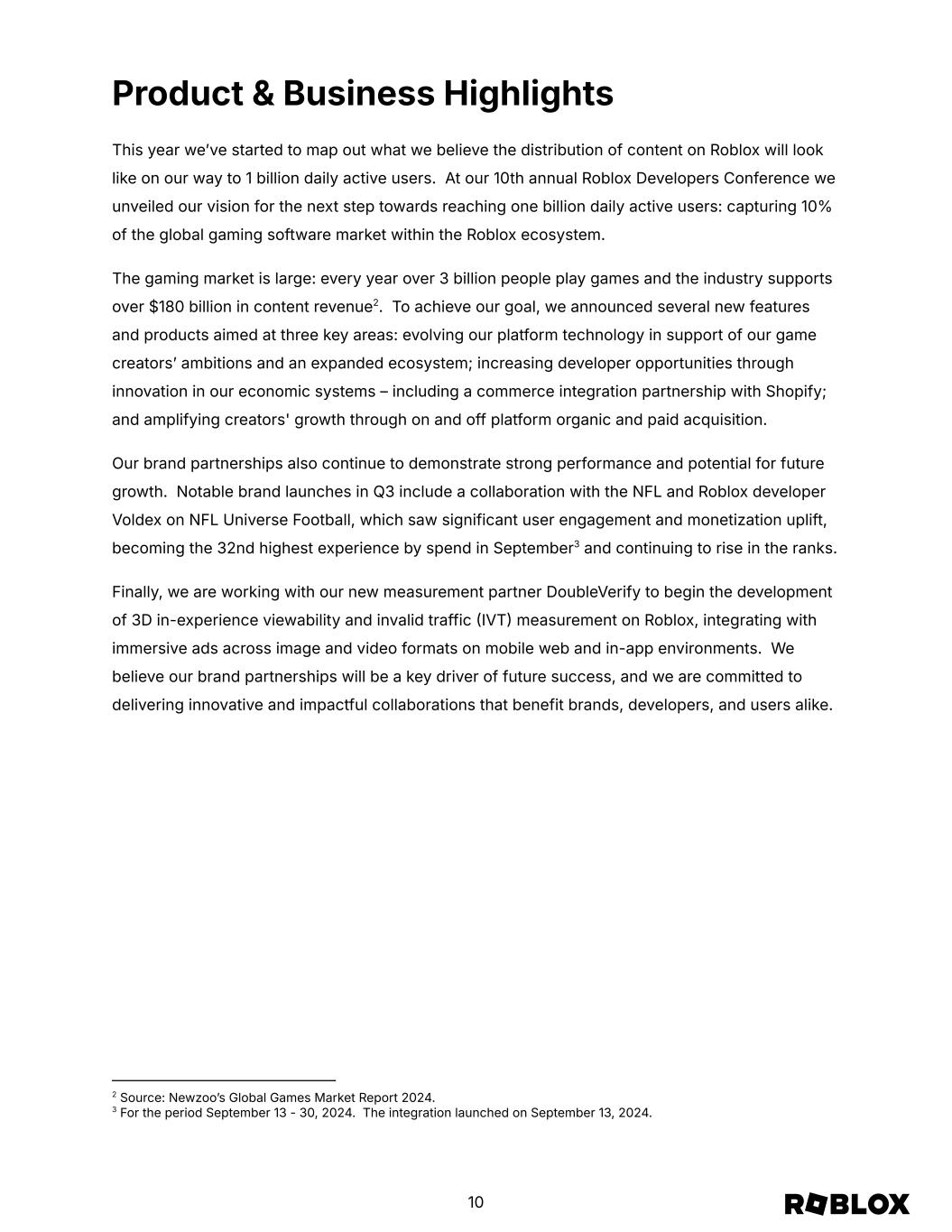 Product & Business Highlights This year weʼve started to map out what we believe the distribution of content on Roblox will look like on our way to 1 billion daily active users. At our 10th annual Roblox Developers Conference we unveiled our vision for the next step towards reaching one billion daily active users: capturing 10% of the global gaming software market within the Roblox ecosystem. The gaming market is large: every year over 3 billion people play games and the industry supports over $180 billion in content revenue2. To achieve our goal, we announced several new features and products aimed at three key areas: evolving our platform technology in support of our game creatorsʼ ambitions and an expanded ecosystem; increasing developer opportunities through innovation in our economic systems – including a commerce integration partnership with Shopify; and amplifying creators' growth through on and off platform organic and paid acquisition. Our brand partnerships also continue to demonstrate strong performance and potential for future growth. Notable brand launches in Q3 include a collaboration with the NFL and Roblox developer Voldex on NFL Universe Football, which saw significant user engagement and monetization uplift, becoming the 32nd highest experience by spend in September3 and continuing to rise in the ranks. Finally, we are working with our new measurement partner DoubleVerify to begin the development of 3D in-experience viewability and invalid traffic IVT measurement on Roblox, integrating with immersive ads across image and video formats on mobile web and in-app environments. We believe our brand partnerships will be a key driver of future success, and we are committed to delivering innovative and impactful collaborations that benefit brands, developers, and users alike. 3 For the period September 13 - 30, 2024. The integration launched on September 13, 2024. 2 Source: Newzooʼs Global Games Market Report 2024. 10