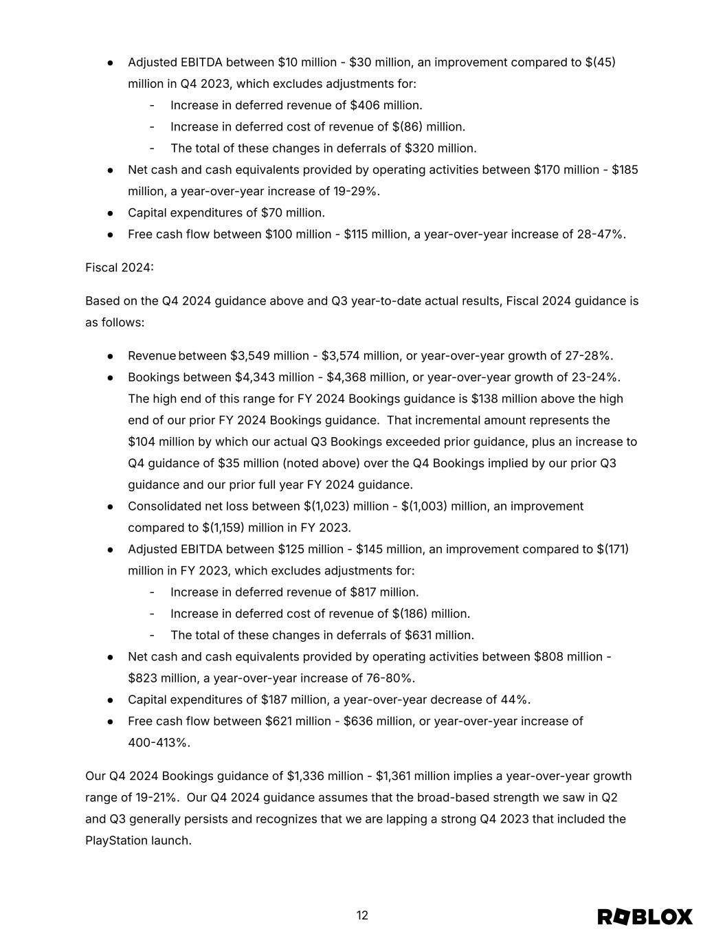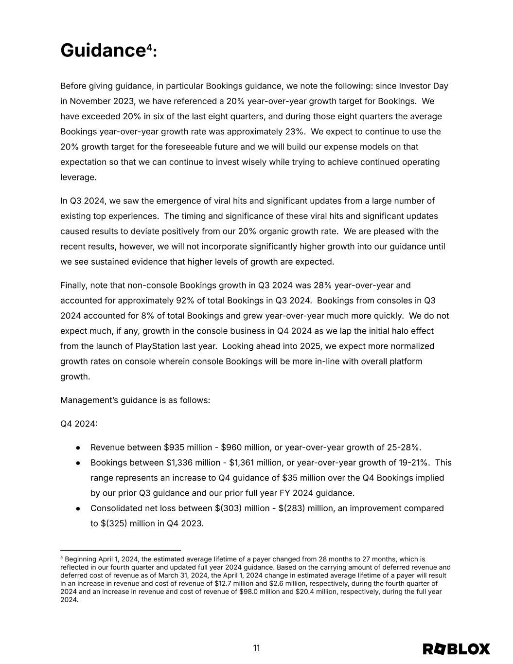 Guidance4: Before giving guidance, in particular Bookings guidance, we note the following: since Investor Day in November 2023, we have referenced a 20% year-over-year growth target for Bookings. We have exceeded 20% in six of the last eight quarters, and during those eight quarters the average Bookings year-over-year growth rate was approximately 23%. We expect to continue to use the 20% growth target for the foreseeable future and we will build our expense models on that expectation so that we can continue to invest wisely while trying to achieve continued operating leverage. In Q3 2024, we saw the emergence of viral hits and significant updates from a large number of existing top experiences. The timing and significance of these viral hits and significant updates caused results to deviate positively from our 20% organic growth rate. We are pleased with the recent results, however, we will not incorporate significantly higher growth into our guidance until we see sustained evidence that higher levels of growth are expected. Finally, note that non-console Bookings growth in Q3 2024 was 28% year-over-year and accounted for approximately 92% of total Bookings in Q3 2024. Bookings from consoles in Q3 2024 accounted for 8% of total Bookings and grew year-over-year much more quickly. We do not expect much, if any, growth in the console business in Q4 2024 as we lap the initial halo effect from the launch of PlayStation last year. Looking ahead into 2025, we expect more normalized growth rates on console wherein console Bookings will be more in-line with overall platform growth. Managementʼs guidance is as follows: Q4 2024 ● Revenue between $935 million - $960 million, or year-over-year growth of 2528%. ● Bookings between $1,336 million - $1,361 million, or year-over-year growth of 1921%. This range represents an increase to Q4 guidance of $35 million over the Q4 Bookings implied by our prior Q3 guidance and our prior full year FY 2024 guidance. ● Consolidated net loss between $303 million - $283 million, an improvement compared to $325 million in Q4 2023. 4 Beginning April 1, 2024, the estimated average lifetime of a payer changed from 28 months to 27 months, which is reflected in our fourth quarter and updated full year 2024 guidance. Based on the carrying amount of deferred revenue and deferred cost of revenue as of March 31, 2024, the April 1, 2024 change in estimated average lifetime of a payer will result in an increase in revenue and cost of revenue of $12.7 million and $2.6 million, respectively, during the fourth quarter of 2024 and an increase in revenue and cost of revenue of $98.0 million and $20.4 million, respectively, during the full year 2024. 11