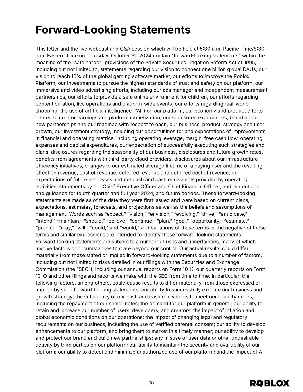 Forward-Looking Statements This letter and the live webcast and Q&A session which will be held at 530 a.m. Pacific Time/830 a.m. Eastern Time on Thursday, October 31, 2024 contain “forward-looking statementsˮ within the meaning of the “safe harborˮ provisions of the Private Securities Litigation Reform Act of 1995, including but not limited to, statements regarding our vision to connect one billion global DAUs, our vision to reach 10% of the global gaming software market, our efforts to improve the Roblox Platform, our investments to pursue the highest standards of trust and safety on our platform, our immersive and video advertising efforts, including our ads manager and independent measurement partnerships, our efforts to provide a safe online environment for children, our efforts regarding content curation, live operations and platform-wide events, our efforts regarding real-world shopping, the use of artificial intelligence (“AIˮ) on our platform, our economy and product efforts related to creator earnings and platform monetization, our sponsored experiences, branding and new partnerships and our roadmap with respect to each, our business, product, strategy and user growth, our investment strategy, including our opportunities for and expectations of improvements in financial and operating metrics, including operating leverage, margin, free cash flow, operating expenses and capital expenditures, our expectation of successfully executing such strategies and plans, disclosures regarding the seasonality of our business, disclosures and future growth rates, benefits from agreements with third-party cloud providers, disclosures about our infrastructure efficiency initiatives, changes to our estimated average lifetime of a paying user and the resulting effect on revenue, cost of revenue, deferred revenue and deferred cost of revenue, our expectations of future net losses and net cash and cash equivalents provided by operating activities, statements by our Chief Executive Officer and Chief Financial Officer, and our outlook and guidance for fourth quarter and full year 2024, and future periods. These forward-looking statements are made as of the date they were first issued and were based on current plans, expectations, estimates, forecasts, and projections as well as the beliefs and assumptions of management. Words such as “expect,ˮ “vision,ˮ “envision,ˮ “evolving,ˮ “drive,ˮ “anticipate,ˮ “intend,ˮ “maintain,ˮ “should,ˮ “believe,ˮ “continue,ˮ “plan,ˮ “goal,ˮ “opportunity,ˮ “estimate,ˮ “predict,ˮ “may,ˮ “will,ˮ “could,ˮ and “would,ˮ and variations of these terms or the negative of these terms and similar expressions are intended to identify these forward-looking statements. Forward-looking statements are subject to a number of risks and uncertainties, many of which involve factors or circumstances that are beyond our control. Our actual results could differ materially from those stated or implied in forward-looking statements due to a number of factors, including but not limited to risks detailed in our filings with the Securities and Exchange Commission (the “SECˮ), including our annual reports on Form 10K, our quarterly reports on Form 10Q and other filings and reports we make with the SEC from time to time. In particular, the following factors, among others, could cause results to differ materially from those expressed or implied by such forward-looking statements: our ability to successfully execute our business and growth strategy; the sufficiency of our cash and cash equivalents to meet our liquidity needs, including the repayment of our senior notes; the demand for our platform in general; our ability to retain and increase our number of users, developers, and creators; the impact of inflation and global economic conditions on our operations; the impact of changing legal and regulatory requirements on our business, including the use of verified parental consent; our ability to develop enhancements to our platform, and bring them to market in a timely manner; our ability to develop and protect our brand and build new partnerships; any misuse of user data or other undesirable activity by third parties on our platform; our ability to maintain the security and availability of our platform; our ability to detect and minimize unauthorized use of our platform; and the impact of AI 15