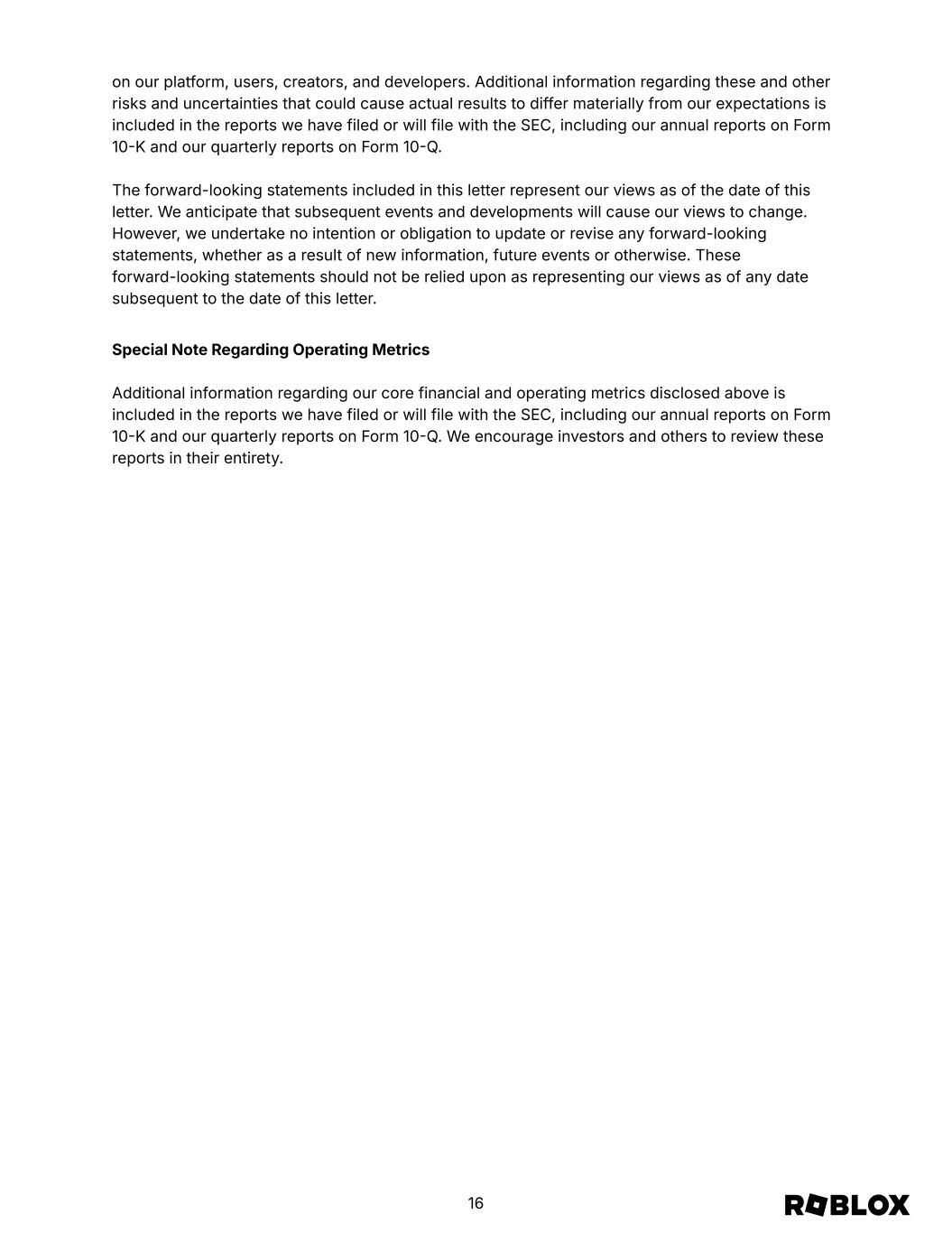on our platform, users, creators, and developers. Additional information regarding these and other risks and uncertainties that could cause actual results to differ materially from our expectations is included in the reports we have filed or will file with the SEC, including our annual reports on Form 10K and our quarterly reports on Form 10Q. The forward-looking statements included in this letter represent our views as of the date of this letter. We anticipate that subsequent events and developments will cause our views to change. However, we undertake no intention or obligation to update or revise any forward-looking statements, whether as a result of new information, future events or otherwise. These forward-looking statements should not be relied upon as representing our views as of any date subsequent to the date of this letter. Special Note Regarding Operating Metrics Additional information regarding our core financial and operating metrics disclosed above is included in the reports we have filed or will file with the SEC, including our annual reports on Form 10K and our quarterly reports on Form 10Q. We encourage investors and others to review these reports in their entirety. 16