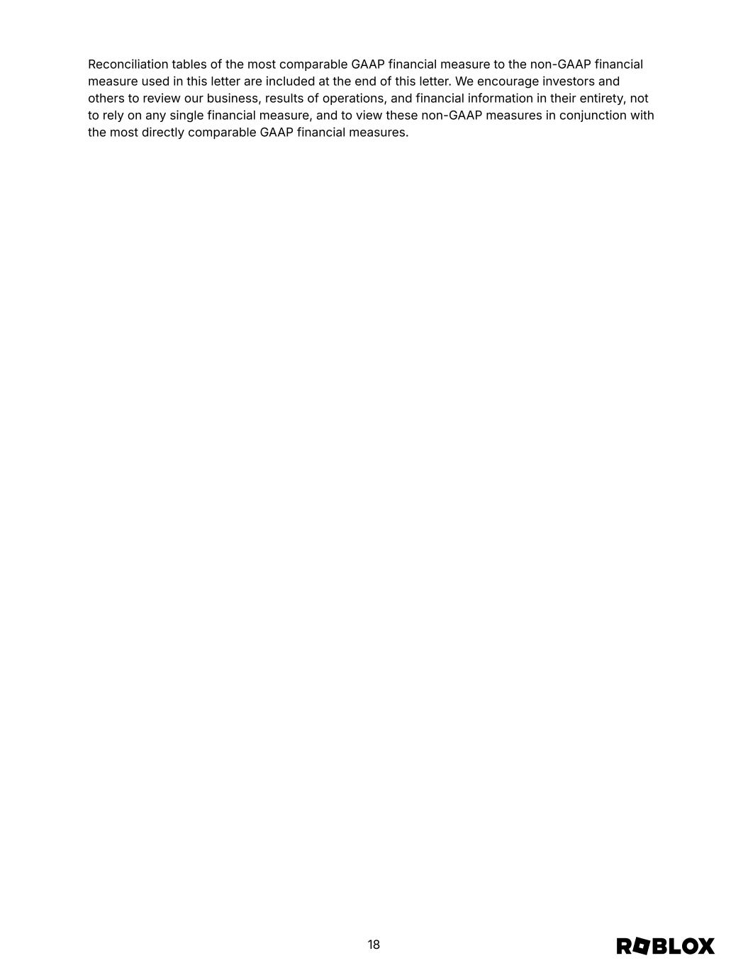 Non-GAAP Financial Measures This letter contains the non-GAAP financial measures Bookings, Adjusted EBITDA, and free cash flow. We use this non-GAAP financial information to evaluate our ongoing operations and for internal planning and forecasting purposes. We believe that this non-GAAP financial information may be helpful to investors because it provides consistency and comparability with past financial performance. Bookings is defined as revenue plus the change in deferred revenue during the period and other non-cash adjustments. Substantially all of our bookings are generated from sales of virtual currency, which can ultimately be converted to virtual items on the Roblox Platform. Sales of virtual currency reflected as bookings include one-time purchases and monthly subscriptions purchased via payment processors or through prepaid cards. Bookings also include an insignificant amount from advertising and licensing arrangements. We believe bookings provide a timelier indication of trends in our operating results that are not necessarily reflected in our revenue as a result of the fact that we recognize the majority of revenue over the estimated average lifetime of a paying user. The change in deferred revenue constitutes the vast majority of the reconciling difference from revenue to bookings. By removing these non-cash adjustments, we are able to measure and monitor our business performance based on the timing of actual transactions with our users and the cash that is generated from these transactions. Adjusted EBITDA represents our GAAP consolidated net loss, excluding interest income, interest expense, other income/(expense), provision for/(benefit from) income taxes, depreciation and amortization expense, stock-based compensation expense, and certain other nonrecurring adjustments. We believe that, when considered together with reported GAAP amounts, Adjusted EBITDA is useful to investors and management in understanding our ongoing operations and ongoing operating trends. Our definition of Adjusted EBITDA may differ from the definition used by other companies and therefore comparability may be limited. Free cash flow represents the net cash and cash equivalents provided by operating activities less purchases of property, equipment, and intangible assets acquired through asset acquisitions. We believe that free cash flow is a useful indicator of our unit economics and liquidity that provides information to management and investors about the amount of cash generated from our core operations that, after the purchases of property, equipment, and intangible assets acquired through asset acquisitions, can be used for strategic initiatives. Non-GAAP financial measures have limitations in their usefulness to investors because they have no standardized meaning prescribed by GAAP and are not prepared under any comprehensive set of accounting rules or principles. In addition, other companies, including companies in our industry, may calculate similarly titled non-GAAP financial measures differently or may use other measures to evaluate their performance, all of which could reduce the usefulness of our non-GAAP financial information as a tool for comparison. As a result, our non-GAAP financial information is presented for supplemental informational purposes only and should not be considered in isolation from, or as a substitute for financial information presented in accordance with GAAP. 17