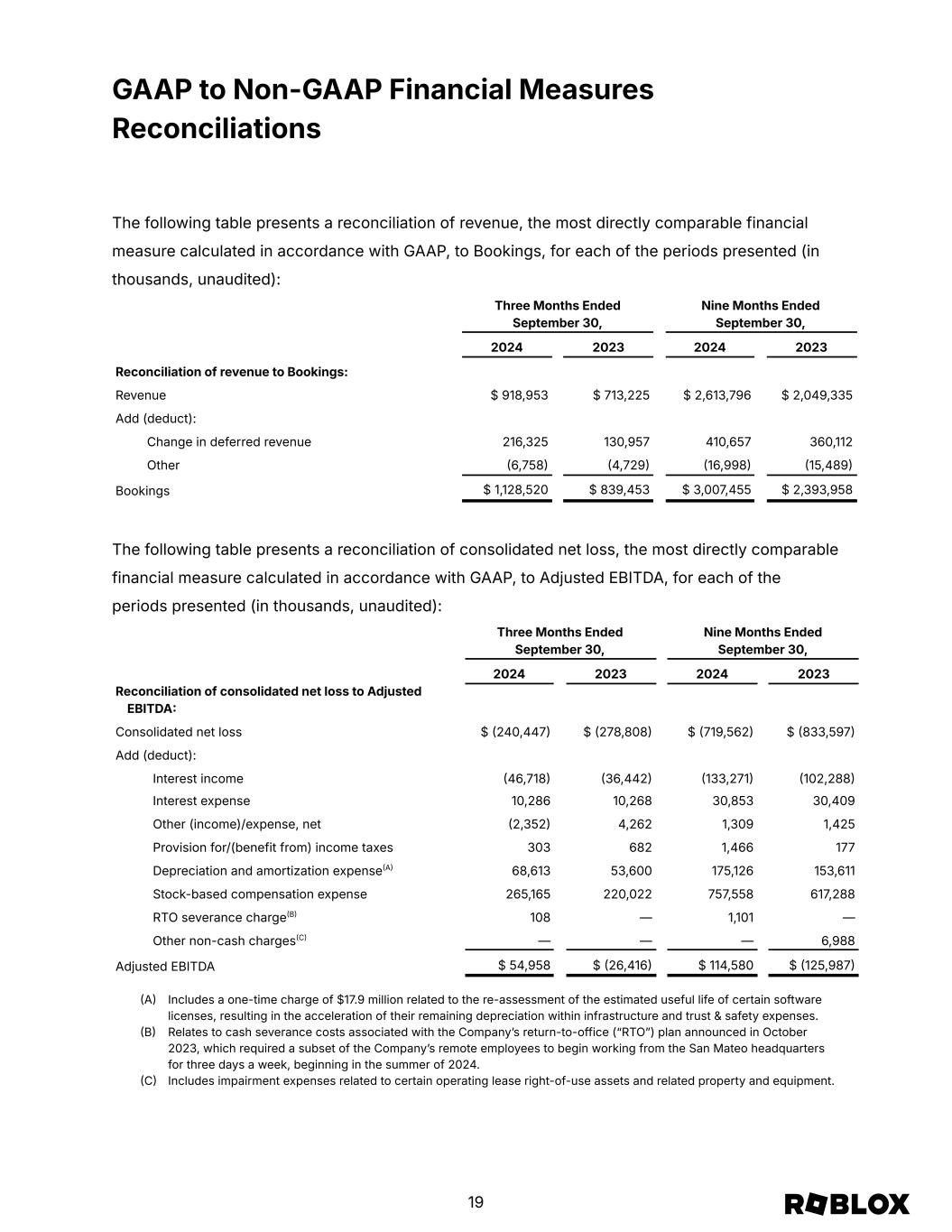 GAAP to Non-GAAP Financial Measures Reconciliations The following table presents a reconciliation of revenue, the most directly comparable financial measure calculated in accordance with GAAP, to Bookings, for each of the periods presented (in thousands, unaudited): Three Months Ended September 30, Nine Months Ended September 30, 2024 2023 2024 2023 Reconciliation of revenue to Bookings: Revenue $ 918,953 $ 713,225 $ 2,613,796 $ 2,049,335 Add (deduct): Change in deferred revenue 216,325 130,957 410,657 360,112 Other 6,758 4,729 16,998 15,489 Bookings $ 1,128,520 $ 839,453 $ 3,007,455 $ 2,393,958 The following table presents a reconciliation of consolidated net loss, the most directly comparable financial measure calculated in accordance with GAAP, to Adjusted EBITDA, for each of the periods presented (in thousands, unaudited): Three Months Ended September 30, Nine Months Ended September 30, 2024 2023 2024 2023 Reconciliation of consolidated net loss to Adjusted EBITDA Consolidated net loss $ 240,447 $ 278,808 $ 719,562 $ 833,597 Add (deduct): Interest income 46,718 36,442 133,271 102,288 Interest expense 10,286 10,268 30,853 30,409 Other (income)/expense, net 2,352 4,262 1,309 1,425 Provision for/(benefit from) income taxes 303 682 1,466 177 Depreciation and amortization expenseA 68,613 53,600 175,126 153,611 Stock-based compensation expense 265,165 220,022 757,558 617,288 RTO severance chargeB 108 — 1,101 — Other non-cash chargesC — — — 6,988 Adjusted EBITDA $ 54,958 $ 26,416 $ 114,580 $ 125,987 A Includes a one-time charge of $17.9 million related to the re-assessment of the estimated useful life of certain software licenses, resulting in the acceleration of their remaining depreciation within infrastructure and trust & safety expenses. B Relates to cash severance costs associated with the Companyʼs return-to-office (“RTOˮ) plan announced in October 2023, which required a subset of the Companyʼs remote employees to begin working from the San Mateo headquarters for three days a week, beginning in the summer of 2024. C Includes impairment expenses related to certain operating lease right-of-use assets and related property and equipment. 19
