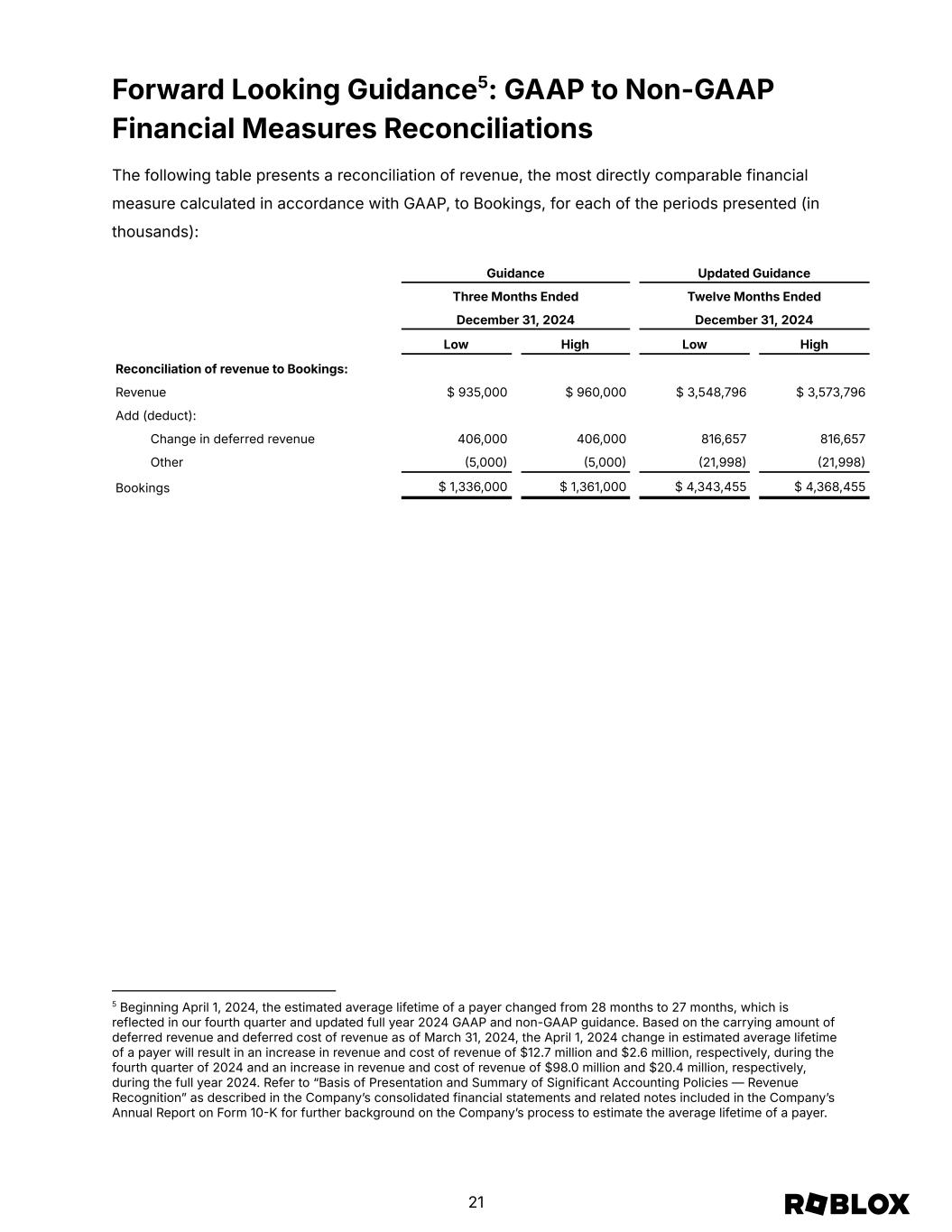 Forward Looking Guidance5: GAAP to Non-GAAP Financial Measures Reconciliations The following table presents a reconciliation of revenue, the most directly comparable financial measure calculated in accordance with GAAP, to Bookings, for each of the periods presented (in thousands): Guidance Updated Guidance Three Months Ended Twelve Months Ended December 31, 2024 December 31, 2024 Low High Low High Reconciliation of revenue to Bookings: Revenue $ 935,000 $ 960,000 $ 3,548,796 $ 3,573,796 Add (deduct): Change in deferred revenue 406,000 406,000 816,657 816,657 Other 5,000 5,000 21,998 21,998 Bookings $ 1,336,000 $ 1,361,000 $ 4,343,455 $ 4,368,455 5 Beginning April 1, 2024, the estimated average lifetime of a payer changed from 28 months to 27 months, which is reflected in our fourth quarter and updated full year 2024 GAAP and non-GAAP guidance. Based on the carrying amount of deferred revenue and deferred cost of revenue as of March 31, 2024, the April 1, 2024 change in estimated average lifetime of a payer will result in an increase in revenue and cost of revenue of $12.7 million and $2.6 million, respectively, during the fourth quarter of 2024 and an increase in revenue and cost of revenue of $98.0 million and $20.4 million, respectively, during the full year 2024. Refer to “Basis of Presentation and Summary of Significant Accounting Policies — Revenue Recognitionˮ as described in the Companyʼs consolidated financial statements and related notes included in the Companyʼs Annual Report on Form 10K for further background on the Companyʼs process to estimate the average lifetime of a payer. 21
