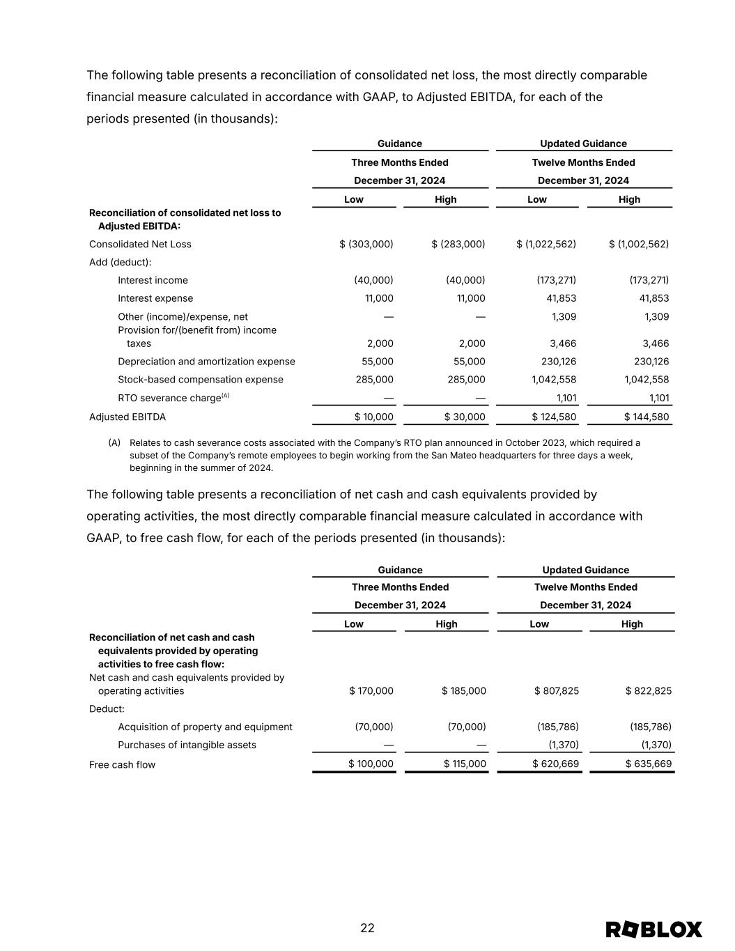 The following table presents a reconciliation of consolidated net loss, the most directly comparable financial measure calculated in accordance with GAAP, to Adjusted EBITDA, for each of the periods presented (in thousands): Guidance Updated Guidance Three Months Ended Twelve Months Ended December 31, 2024 December 31, 2024 Low High Low High Reconciliation of consolidated net loss to Adjusted EBITDA Consolidated Net Loss $ 303,000 $ 283,000 $ 1,022,562 $ 1,002,562 Add (deduct): Interest income 40,000 40,000 173,271 173,271 Interest expense 11,000 11,000 41,853 41,853 Other (income)/expense, net — — 1,309 1,309 Provision for/(benefit from) income taxes 2,000 2,000 3,466 3,466 Depreciation and amortization expense 55,000 55,000 230,126 230,126 Stock-based compensation expense 285,000 285,000 1,042,558 1,042,558 RTO severance chargeA — — 1,101 1,101 Adjusted EBITDA $ 10,000 $ 30,000 $ 124,580 $ 144,580 A Relates to cash severance costs associated with the Companyʼs RTO plan announced in October 2023, which required a subset of the Companyʼs remote employees to begin working from the San Mateo headquarters for three days a week, beginning in the summer of 2024. The following table presents a reconciliation of net cash and cash equivalents provided by operating activities, the most directly comparable financial measure calculated in accordance with GAAP, to free cash flow, for each of the periods presented (in thousands): Guidance Updated Guidance Three Months Ended Twelve Months Ended December 31, 2024 December 31, 2024 Low High Low High Reconciliation of net cash and cash equivalents provided by operating activities to free cash flow: Net cash and cash equivalents provided by operating activities $ 170,000 $ 185,000 $ 807,825 $ 822,825 Deduct: Acquisition of property and equipment 70,000 70,000 185,786 185,786 Purchases of intangible assets — — 1,370 1,370 Free cash flow $ 100,000 $ 115,000 $ 620,669 $ 635,669 22