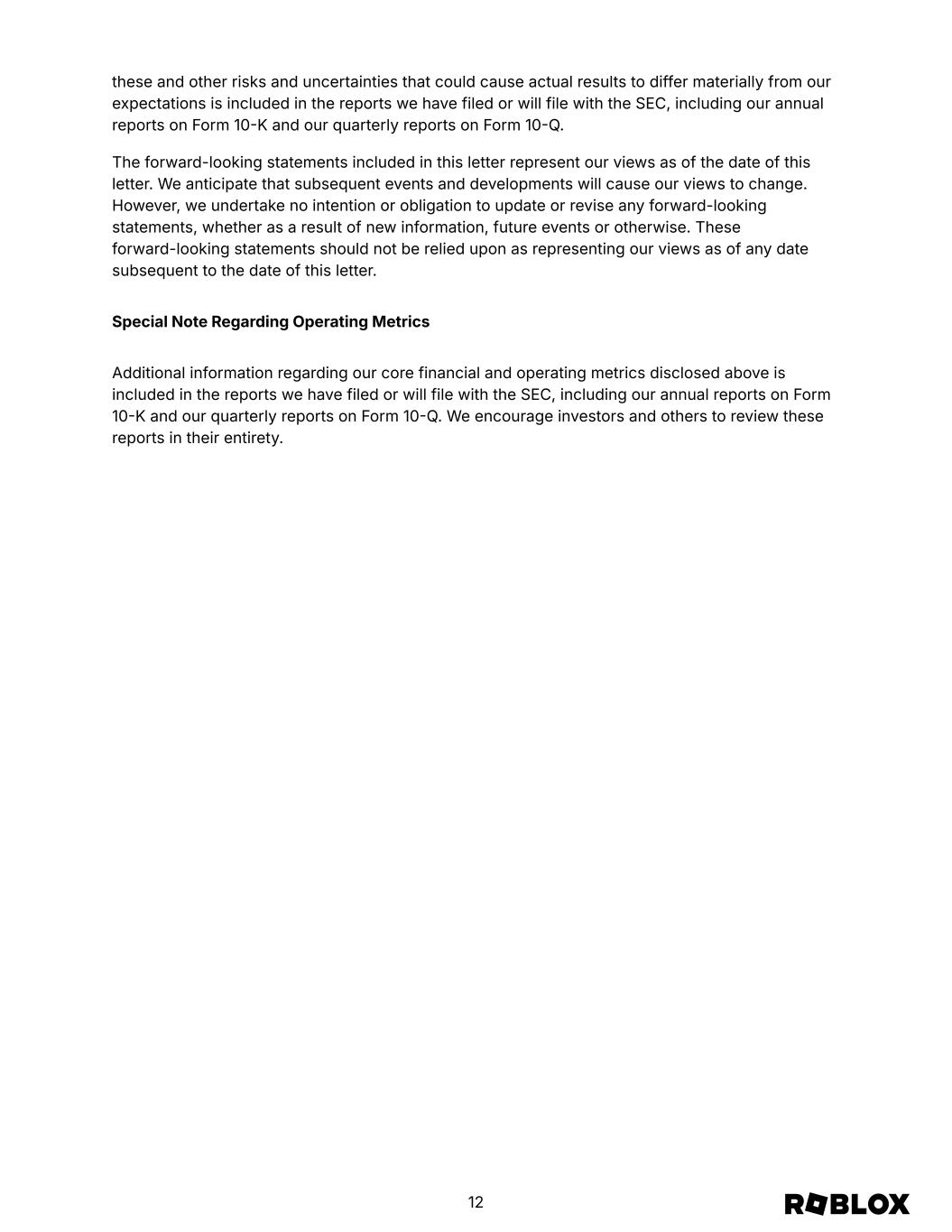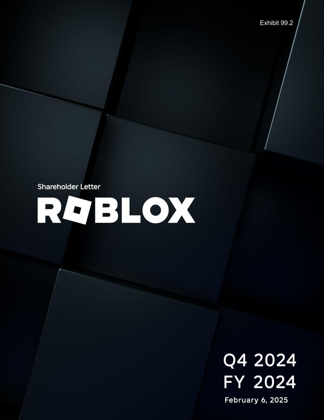 Forward-Looking Statements This letter and the live webcast and Q&A session which will be held at 530 a.m. Pacific Time/830 a.m. Eastern Time on Thursday, February 6, 2025 contain “forward-looking statementsˮ within the meaning of the “safe harborˮ provisions of the Private Securities Litigation Reform Act of 1995, including but not limited to, statements regarding our vision to connect one billion global DAUs, our vision to reach 10% of the global gaming content market, our efforts to improve the Roblox Platform, our investments to pursue the highest standards of trust and safety on our platform, our immersive advertising efforts, including our ads manager and independent measurement partnerships, our efforts to provide a safe online environment for children, our efforts regarding content curation, and live operations, our efforts regarding real world commerce, the use of AI on our platform, our economy and product efforts related to creator earnings and platform monetization, our sponsored experiences, branding and new partnerships and our roadmap with respect to each, our business, product, strategy and user growth, our investment strategy, including our opportunities for and expectations of improvements in financial and operating metrics, including operating leverage, margin, free cash flow, operating expenses and capital expenditures, our expectation of successfully executing such strategies and plans, disclosures regarding the seasonality of our business and future growth rates, benefits from agreements with third-party cloud providers, disclosures about our infrastructure efficiency initiatives, changes to our estimated average lifetime of a paying user and the resulting effect on revenue, cost of revenue, deferred revenue and deferred cost of revenue, our expectations of future net losses and net cash and cash equivalents provided by operating activities, statements by our Chief Executive Officer and Chief Financial Officer, and our outlook and guidance for the first quarter and full year 2025, and future periods. These forward-looking statements are made as of the date they were first issued and were based on current plans, expectations, estimates, forecasts, and projections as well as the beliefs and assumptions of management. Words such as “expect,ˮ “vision,ˮ “envision,ˮ “evolving,ˮ “drive,ˮ “anticipate,ˮ “intend,ˮ “maintain,ˮ “should,ˮ “believe,ˮ “continue,ˮ “plan,ˮ “goal,ˮ “opportunity,ˮ “estimate,ˮ “predict,ˮ “may,ˮ “will,ˮ “could,ˮ and “would,ˮ and variations of these terms or the negative of these terms and similar expressions are intended to identify these forward-looking statements. Forward-looking statements are subject to a number of risks and uncertainties, many of which involve factors or circumstances that are beyond our control. Our actual results could differ materially from those stated or implied in forward-looking statements due to a number of factors, including but not limited to risks detailed in our filings with the Securities and Exchange Commission (the “SECˮ), including our annual reports on Form 10K, our quarterly reports on Form 10Q and other filings and reports we make with the SEC from time to time. In particular, the following factors, among others, could cause results to differ materially from those expressed or implied by such forward-looking statements: our ability to successfully execute our business and growth strategy; the sufficiency of our cash and cash equivalents to meet our liquidity needs, including the repayment of our senior notes; the demand for our platform in general; our ability to retain and increase our number of users, developers, and creators; the impact of inflation and global economic conditions on our operations; the impact of changing legal and regulatory requirements on our business, including the use of verified parental consent; our ability to develop enhancements to our platform, and bring them to market in a timely manner; our ability to develop and protect our brand and build new partnerships; any misuse of user data or other undesirable activity by third parties on our platform; our ability to maintain the security and availability of our platform; our ability to detect and minimize unauthorized use of our platform; and the impact of AI on our platform, users, creators, and developers. Additional information regarding 11