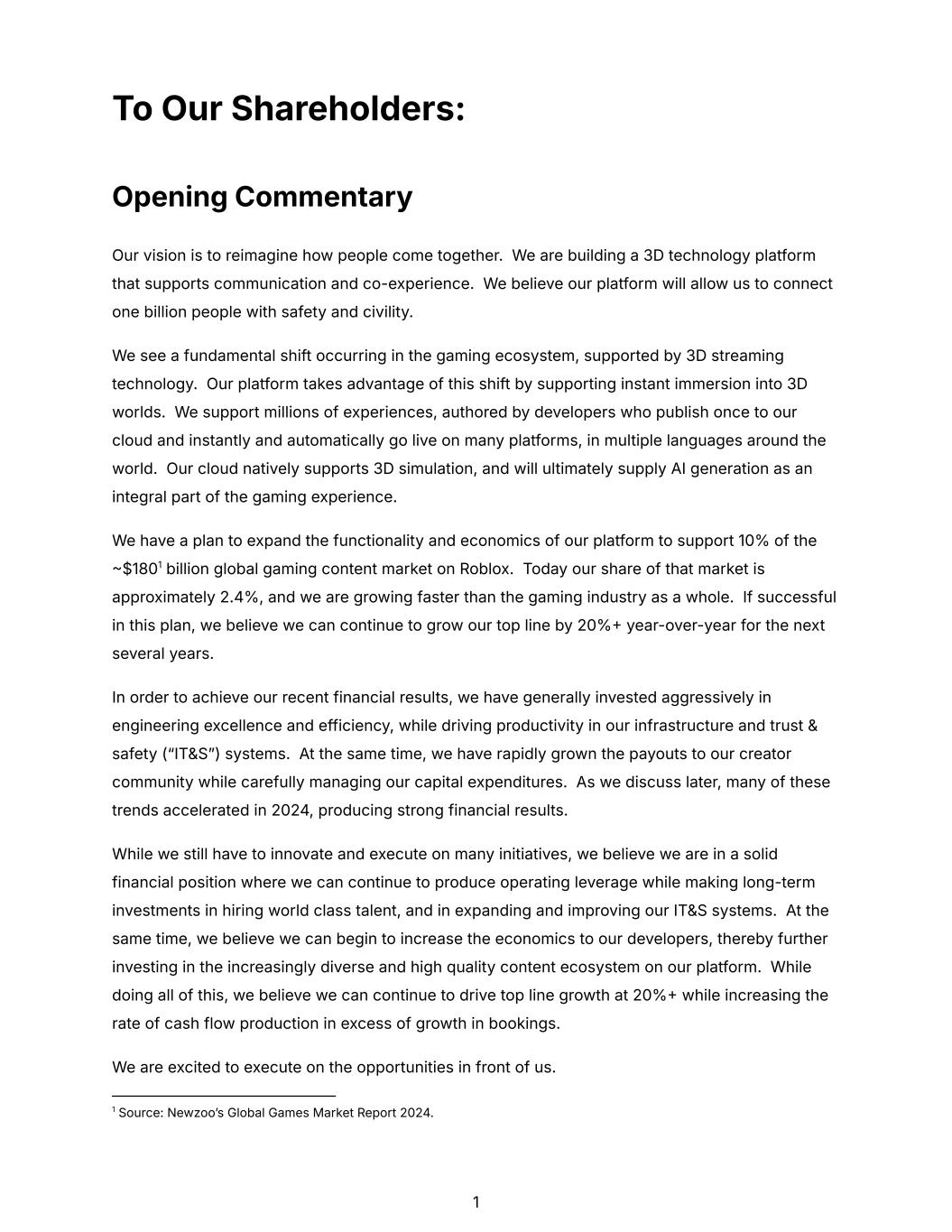 To Our Shareholders: Opening Commentary Our vision is to reimagine how people come together. We are building a 3D technology platform that supports communication and co-experience. We believe our platform will allow us to connect one billion people with safety and civility. We see a fundamental shift occurring in the gaming ecosystem, supported by 3D streaming technology. Our platform takes advantage of this shift by supporting instant immersion into 3D worlds. We support millions of experiences, authored by developers who publish once to our cloud and instantly and automatically go live on many platforms, in multiple languages around the world. Our cloud natively supports 3D simulation, and will ultimately supply AI generation as an integral part of the gaming experience. We have a plan to expand the functionality and economics of our platform to support 10% of the $1801 billion global gaming content market on Roblox. Today our share of that market is approximately 2.4%, and we are growing faster than the gaming industry as a whole. If successful in this plan, we believe we can continue to grow our top line by 20% year-over-year for the next several years. In order to achieve our recent financial results, we have generally invested aggressively in engineering excellence and efficiency, while driving productivity in our infrastructure and trust & safety (“IT&Sˮ) systems. At the same time, we have rapidly grown the payouts to our creator community while carefully managing our capital expenditures. As we discuss later, many of these trends accelerated in 2024, producing strong financial results. While we still have to innovate and execute on many initiatives, we believe we are in a solid financial position where we can continue to produce operating leverage while making long-term investments in hiring world class talent, and in expanding and improving our IT&S systems. At the same time, we believe we can begin to increase the economics to our developers, thereby further investing in the increasingly diverse and high quality content ecosystem on our platform. While doing all of this, we believe we can continue to drive top line growth at 20% while increasing the rate of cash flow production in excess of growth in bookings. We are excited to execute on the opportunities in front of us. 1 Source: Newzooʼs Global Games Market Report 2024. 1