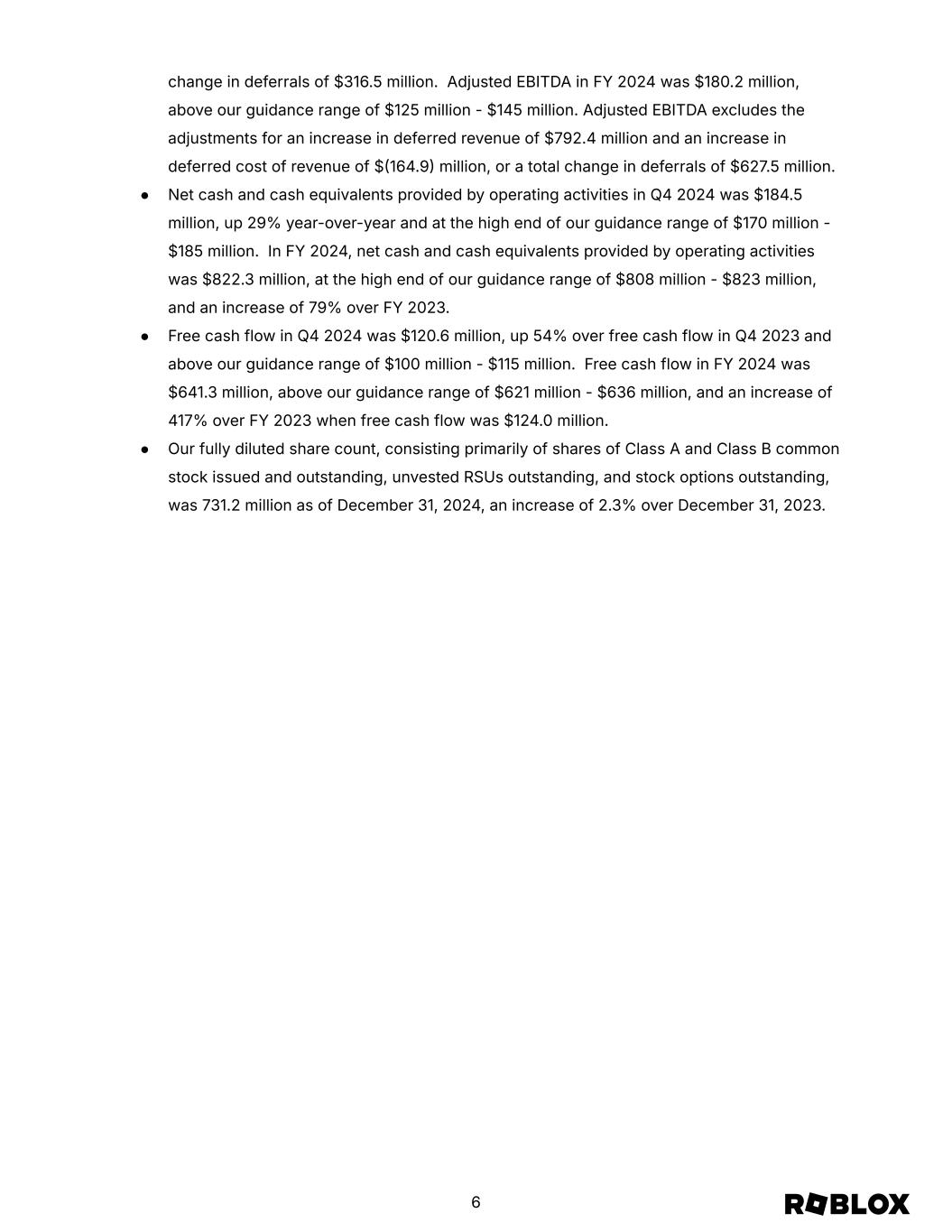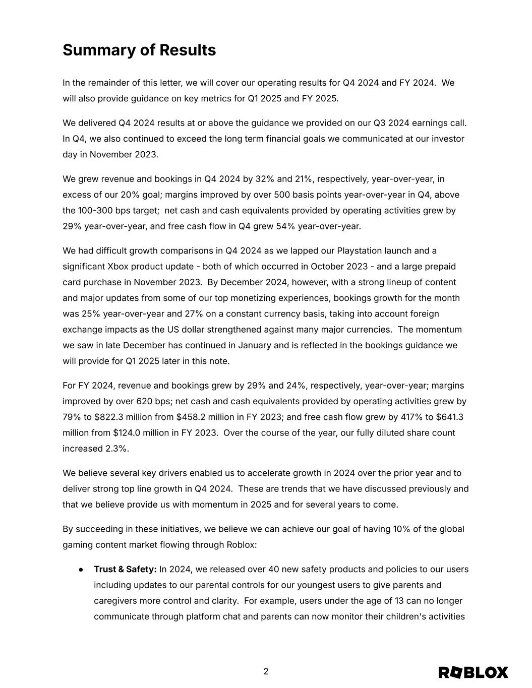Summary of Results In the remainder of this letter, we will cover our operating results for Q4 2024 and FY 2024. We will also provide guidance on key metrics for Q1 2025 and FY 2025. We delivered Q4 2024 results at or above the guidance we provided on our Q3 2024 earnings call. In Q4, we also continued to exceed the long term financial goals we communicated at our investor day in November 2023. We grew revenue and bookings in Q4 2024 by 32% and 21%, respectively, year-over-year, in excess of our 20% goal; margins improved by over 500 basis points year-over-year in Q4, above the 100300 bps target; net cash and cash equivalents provided by operating activities grew by 29% year-over-year, and free cash flow in Q4 grew 54% year-over-year. We had difficult growth comparisons in Q4 2024 as we lapped our Playstation launch and a significant Xbox product update - both of which occurred in October 2023 - and a large prepaid card purchase in November 2023. By December 2024, however, with a strong lineup of content and major updates from some of our top monetizing experiences, bookings growth for the month was 25% year-over-year and 27% on a constant currency basis, taking into account foreign exchange impacts as the US dollar strengthened against many major currencies. The momentum we saw in late December has continued in January and is reflected in the bookings guidance we will provide for Q1 2025 later in this note. For FY 2024, revenue and bookings grew by 29% and 24%, respectively, year-over-year; margins improved by over 620 bps; net cash and cash equivalents provided by operating activities grew by 79% to $822.3 million from $458.2 million in FY 2023; and free cash flow grew by 417% to $641.3 million from $124.0 million in FY 2023. Over the course of the year, our fully diluted share count increased 2.3%. We believe several key drivers enabled us to accelerate growth in 2024 over the prior year and to deliver strong top line growth in Q4 2024. These are trends that we have discussed previously and that we believe provide us with momentum in 2025 and for several years to come. By succeeding in these initiatives, we believe we can achieve our goal of having 10% of the global gaming content market flowing through Roblox: ● Trust & Safety: In 2024, we released over 40 new safety products and policies to our users including updates to our parental controls for our youngest users to give parents and caregivers more control and clarity. For example, users under the age of 13 can no longer communicate through platform chat and parents can now monitor their children's activities 2