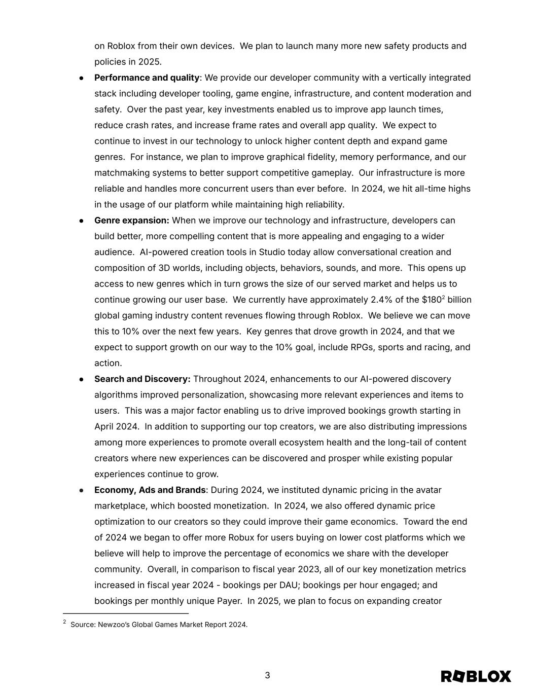 on Roblox from their own devices. We plan to launch many more new safety products and policies in 2025. ● Performance and quality: We provide our developer community with a vertically integrated stack including developer tooling, game engine, infrastructure, and content moderation and safety. Over the past year, key investments enabled us to improve app launch times, reduce crash rates, and increase frame rates and overall app quality. We expect to continue to invest in our technology to unlock higher content depth and expand game genres. For instance, we plan to improve graphical fidelity, memory performance, and our matchmaking systems to better support competitive gameplay. Our infrastructure is more reliable and handles more concurrent users than ever before. In 2024, we hit all-time highs in the usage of our platform while maintaining high reliability. ● Genre expansion: When we improve our technology and infrastructure, developers can build better, more compelling content that is more appealing and engaging to a wider audience. AI-powered creation tools in Studio today allow conversational creation and composition of 3D worlds, including objects, behaviors, sounds, and more. This opens up access to new genres which in turn grows the size of our served market and helps us to continue growing our user base. We currently have approximately 2.4% of the $1802 billion global gaming industry content revenues flowing through Roblox. We believe we can move this to 10% over the next few years. Key genres that drove growth in 2024, and that we expect to support growth on our way to the 10% goal, include RPGs, sports and racing, and action. ● Search and Discovery: Throughout 2024, enhancements to our AI-powered discovery algorithms improved personalization, showcasing more relevant experiences and items to users. This was a major factor enabling us to drive improved bookings growth starting in April 2024. In addition to supporting our top creators, we are also distributing impressions among more experiences to promote overall ecosystem health and the long-tail of content creators where new experiences can be discovered and prosper while existing popular experiences continue to grow. ● Economy, Ads and Brands: During 2024, we instituted dynamic pricing in the avatar marketplace, which boosted monetization. In 2024, we also offered dynamic price optimization to our creators so they could improve their game economics. Toward the end of 2024 we began to offer more Robux for users buying on lower cost platforms which we believe will help to improve the percentage of economics we share with the developer community. Overall, in comparison to fiscal year 2023, all of our key monetization metrics increased in fiscal year 2024 - bookings per DAU; bookings per hour engaged; and bookings per monthly unique Payer. In 2025, we plan to focus on expanding creator 2 Source: Newzooʼs Global Games Market Report 2024. 3