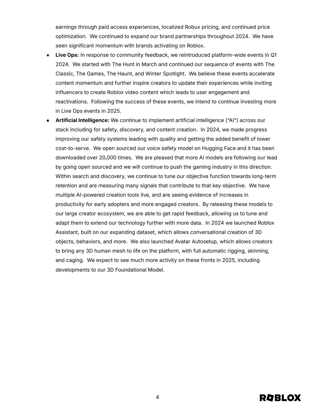 earnings through paid access experiences, localized Robux pricing, and continued price optimization. We continued to expand our brand partnerships throughout 2024. We have seen significant momentum with brands activating on Roblox. ● Live Ops: In response to community feedback, we reintroduced platform-wide events in Q1 2024. We started with The Hunt in March and continued our sequence of events with The Classic, The Games, The Haunt, and Winter Spotlight. We believe these events accelerate content momentum and further inspire creators to update their experiences while inviting influencers to create Roblox video content which leads to user engagement and reactivations. Following the success of these events, we intend to continue investing more in Live Ops events in 2025. ● Artificial Intelligence: We continue to implement artificial intelligence (“AIˮ) across our stack including for safety, discovery, and content creation. In 2024, we made progress improving our safety systems leading with quality and getting the added benefit of lower cost-to-serve. We open sourced our voice safety model on Hugging Face and it has been downloaded over 20,000 times. We are pleased that more AI models are following our lead by going open sourced and we will continue to push the gaming industry in this direction. Within search and discovery, we continue to tune our objective function towards long-term retention and are measuring many signals that contribute to that key objective. We have multiple AI-powered creation tools live, and are seeing evidence of increases in productivity for early adopters and more engaged creators. By releasing these models to our large creator ecosystem, we are able to get rapid feedback, allowing us to tune and adapt them to extend our technology further with more data. In 2024 we launched Roblox Assistant, built on our expanding dataset, which allows conversational creation of 3D objects, behaviors, and more. We also launched Avatar Autosetup, which allows creators to bring any 3D human mesh to life on the platform, with full automatic rigging, skinning, and caging. We expect to see much more activity on these fronts in 2025, including developments to our 3D Foundational Model. 4