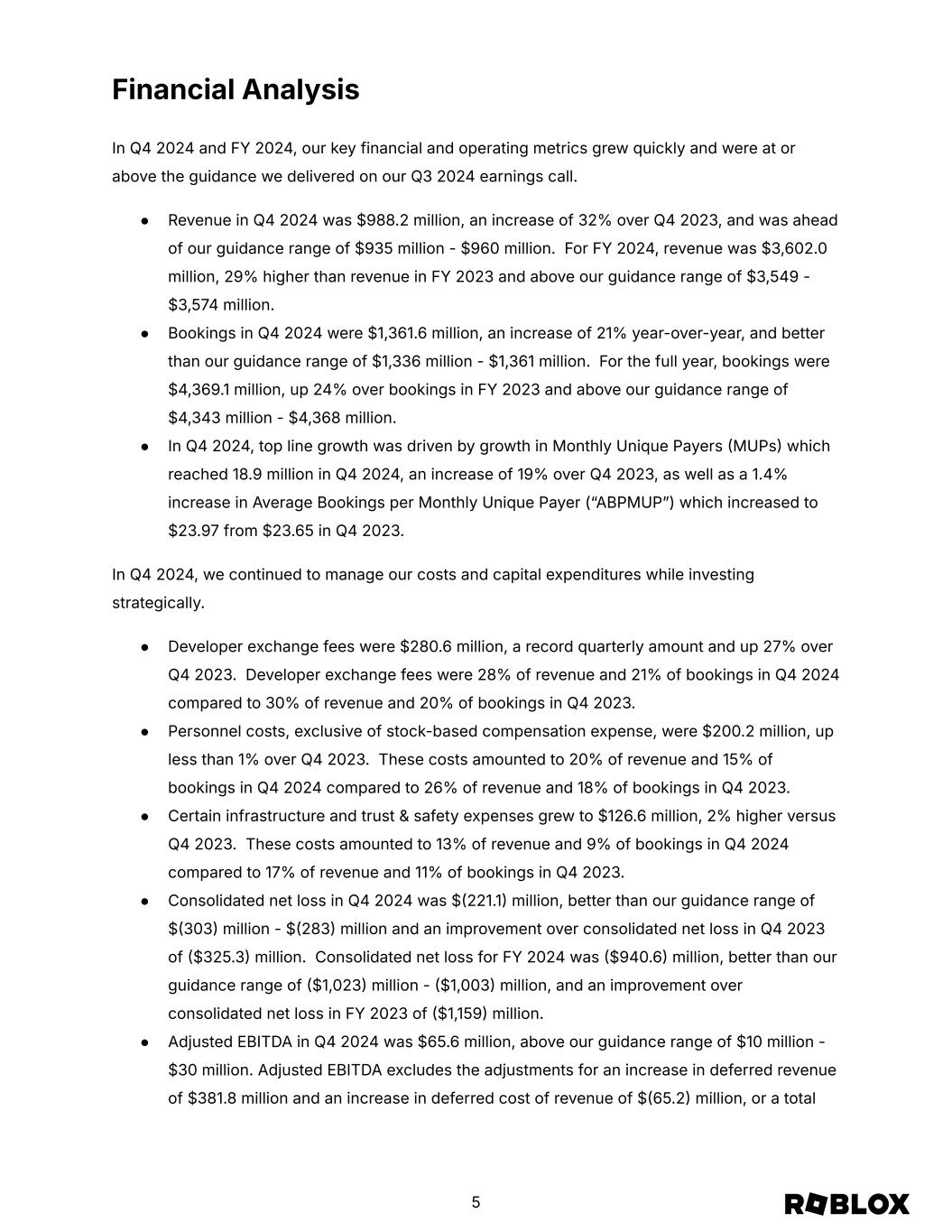 Financial Analysis In Q4 2024 and FY 2024, our key financial and operating metrics grew quickly and were at or above the guidance we delivered on our Q3 2024 earnings call. ● Revenue in Q4 2024 was $988.2 million, an increase of 32% over Q4 2023, and was ahead of our guidance range of $935 million - $960 million. For FY 2024, revenue was $3,602.0 million, 29% higher than revenue in FY 2023 and above our guidance range of $3,549 - $3,574 million. ● Bookings in Q4 2024 were $1,361.6 million, an increase of 21% year-over-year, and better than our guidance range of $1,336 million - $1,361 million. For the full year, bookings were $4,369.1 million, up 24% over bookings in FY 2023 and above our guidance range of $4,343 million - $4,368 million. ● In Q4 2024, top line growth was driven by growth in Monthly Unique Payers MUPs which reached 18.9 million in Q4 2024, an increase of 19% over Q4 2023, as well as a 1.4% increase in Average Bookings per Monthly Unique Payer (“ABPMUPˮ) which increased to $23.97 from $23.65 in Q4 2023. In Q4 2024, we continued to manage our costs and capital expenditures while investing strategically. ● Developer exchange fees were $280.6 million, a record quarterly amount and up 27% over Q4 2023. Developer exchange fees were 28% of revenue and 21% of bookings in Q4 2024 compared to 30% of revenue and 20% of bookings in Q4 2023. ● Personnel costs, exclusive of stock-based compensation expense, were $200.2 million, up less than 1% over Q4 2023. These costs amounted to 20% of revenue and 15% of bookings in Q4 2024 compared to 26% of revenue and 18% of bookings in Q4 2023. ● Certain infrastructure and trust & safety expenses grew to $126.6 million, 2% higher versus Q4 2023. These costs amounted to 13% of revenue and 9% of bookings in Q4 2024 compared to 17% of revenue and 11% of bookings in Q4 2023. ● Consolidated net loss in Q4 2024 was $221.1 million, better than our guidance range of $303 million - $283 million and an improvement over consolidated net loss in Q4 2023 of $325.3 million. Consolidated net loss for FY 2024 was $940.6 million, better than our guidance range of $1,023 million - $1,003 million, and an improvement over consolidated net loss in FY 2023 of $1,159 million. ● Adjusted EBITDA in Q4 2024 was $65.6 million, above our guidance range of $10 million - $30 million. Adjusted EBITDA excludes the adjustments for an increase in deferred revenue of $381.8 million and an increase in deferred cost of revenue of $65.2 million, or a total 5