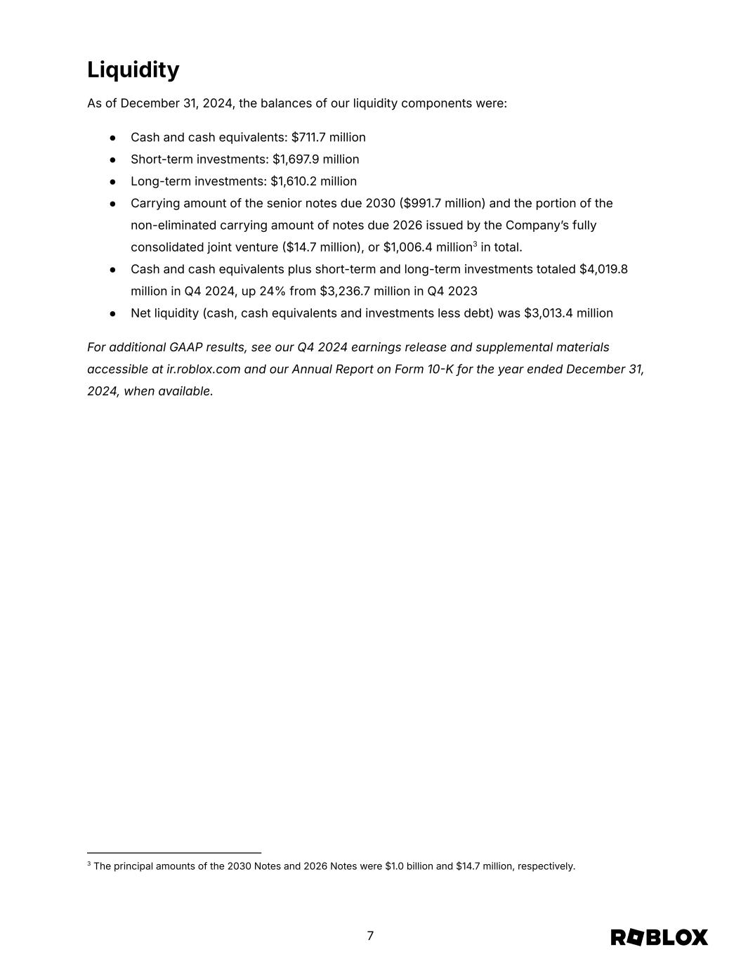 Liquidity As of December 31, 2024, the balances of our liquidity components were: ● Cash and cash equivalents: $711.7 million ● Short-term investments: $1,697.9 million ● Long-term investments: $1,610.2 million ● Carrying amount of the senior notes due 2030 $991.7 million) and the portion of the non-eliminated carrying amount of notes due 2026 issued by the Companyʼs fully consolidated joint venture $14.7 million), or $1,006.4 million3 in total. ● Cash and cash equivalents plus short-term and long-term investments totaled $4,019.8 million in Q4 2024, up 24% from $3,236.7 million in Q4 2023 ● Net liquidity (cash, cash equivalents and investments less debt) was $3,013.4 million For additional GAAP results, see our Q4 2024 earnings release and supplemental materials accessible at ir.roblox.com and our Annual Report on Form 10K for the year ended December 31, 2024, when available. 3 The principal amounts of the 2030 Notes and 2026 Notes were $1.0 billion and $14.7 million, respectively. 7