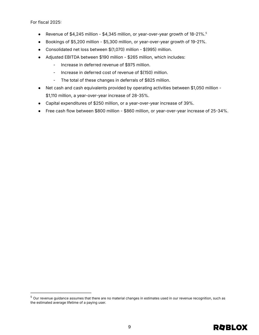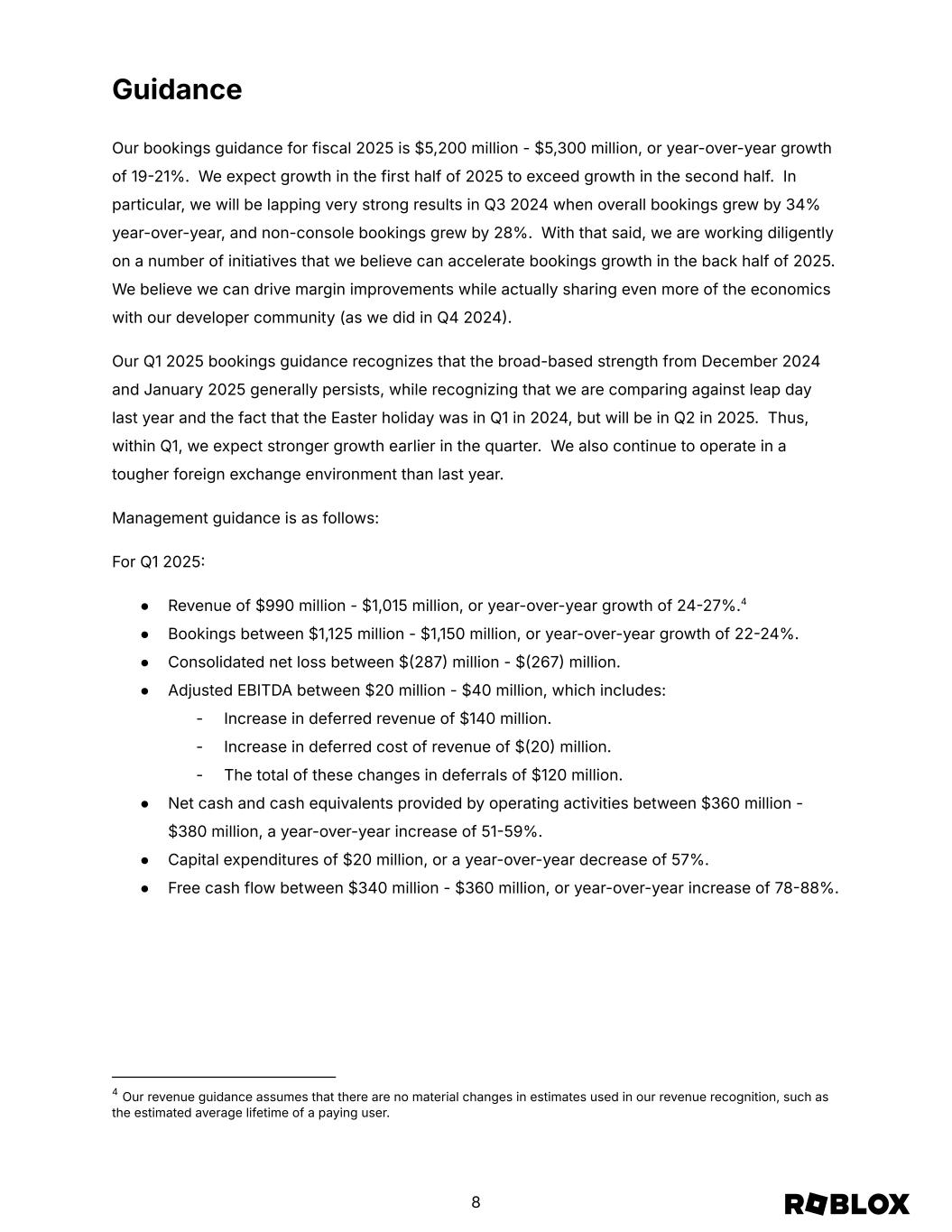 Guidance Our bookings guidance for fiscal 2025 is $5,200 million - $5,300 million, or year-over-year growth of 1921%. We expect growth in the first half of 2025 to exceed growth in the second half. In particular, we will be lapping very strong results in Q3 2024 when overall bookings grew by 34% year-over-year, and non-console bookings grew by 28%. With that said, we are working diligently on a number of initiatives that we believe can accelerate bookings growth in the back half of 2025. We believe we can drive margin improvements while actually sharing even more of the economics with our developer community (as we did in Q4 2024. Our Q1 2025 bookings guidance recognizes that the broad-based strength from December 2024 and January 2025 generally persists, while recognizing that we are comparing against leap day last year and the fact that the Easter holiday was in Q1 in 2024, but will be in Q2 in 2025. Thus, within Q1, we expect stronger growth earlier in the quarter. We also continue to operate in a tougher foreign exchange environment than last year. Management guidance is as follows: For Q1 2025 ● Revenue of $990 million - $1,015 million, or year-over-year growth of 2427%.4 ● Bookings between $1,125 million - $1,150 million, or year-over-year growth of 2224%. ● Consolidated net loss between $287 million - $267 million. ● Adjusted EBITDA between $20 million - $40 million, which includes: - Increase in deferred revenue of $140 million. - Increase in deferred cost of revenue of $20 million. - The total of these changes in deferrals of $120 million. ● Net cash and cash equivalents provided by operating activities between $360 million - $380 million, a year-over-year increase of 5159%. ● Capital expenditures of $20 million, or a year-over-year decrease of 57%. ● Free cash flow between $340 million - $360 million, or year-over-year increase of 7888%. 4 Our revenue guidance assumes that there are no material changes in estimates used in our revenue recognition, such as the estimated average lifetime of a paying user. 8